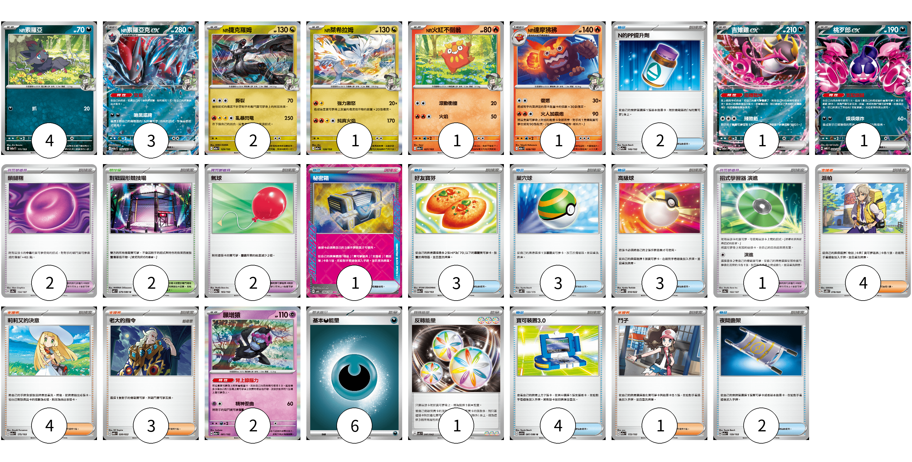 牌組構築方案 以此牌組為基礎新構築牌組 顯示卡面 顯示列表 寶可夢卡(16) 4 3 2 1 1 1 1 1 2 寶可夢道具(5) 2 2 1 物品卡(18) 2 1 3 3 3 4 2 支援者卡(12) 4 4 3 1 競技場卡(2) 2 能量卡(7) 6 1 寶可夢卡(16) 卡牌名稱 張數 卡牌名稱 張數 N的索羅亞 M2a 111/193 04 N的索羅亞克ex M2a 112/193 03 N的捷克羅姆 M2a 129/193 02 N的萊希拉姆 M2a 128/193 01 N的火紅不倒翁 M2a 027/193 01 N的達摩狒狒 M2a 028/193 01 吉雉雞ex M2a 114/193 01 桃歹郎ex MBG 009/022 01 願增猿 M2a 081/193 02 寶可夢道具(5) 卡牌名稱 張數 卡牌名稱 張數 鎖鏈糬 SV8a 154/187 02 氣球 M2a 165/193 02 招式學習器 演進 SV8a 160/187 01 物品卡(18) 卡牌名稱 張數 卡牌名稱 張數 N的PP提升劑 M2a 146/193 02 秘密箱 SV6 092/101 01 好友寶芬 M2a 153/193 03 巢穴球 SVM 133/175 03 高級球 MBD 014/022 03 寶可裝置3.0 SV11B 081/086 04 夜間擔架 M2a 159/193 02 支援者卡(12) 卡牌名稱 張數 卡牌名稱 張數 派帕 SVOD 018/020 04 莉莉艾的決意 M2a 175/193 04 老大的指令 MBD 020/022 03 鬥子 M2a 172/193 01 競技場卡(2) 卡牌名稱 張數 卡牌名稱 張數 對戰圓形競技場 M2 079/080 02 能量卡(7) 卡牌名稱 張數 卡牌名稱 張數 基本【惡】能量 MBG DAR 06 反轉能量 SVK 041/042 01 以此牌組為基礎新構築牌組 牌組編碼 oFCXad-FuoWzT-oRlLRF copy 列印牌組單 牌組編碼已複製 分享至SNS