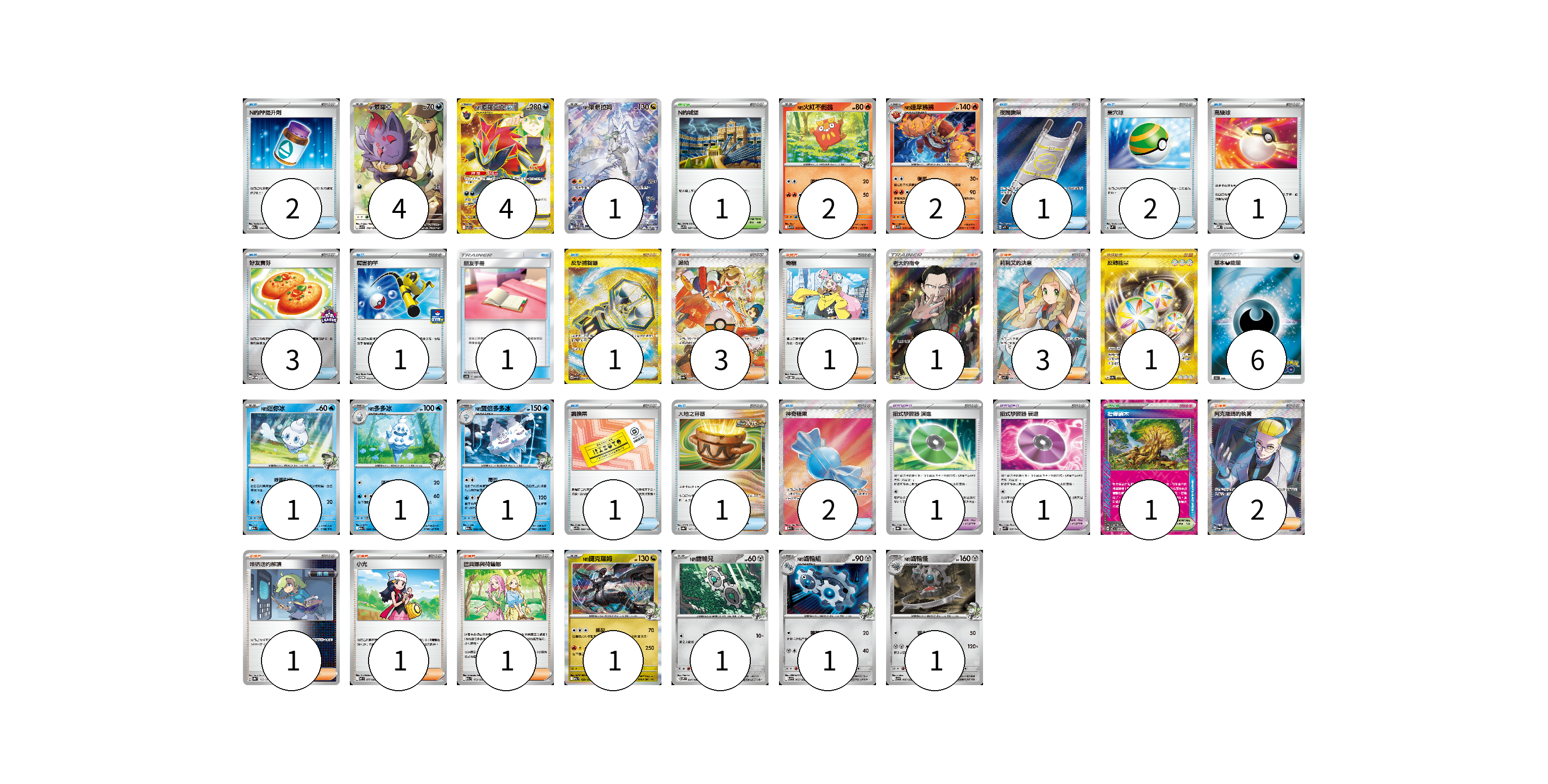 牌組構築方案 以此牌組為基礎新構築牌組 顯示卡面 顯示列表 寶可夢卡(20) 4 4 1 2 2 1 1 1 1 1 1 1 寶可夢道具(2) 1 1 物品卡(16) 2 1 2 1 3 1 1 1 1 1 2 支援者卡(13) 3 1 1 3 2 1 1 1 競技場卡(2) 1 1 能量卡(7) 1 6 寶可夢卡(20) 卡牌名稱 張數 卡牌名稱 張數 N的索羅亞 SV9 108/100 04 N的索羅亞克ex SV9 131/100 04 N的萊希拉姆 SV9 109/100 01 N的火紅不倒翁 SV9 015/100 02 N的達摩狒狒 SV9 016/100 02 N的迷你冰 M2a 037/193 01 N的多多冰 M2a 038/193 01 N的雙倍多多冰 M2a 039/193 01 N的捷克羅姆 M2a 129/193 01 N的齒輪兒 SV9 064/100 01 N的齒輪組 SV9 065/100 01 N的齒輪怪 SV9 066/100 01 寶可夢道具(2) 卡牌名稱 張數 卡牌名稱 張數 招式學習器 演進 SV8a 160/187 01 招式學習器 衰退 SVK 026/042 01 物品卡(16) 卡牌名稱 張數 卡牌名稱 張數 N的PP提升劑 M2a 146/193 02 夜間擔架 M1L 083/063 01 巢穴球 SVM 133/175 02 高級球 MBD 014/022 01 好友寶芬 SV-P 230/SV-P 03 厲害釣竿 SV-P 112/SV-P 01 朋友手冊 AS6b 188/194 01 反擊捕捉器 SV4M 094/066 01 調換票 SV9 090/100 01 大地之容器 SV8a 143/187 01 神奇糖果 M1S 082/063 02 支援者卡(13) 卡牌名稱 張數 卡牌名稱 張數 派帕 SV4a 353/190 03 奇樹 SVOD 016/020 01 老大的指令(坂木) SC1b 170/153 01 莉莉艾的決意 M1L 086/063 03 阿克羅瑪的執著 SV6a 083/064 02 暗碼迷的解讀 SV8a 165/187 01 小光 M2 077/080 01 巴貝娜與荷蓮娜 M2a 173/193 01 競技場卡(2) 卡牌名稱 張數 卡牌名稱 張數 N的城堡 SV9 097/100 01 壯偉碩木 SV7 101/102 01 能量卡(7) 卡牌名稱 張數 卡牌名稱 張數 反轉能量 SV3a 092/062 01 基本惡能量 S10b DAR 06 以此牌組為基礎新構築牌組 牌組編碼 oFRtbS-TuSIwn-UBhgpD copy 列印牌組單 牌組編碼已複製 分享至SNS