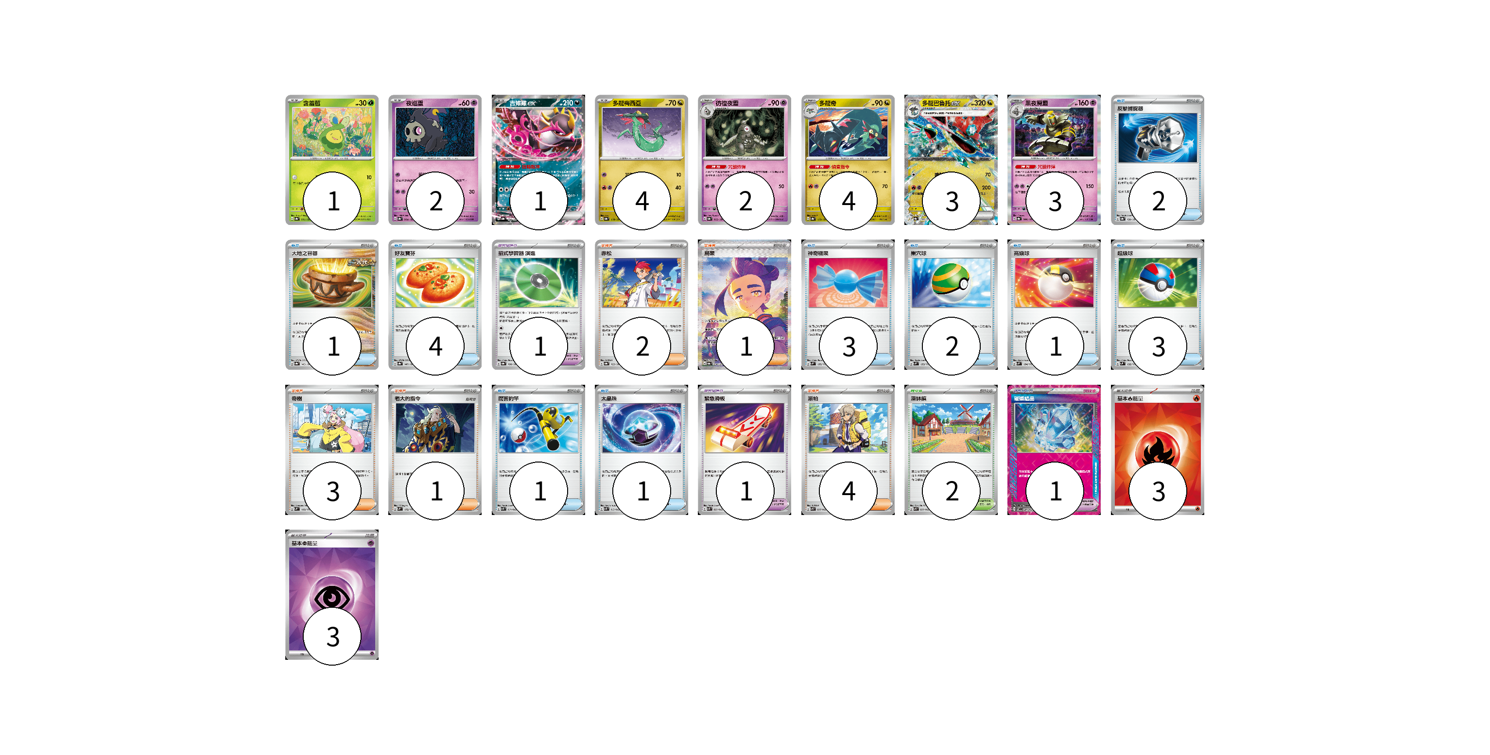 牌組構築方案 以此牌組為基礎新構築牌組 顯示卡面 顯示列表 寶可夢卡(20) 1 2 1 4 2 4 3 3 寶可夢道具(3) 1 1 1 物品卡(18) 2 1 4 3 2 1 3 1 1 支援者卡(11) 2 1 3 1 4 競技場卡(2) 2 能量卡(6) 3 3 寶可夢卡(20) 卡牌名稱 張數 卡牌名稱 張數 含羞苞 SV8a 001/187 01 夜巡靈 SV8a 064/187 02 吉雉雞ex SV8a 104/187 01 多龍梅西亞 SV8a 118/187 04 彷徨夜靈 SV8a 065/187 02 多龍奇 SV8a 119/187 04 多龍巴魯托ex SV8a 120/187 03 黑夜魔靈 SV8a 066/187 03 寶可夢道具(3) 卡牌名稱 張數 卡牌名稱 張數 招式學習器 演進 SV8a 160/187 01 緊急滑板 SVK 023/042 01 璀璨結晶 SV7 094/102 01 物品卡(18) 卡牌名稱 張數 卡牌名稱 張數 反擊捕捉器 SV8a 139/187 02 大地之容器 SV8a 143/187 01 好友寶芬 SV8a 147/187 04 神奇糖果 SVM 135/175 03 巢穴球 SVM 133/175 02 高級球 SVM 134/175 01 超級球 SVM 132/175 03 厲害釣竿 SVK 011/042 01 太晶珠 SVK 013/042 01 支援者卡(11) 卡牌名稱 張數 卡牌名稱 張數 赤松 SV8a 163/187 02 烏栗 SV8a 230/187 01 奇樹 SVM 160/175 03 老大的指令 SVM 172/175 01 派帕 SVK 035/042 04 競技場卡(2) 卡牌名稱 張數 卡牌名稱 張數 深缽鎮 SVK 039/042 02 能量卡(6) 卡牌名稱 張數 卡牌名稱 張數 基本【火】能量 SVK FIR 03 基本【超】能量 SVK PSY 03 以此牌組為基礎新構築牌組 牌組編碼 oGPTGb-ZgDNGl-aWcPjX copy 列印牌組單 牌組編碼已複製 分享至SNS