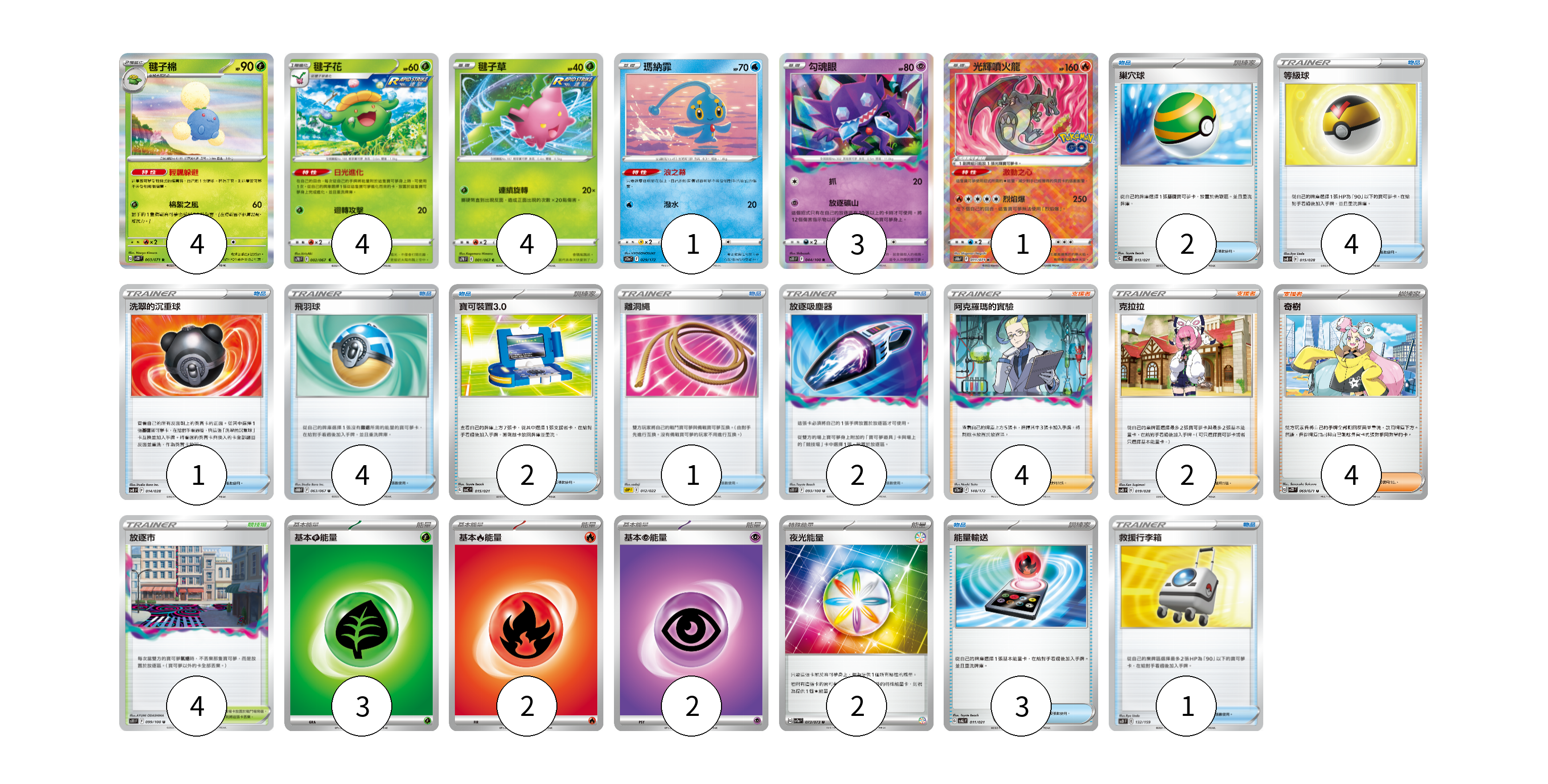 牌組構築方案 以此牌組為基礎新構築牌組 顯示卡面 顯示列表 寶可夢卡(17) 4 4 4 1 3 1 物品卡(20) 2 4 1 4 2 1 2 3 1 支援者卡(10) 4 2 4 競技場卡(4) 4 能量卡(9) 3 2 2 2 寶可夢卡(17) 卡牌名稱 張數 卡牌名稱 張數 毽子棉 SV2D 003/071 04 毽子花 S7R 002/067 04 毽子草 S7R 001/067 04 瑪納霏 S12a 029/172 01 勾魂眼 S11 044/100 03 光輝噴火龍 S10b 011/071 01 物品卡(20) 卡牌名稱 張數 卡牌名稱 張數 巢穴球 SVC 013/021 02 等級球 SVB 015/028 04 洗翠的沉重球 SVB 014/028 01 飛羽球 S10D 063/067 04 寶可裝置3.0 SVC 015/021 02 離洞繩 SDP 012/022 01 放逐吸塵器 S11 093/100 02 能量輸送 SVAL 011/021 03 救援行李箱 SCD 132/159 01 支援者卡(10) 卡牌名稱 張數 卡牌名稱 張數 阿克羅瑪的實驗 S12a 148/172 04 克拉拉 SVB 019/028 02 奇樹 SV2D 069/071 04 競技場卡(4) 卡牌名稱 張數 卡牌名稱 張數 放逐市 S11 099/100 04 能量卡(9) 卡牌名稱 張數 卡牌名稱 張數 基本【草】能量 SVB GRA 03 基本【火】能量 SVB FIR 02 基本【超】能量 SVB PSY 02 夜光能量 SV1a 073/073 02 以此牌組為基礎新構築牌組 牌組編碼 oHocym-JJeXFC-woTrGf copy 列印牌組單 牌組編碼已複製 分享至SNS