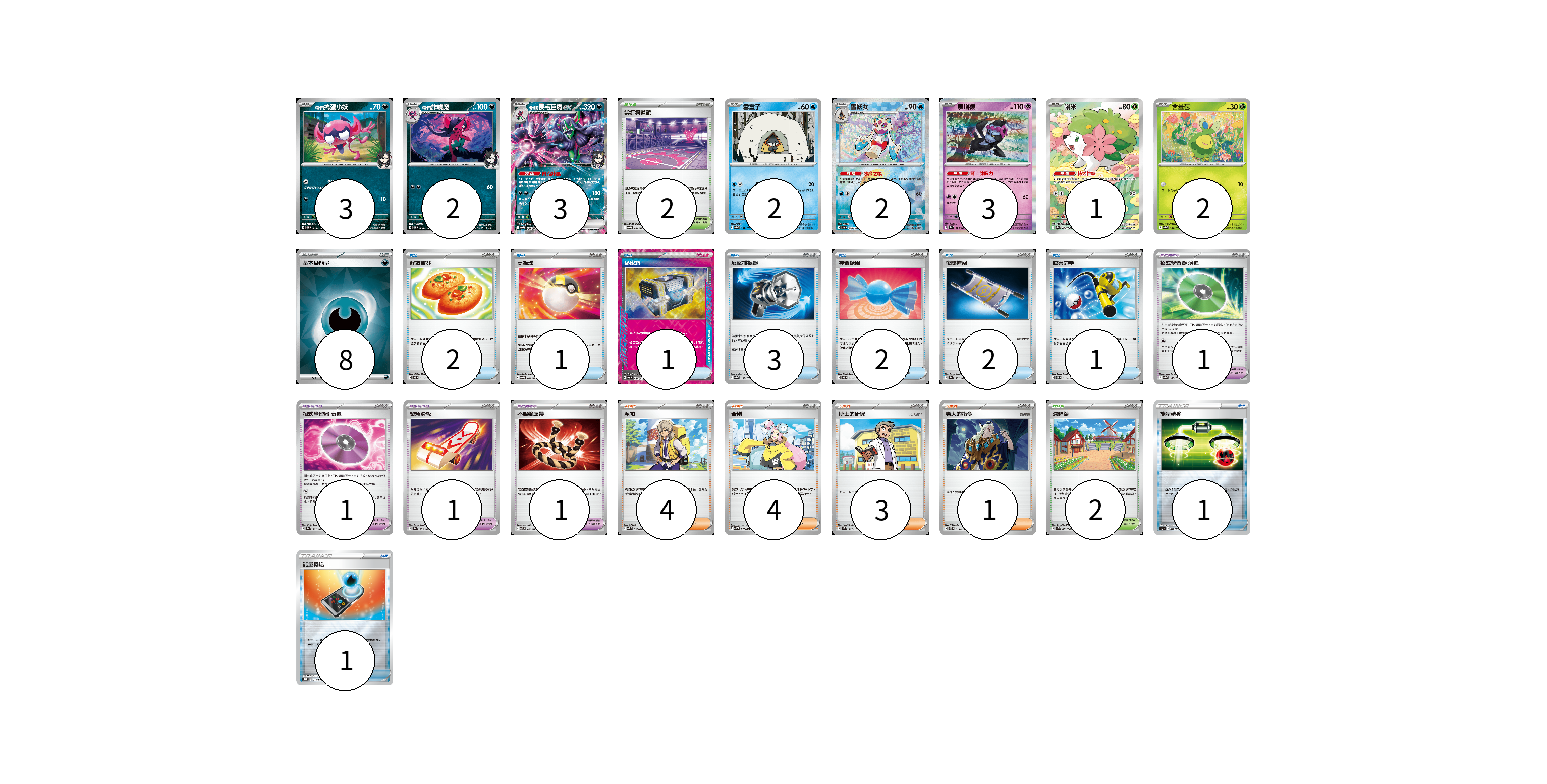牌組構築方案 以此牌組為基礎新構築牌組 顯示卡面 顯示列表 寶可夢卡(18) 3 2 3 2 2 3 1 2 寶可夢道具(4) 1 1 1 1 物品卡(14) 2 1 1 3 2 2 1 1 1 支援者卡(12) 4 4 3 1 競技場卡(4) 2 2 能量卡(8) 8 寶可夢卡(18) 卡牌名稱 張數 卡牌名稱 張數 <瑪俐的>搗蛋小妖 SVOM 005/021 03 <瑪俐的>詐唬魔 SVOM 006/021 02 <瑪俐的>長毛巨魔ex SVOM 007/021 03 雪童子 SV8a 037/187 02 雪妖女 SV8a 038/187 02 願增猿 SV8a 075/187 03 謝米 SV9a 066/063 01 含羞苞 SV8a 001/187 02 寶可夢道具(4) 卡牌名稱 張數 卡牌名稱 張數 招式學習器 演進 SV8a 160/187 01 招式學習器 衰退 SV8a 161/187 01 緊急滑板 SV8a 153/187 01 不服輸頭帶 SVTL 016/021 01 物品卡(14) 卡牌名稱 張數 卡牌名稱 張數 好友寶芬 SVOD 011/020 02 高級球 SVOM 013/021 01 秘密箱 SV6 092/101 01 反擊捕捉器 SV8a 139/187 03 神奇糖果 SVOD 013/020 02 夜間擔架 SV8a 151/187 02 厲害釣竿 SVOM 011/021 01 能量轉移 SO 017/030 01 能量輸送 SO 018/030 01 支援者卡(12) 卡牌名稱 張數 卡牌名稱 張數 派帕 SVK 035/042 04 奇樹 SVHM 018/022 04 博士的研究 SVM 162/175 03 老大的指令 SVTG 019/019 01 競技場卡(4) 卡牌名稱 張數 卡牌名稱 張數 尖釘鎮道館 SVOM 021/021 02 深缽鎮 SVK 039/042 02 能量卡(8) 卡牌名稱 張數 卡牌名稱 張數 基本【惡】能量 SVOM DAR 08 以此牌組為基礎新構築牌組 牌組編碼 oHoitw-zBSWGH-bTJgcg copy 列印牌組單 牌組編碼已複製 分享至SNS