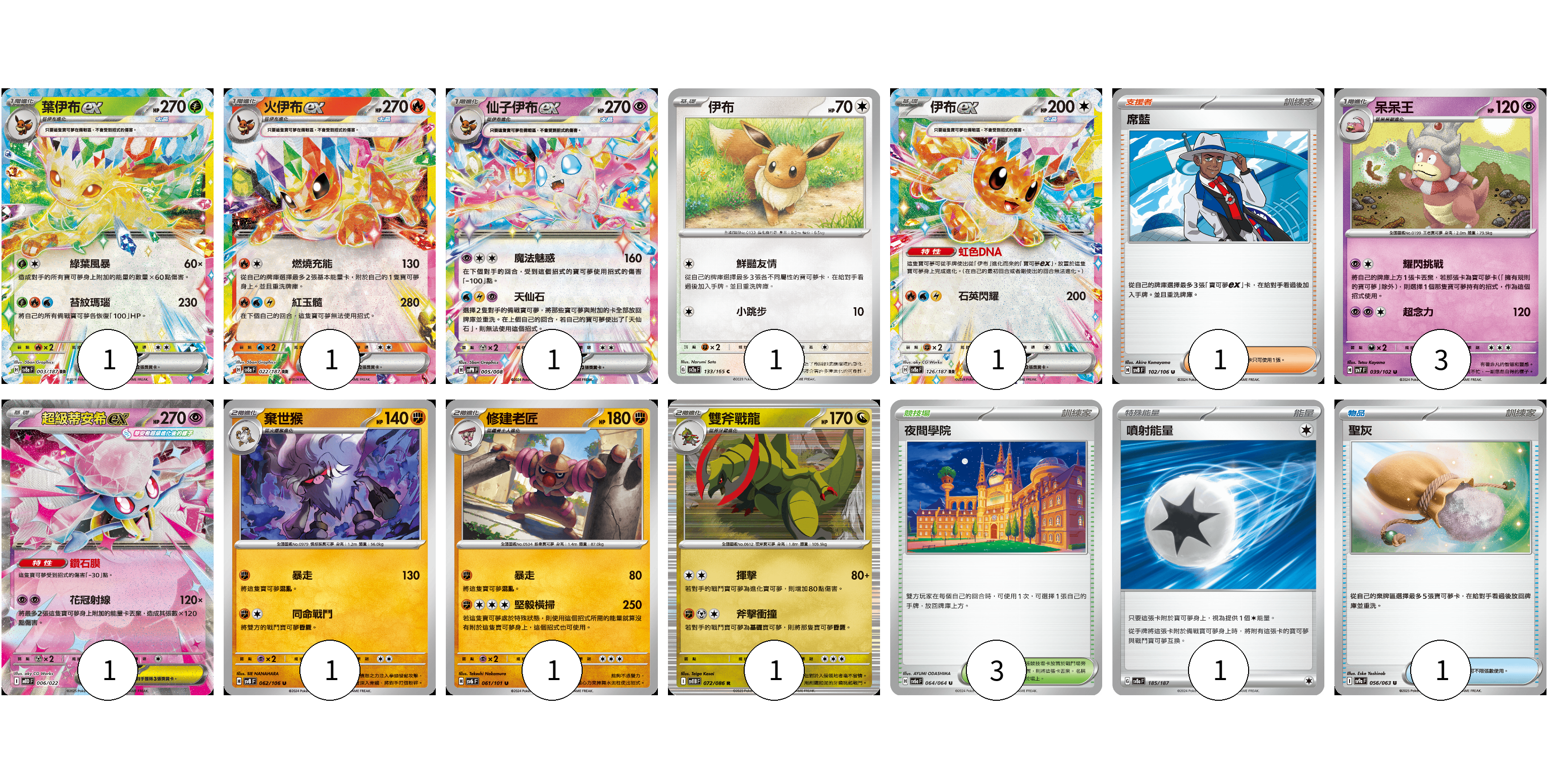 牌組構築方案 以此牌組為基礎新構築牌組 顯示卡面 顯示列表 寶可夢卡(12) 1 1 1 1 1 3 1 1 1 1 物品卡(1) 1 支援者卡(1) 1 競技場卡(3) 3 能量卡(1) 1 寶可夢卡(12) 卡牌名稱 張數 卡牌名稱 張數 葉伊布ex SV8a 003/187 01 火伊布ex SV8a 022/187 01 仙子伊布ex SVPN 005/008 01 伊布 SV2a 133/165 01 伊布ex SV8a 126/187 01 呆呆王 SV7 039/102 03 超級蒂安希ex MBD 006/022 01 棄世猴 SV8 062/106 01 修建老匠 SV6 061/101 01 雙斧戰龍 SV11B 072/086 01 物品卡(1) 卡牌名稱 張數 卡牌名稱 張數 聖灰 SV9a 056/063 01 支援者卡(1) 卡牌名稱 張數 卡牌名稱 張數 席藍 SV8 102/106 01 競技場卡(3) 卡牌名稱 張數 卡牌名稱 張數 夜間學院 SV6a 064/064 03 能量卡(1) 卡牌名稱 張數 卡牌名稱 張數 噴射能量 SV8a 185/187 01 以此牌組為基礎新構築牌組 牌組編碼 oJvvSH-KREVYb-bXSapq copy 列印牌組單 牌組編碼已複製 分享至SNS