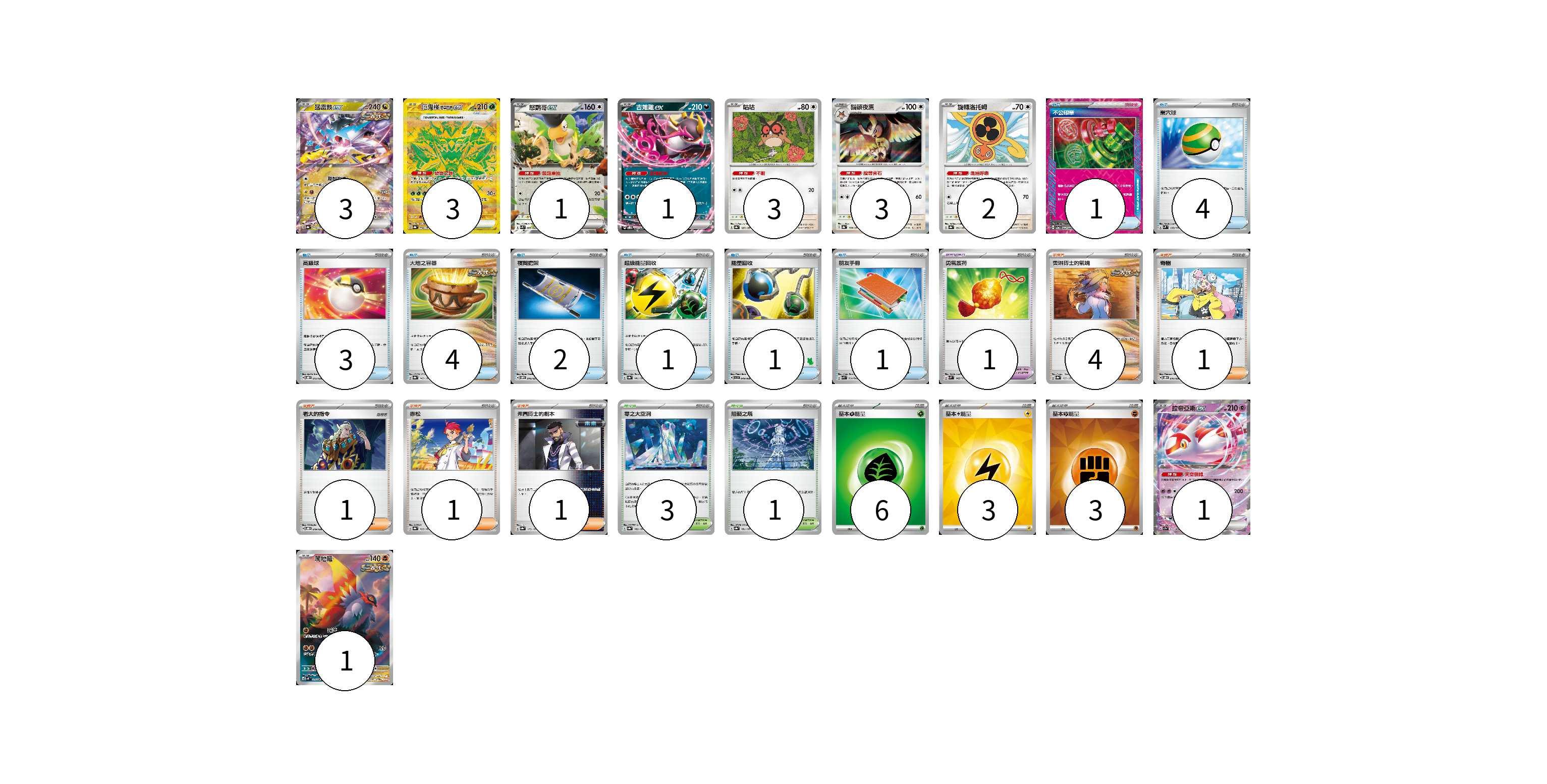 牌組構築方案 以此牌組為基礎新構築牌組 顯示卡面 顯示列表 寶可夢卡(18) 3 3 1 1 3 3 2 1 1 寶可夢道具(1) 1 物品卡(17) 1 4 3 4 2 1 1 1 支援者卡(8) 4 1 1 1 1 競技場卡(4) 3 1 能量卡(12) 6 3 3 寶可夢卡(18) 卡牌名稱 張數 卡牌名稱 張數 猛雷鼓ex SV8a 124/187 03 厄鬼椪 碧草面具ex SV8a 234/187 03 怒鸚哥ex SVK 006/042 01 吉雉雞ex SVOD 004/020 01 咕咕 SV8a 127/187 03 貓頭夜鷹 SV8a 128/187 03 旋轉洛托姆 SV8a 131/187 02 拉帝亞斯ex SV7a 019/064 01 爬地翅 SV4K 074/066 01 寶可夢道具(1) 卡牌名稱 張數 卡牌名稱 張數 勇氣護符 SVM 142/175 01 物品卡(17) 卡牌名稱 張數 卡牌名稱 張數 不公印章 SV5a 053/066 01 巢穴球 SVM 133/175 04 高級球 SVOD 012/020 03 大地之容器 SV8a 143/187 04 夜間擔架 SVOM 016/021 02 超級能量回收 SV8a 141/187 01 能量回收 SVI 049/066 01 朋友手冊 SVK 014/042 01 支援者卡(8) 卡牌名稱 張數 卡牌名稱 張數 奧琳博士的氣魄 SV8a 167/187 04 奇樹 SVOD 016/020 01 老大的指令 SVOD 019/020 01 赤松 SV8a 163/187 01 弗圖博士的劇本 SV8a 175/187 01 競技場卡(4) 卡牌名稱 張數 卡牌名稱 張數 零之大空洞 SV8a 182/187 03 阻礙之塔 SV8a 181/187 01 能量卡(12) 卡牌名稱 張數 卡牌名稱 張數 基本草能量 sv-p GRA 06 基本【雷】能量 SVK LIG 03 基本【鬥】能量 SVK FIG 03 以此牌組為基礎新構築牌組 牌組編碼 oKgTwN-qUoxaz-wZwWwy copy 列印牌組單 牌組編碼已複製 分享至SNS