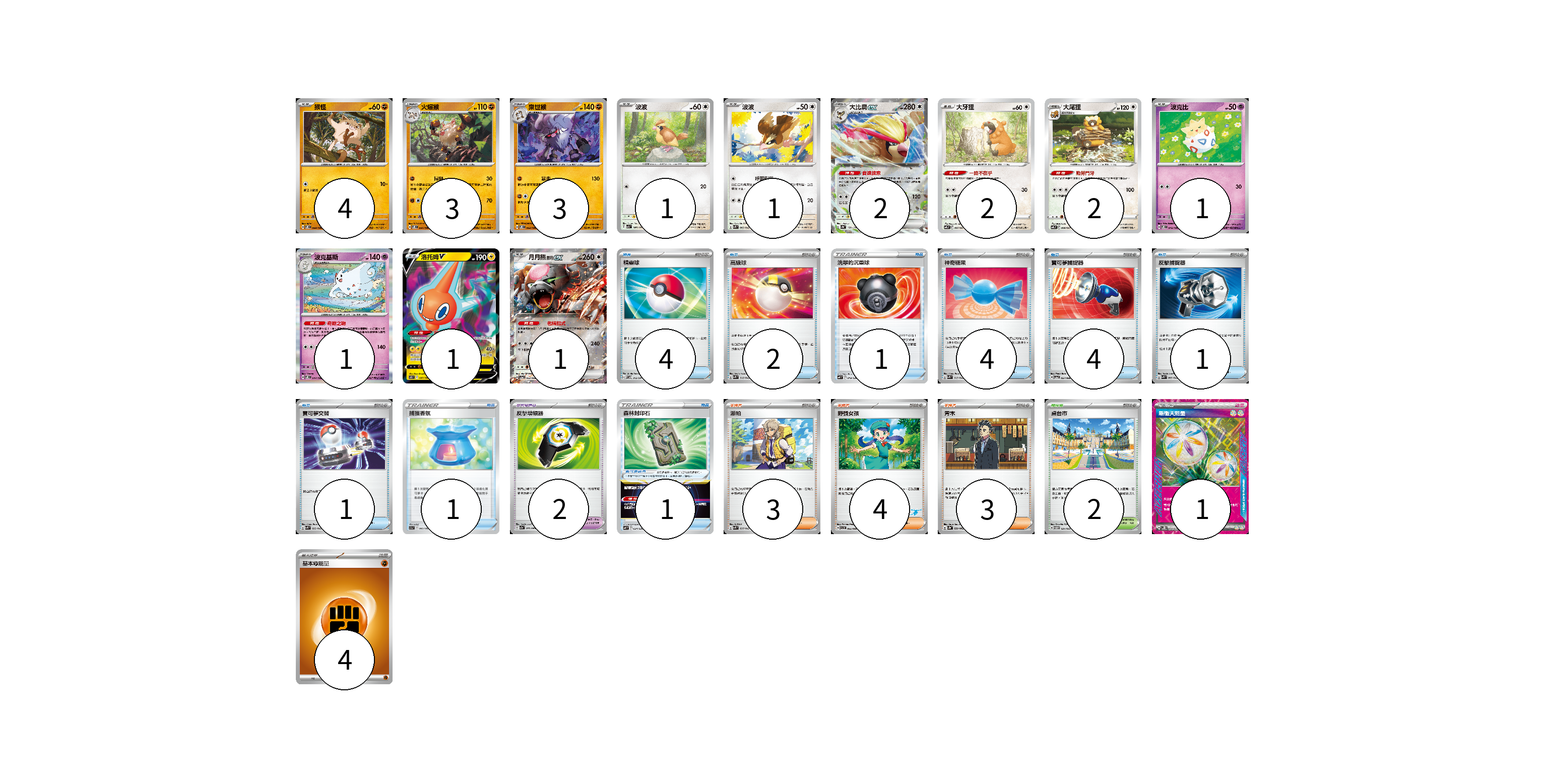 牌組構築方案 以此牌組為基礎新構築牌組 顯示卡面 顯示列表 寶可夢卡(22) 4 3 3 1 1 2 2 2 1 1 1 1 寶可夢道具(2) 2 物品卡(19) 4 2 1 4 4 1 1 1 1 支援者卡(10) 3 4 3 競技場卡(2) 2 能量卡(5) 1 4 寶可夢卡(22) 卡牌名稱 張數 卡牌名稱 張數 猴怪 SV8 060/106 04 火爆猴 SV8 061/106 03 棄世猴 SV8 062/106 03 波波 SV3 087/108 01 波波 SVK 003/042 01 大比鳥ex SV4a 139/190 02 大牙狸 SVTL 007/021 02 大尾狸 SVTL 008/021 02 波克比 SV8 045/106 01 波克基斯 SV8 047/106 01 洛托姆V S11 037/100 01 月月熊 赫月 ex SV5a 052/066 01 寶可夢道具(2) 卡牌名稱 張數 卡牌名稱 張數 反擊增幅器 SV7a 059/064 02 物品卡(19) 卡牌名稱 張數 卡牌名稱 張數 精靈球 SV-P 013/SV-P 04 高級球 SVK 018/042 02 洗翠的沉重球 SVF 019/038 01 神奇糖果 SVK 019/042 04 寶可夢捕捉器 SV5a 057/066 04 反擊捕捉器 SVK 009/042 01 寶可夢交替 SVK 022/042 01 捕獲香氛 S11a 060/068 01 森林封印石 SVF 024/038 01 支援者卡(10) 卡牌名稱 張數 卡牌名稱 張數 派帕 SVK 035/042 03 野餐女孩 SVI 065/066 04 青木 SV3a 058/062 03 競技場卡(2) 卡牌名稱 張數 卡牌名稱 張數 桌台市 SVTM 021/022 02 能量卡(5) 卡牌名稱 張數 卡牌名稱 張數 新衝天能量 SV5K 071/071 01 基本鬥能量 sv-p FIG 04 以此牌組為基礎新構築牌組 牌組編碼 oMjxqb-StOcdR-PCXYto copy 列印牌組單 牌組編碼已複製 分享至SNS