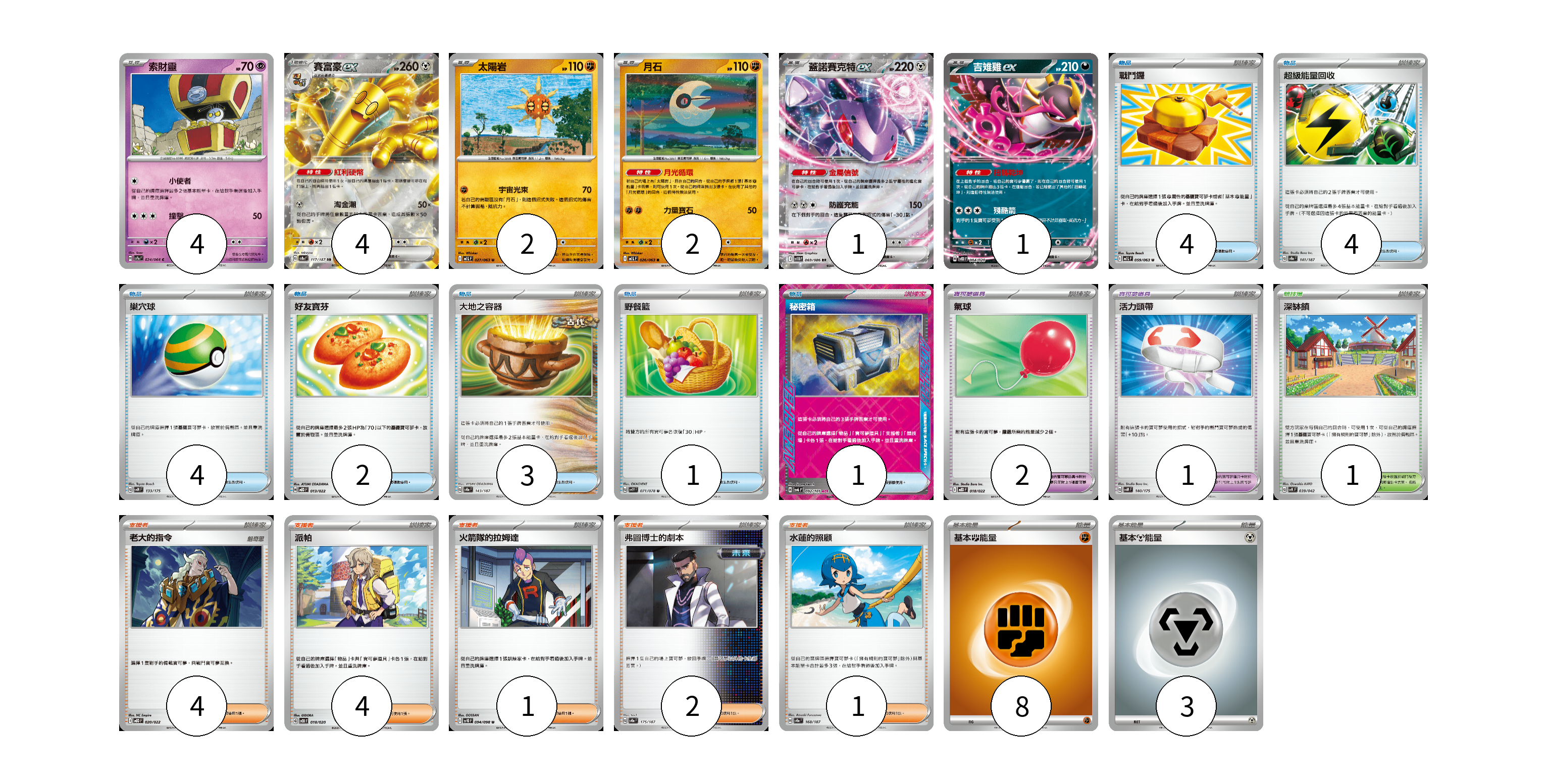 牌組構築方案 以此牌組為基礎新構築牌組 顯示卡面 顯示列表 寶可夢卡(14) 4 4 2 2 1 1 寶可夢道具(3) 2 1 物品卡(19) 4 4 4 2 3 1 1 支援者卡(12) 4 4 1 2 1 競技場卡(1) 1 能量卡(11) 8 3 寶可夢卡(14) 卡牌名稱 張數 卡牌名稱 張數 索財靈 SV7a 024/064 04 賽富豪ex SV8a 117/187 04 太陽岩 M1L 027/063 02 月石 M1L 026/063 02 蓋諾賽克特ex SV11B 069/086 01 吉雉雞ex SVOD 004/020 01 寶可夢道具(3) 卡牌名稱 張數 卡牌名稱 張數 氣球 MBD 018/022 02 活力頭帶 SVM 140/175 01 物品卡(19) 卡牌名稱 張數 卡牌名稱 張數 戰鬥鑼 M1L 059/063 04 超級能量回收 SV8a 141/187 04 巢穴球 SVM 133/175 04 好友寶芬 MBD 013/022 02 大地之容器 SV8a 143/187 03 野餐籃 SV1V 071/078 01 秘密箱 SV6 092/101 01 支援者卡(12) 卡牌名稱 張數 卡牌名稱 張數 老大的指令 MBD 020/022 04 派帕 SVOD 018/020 04 火箭隊的拉姆達 SV10 094/098 01 弗圖博士的劇本 SV8a 175/187 02 水蓮的照顧 SV8a 168/187 01 競技場卡(1) 卡牌名稱 張數 卡牌名稱 張數 深缽鎮 SVK 039/042 01 能量卡(11) 卡牌名稱 張數 卡牌名稱 張數 基本鬥能量 sv-p FIG 08 基本鋼能量 sv-p MET 03 以此牌組為基礎新構築牌組 牌組編碼 oMmOPM-TXKoZU-SHhnsL copy 列印牌組單 牌組編碼已複製 分享至SNS
