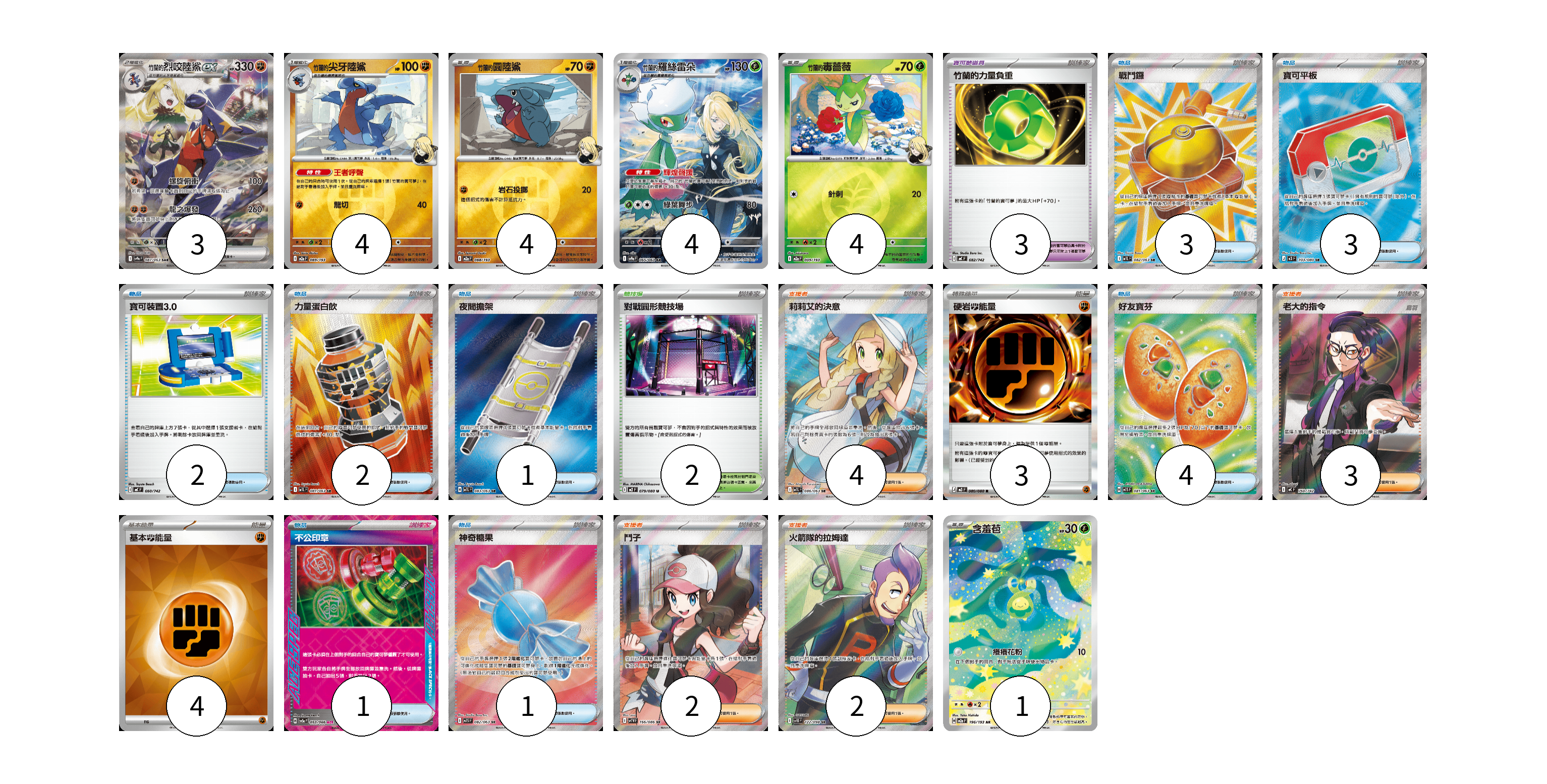 牌組構築方案 以此牌組為基礎新構築牌組 顯示卡面 顯示列表 寶可夢卡(20) 3 4 4 4 4 1 寶可夢道具(3) 3 物品卡(17) 3 3 2 2 1 4 1 1 支援者卡(11) 4 3 2 2 競技場卡(2) 2 能量卡(7) 3 4 寶可夢卡(20) 卡牌名稱 張數 卡牌名稱 張數 <竹蘭的>烈咬陸鯊ex SV9a 087/063 03 竹蘭的尖牙陸鯊 M2a 089/193 04 竹蘭的圓陸鯊 M2a 088/193 04 <竹蘭的>羅絲雷朵 SV9a 065/063 04 竹蘭的毒薔薇 M2a 009/193 04 含羞苞 M2a 196/193 01 寶可夢道具(3) 卡牌名稱 張數 卡牌名稱 張數 竹蘭的力量負重 MC 682/742 03 物品卡(17) 卡牌名稱 張數 卡牌名稱 張數 戰鬥鑼 M1L 082/063 03 寶可平板 M3 103/080 03 寶可裝置3.0 MC 660/742 02 力量蛋白飲 M1L 081/063 02 夜間擔架 M1L 083/063 01 好友寶芬 M1S 081/063 04 不公印章 SV5a 053/066 01 神奇糖果 M1S 082/063 01 支援者卡(11) 卡牌名稱 張數 卡牌名稱 張數 莉莉艾的決意 M1L 086/063 04 老大的指令(烏羽) MC 760/742 03 鬥子 SV11W 166/086 02 火箭隊的拉姆達 SV10 122/098 02 競技場卡(2) 卡牌名稱 張數 卡牌名稱 張數 對戰圓形競技場 M2 079/080 02 能量卡(7) 卡牌名稱 張數 卡牌名稱 張數 硬岩【鬥】能量 M3 080/080 03 基本【鬥】能量 SVM FIG 04 以此牌組為基礎新構築牌組 牌組編碼 oNCcjG-fUvVQJ-GspXbV copy 列印牌組單 牌組編碼已複製 分享至SNS