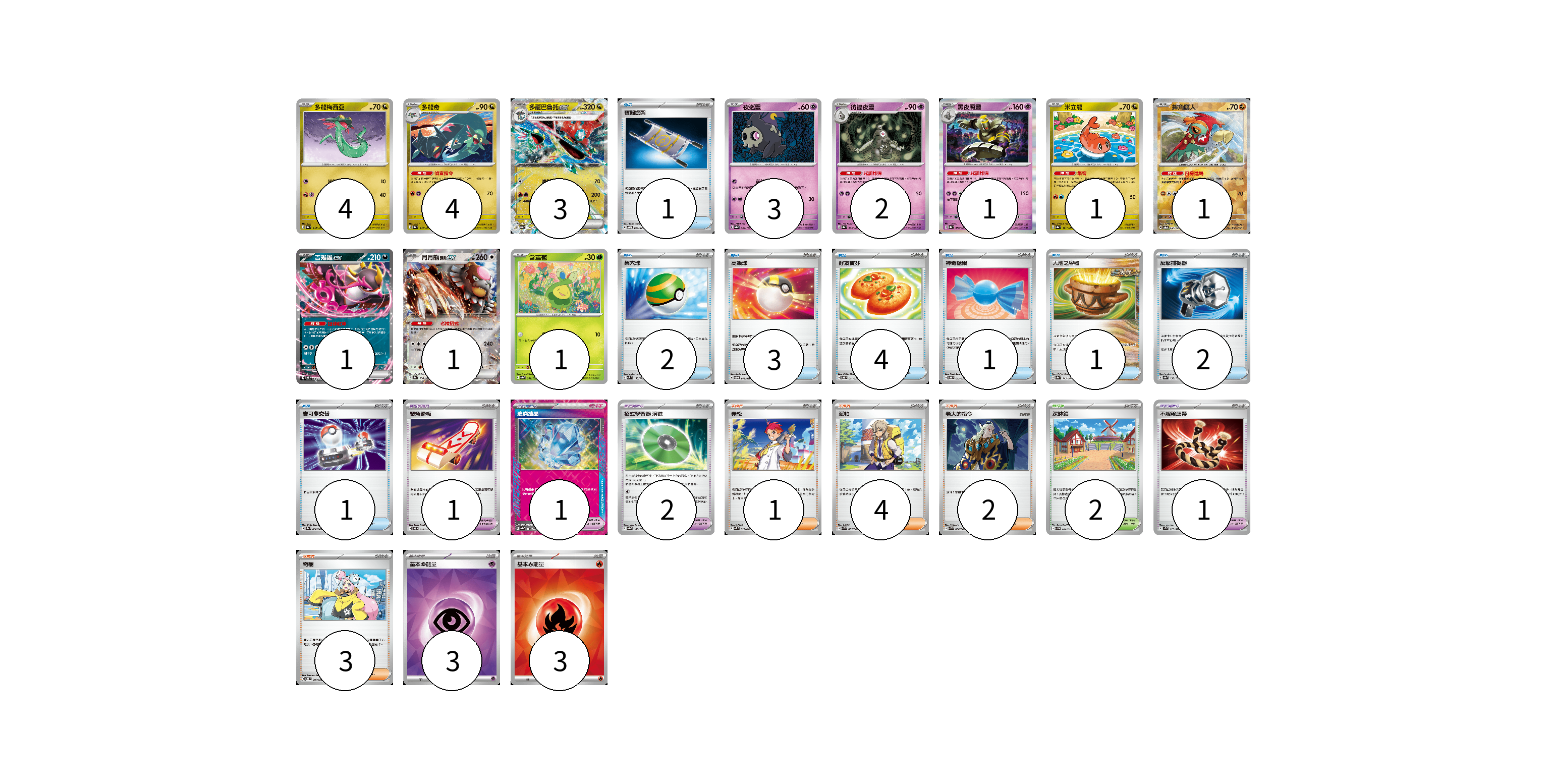 牌組構築方案 以此牌組為基礎新構築牌組 顯示卡面 顯示列表 寶可夢卡(22) 4 4 3 3 2 1 1 1 1 1 1 寶可夢道具(5) 1 1 2 1 物品卡(15) 1 2 3 4 1 1 2 1 支援者卡(10) 1 4 2 3 競技場卡(2) 2 能量卡(6) 3 3 寶可夢卡(22) 卡牌名稱 張數 卡牌名稱 張數 多龍梅西亞 SV8a 118/187 04 多龍奇 SV8a 119/187 04 多龍巴魯托ex SV8a 120/187 03 夜巡靈 SV8a 064/187 03 彷徨夜靈 SV8a 065/187 02 黑夜魔靈 SV8a 066/187 01 米立龍 SV8a 121/187 01 摔角鷹人 SV8a 084/187 01 吉雉雞ex SVOD 004/020 01 月月熊 赫月ex SV8a 134/187 01 含羞苞 SV8a 001/187 01 寶可夢道具(5) 卡牌名稱 張數 卡牌名稱 張數 緊急滑板 SVOD 015/020 01 璀璨結晶 SV8a 152/187 01 招式學習器 演進 SV8a 160/187 02 不服輸頭帶 SV1S 073/078 01 物品卡(15) 卡牌名稱 張數 卡牌名稱 張數 夜間擔架 SVOM 016/021 01 巢穴球 SVM 133/175 02 高級球 SVOD 012/020 03 好友寶芬 SVOD 011/020 04 神奇糖果 SVOD 013/020 01 大地之容器 SV8a 143/187 01 反擊捕捉器 SV8a 139/187 02 寶可夢交替 SV9a 058/063 01 支援者卡(10) 卡牌名稱 張數 卡牌名稱 張數 赤松 SVK 027/042 01 派帕 SVK 035/042 04 老大的指令 SVK 036/042 02 奇樹 SVOD 016/020 03 競技場卡(2) 卡牌名稱 張數 卡牌名稱 張數 深缽鎮 SVF 036/038 02 能量卡(6) 卡牌名稱 張數 卡牌名稱 張數 基本【超】能量 SVOD PSY 03 基本【火】能量 SVK FIR 03 以此牌組為基礎新構築牌組 牌組編碼 oNKDlX-jabapB-dnnzqq copy 列印牌組單 牌組編碼已複製 分享至SNS