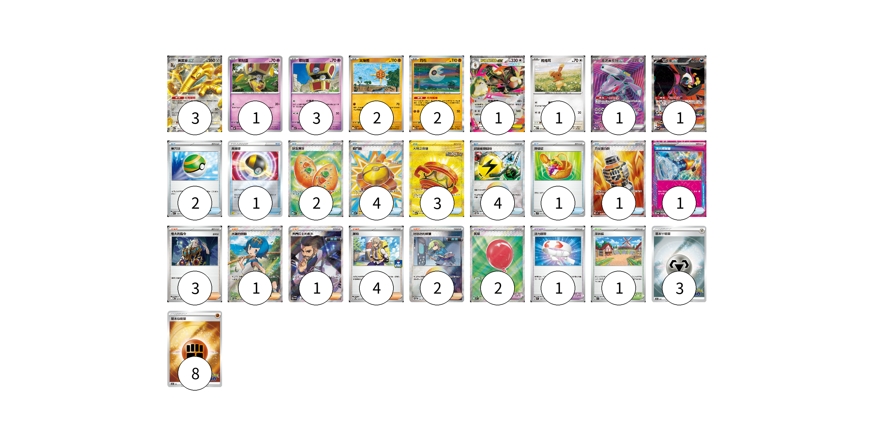 牌組構築方案 以此牌組為基礎新構築牌組 顯示卡面 顯示列表 寶可夢卡(15) 3 1 3 2 2 1 1 1 1 寶可夢道具(3) 2 1 物品卡(19) 2 1 2 4 3 4 1 1 1 支援者卡(11) 3 1 1 4 2 競技場卡(1) 1 能量卡(11) 3 8 寶可夢卡(15) 卡牌名稱 張數 卡牌名稱 張數 賽富豪ex SV8a 117/187 03 索財靈 SV8a 073/187 01 索財靈 SV7a 024/064 03 太陽岩 M1L 027/063 02 月石 M1L 026/063 02 超級長耳兔ex M2 072/080 01 捲捲耳 M2 071/080 01 蓋諾賽克特ex SV11B 164/086 01 吉雉雞ex SV6a 089/064 01 寶可夢道具(3) 卡牌名稱 張數 卡牌名稱 張數 氣球 M1L 084/063 02 活力頭帶 SVM 140/175 01 物品卡(19) 卡牌名稱 張數 卡牌名稱 張數 巢穴球 SVM 133/175 02 高級球 SPZ 009/020 01 好友寶芬 M1S 081/063 02 戰鬥鑼 M1L 082/063 04 大地之容器 SV6a 093/064 03 超級能量回收 SV8a 141/187 04 野餐籃 SV1V 071/078 01 力量蛋白飲 M1L 081/063 01 頂尖捕捉器 SV8a 148/187 01 支援者卡(11) 卡牌名稱 張數 卡牌名稱 張數 老大的指令 MBG 021/022 03 水蓮的照顧 SV5a 088/066 01 弗圖博士的劇本 SV4M 086/066 01 派帕 SV-P 213/SV-P 04 暗碼迷的解讀 SV8a 165/187 02 競技場卡(1) 卡牌名稱 張數 卡牌名稱 張數 深缽鎮 SV1a 070/073 01 能量卡(11) 卡牌名稱 張數 卡牌名稱 張數 基本鋼能量 S10b MET 03 基本鬥能量 S10b FIG 08 以此牌組為基礎新構築牌組 牌組編碼 oOSAku-PozErX-oZWLlM copy 列印牌組單 牌組編碼已複製 分享至SNS