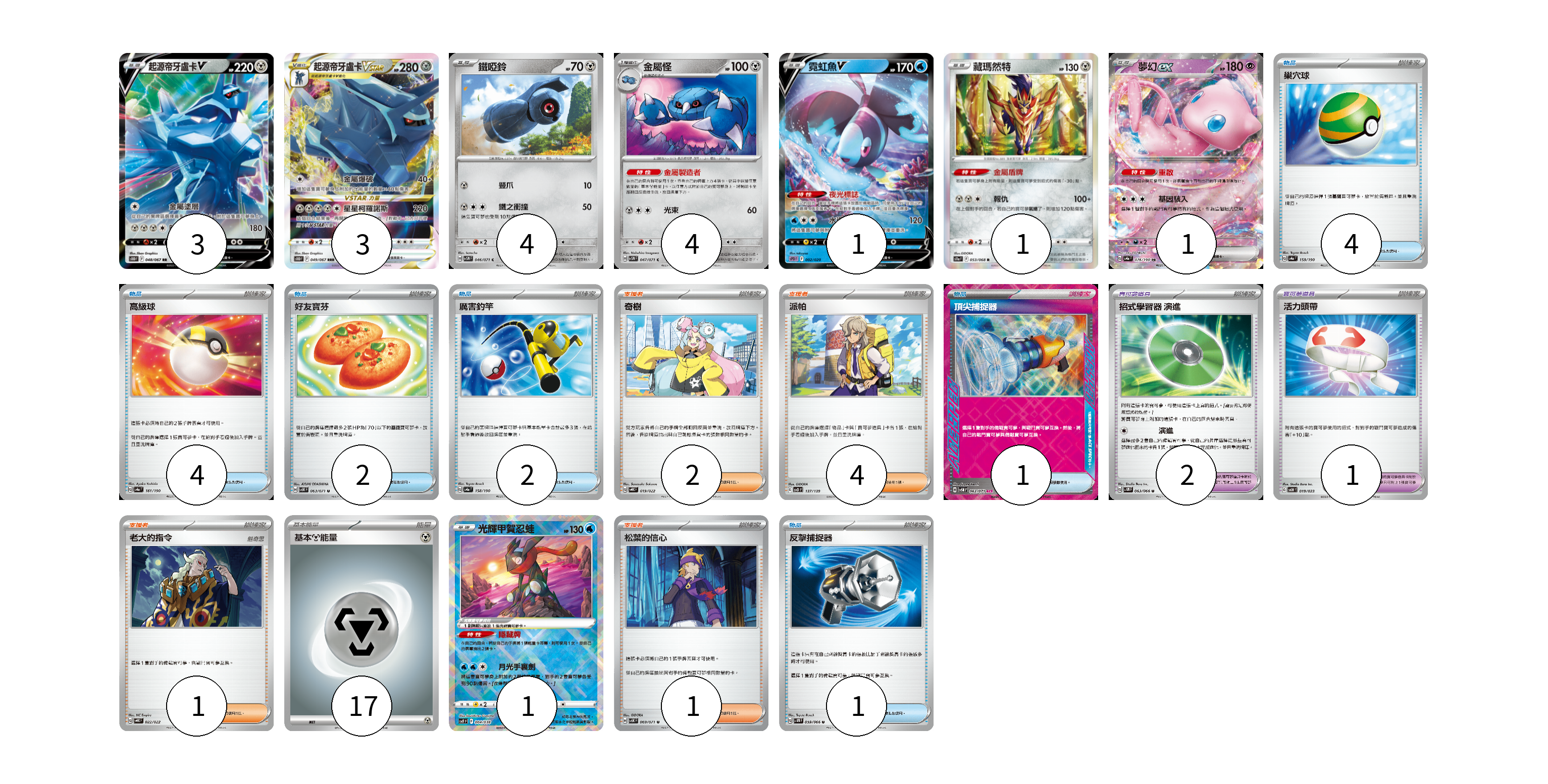 牌組構築方案 以此牌組為基礎新構築牌組 顯示卡面 顯示列表 寶可夢卡(18) 3 3 4 4 1 1 1 1 寶可夢道具(3) 2 1 物品卡(14) 4 4 2 2 1 1 支援者卡(8) 2 4 1 1 能量卡(17) 17 寶可夢卡(18) 卡牌名稱 張數 卡牌名稱 張數 起源帝牙盧卡V S10D 048/067 03 起源帝牙盧卡VSTAR S10D 049/067 03 鐵啞鈴 SV5M 046/071 04 金屬怪 SV5M 047/071 04 霓虹魚V SPD 002/020 01 藏瑪然特 S11a 053/068 01 夢幻ex SV4a 076/190 01 光輝甲賀忍蛙 SVF 004/038 01 寶可夢道具(3) 卡牌名稱 張數 卡牌名稱 張數 招式學習器 演進 SV4M 063/066 02 活力頭帶 SVAW 019/023 01 物品卡(14) 卡牌名稱 張數 卡牌名稱 張數 巢穴球 SV4a 159/190 04 高級球 SV4a 161/190 04 好友寶芬 SV5K 063/071 02 厲害釣竿 SV4a 158/190 02 頂尖捕捉器 SV5M 062/071 01 反擊捕捉器 SV4M 059/066 01 支援者卡(8) 卡牌名稱 張數 卡牌名稱 張數 奇樹 SVHK 019/022 02 派帕 SVD 137/139 04 老大的指令 SVHK 022/022 01 松葉的信心 SV5K 069/071 01 能量卡(17) 卡牌名稱 張數 卡牌名稱 張數 基本【鋼】能量 SVF MET 17 以此牌組為基礎新構築牌組 牌組編碼 oOtbeA-lDKISN-nfDhNm copy 列印牌組單 牌組編碼已複製 分享至SNS