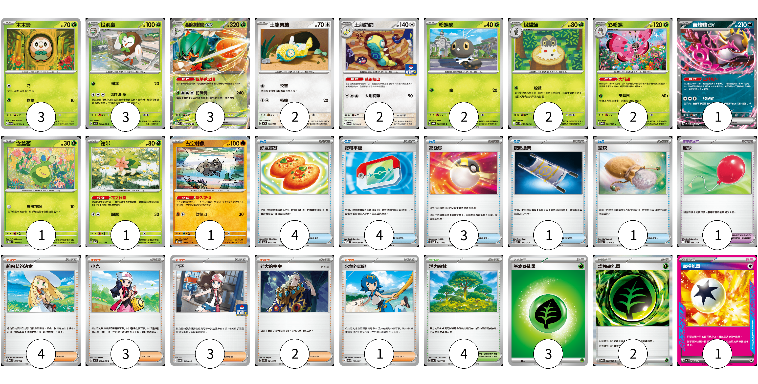 牌組構築方案 以此牌組為基礎新構築牌組 顯示卡面 顯示列表 寶可夢卡(23) 3 3 3 2 2 2 2 2 1 1 1 1 寶可夢道具(1) 1 物品卡(13) 4 4 3 1 1 支援者卡(13) 4 3 3 2 1 競技場卡(4) 4 能量卡(6) 3 2 1 寶可夢卡(23) 卡牌名稱 張數 卡牌名稱 張數 木木梟 SV6a 003/064 03 投羽梟 M3 011/080 03 狙射樹梟ex M3 012/080 03 土龍弟弟 MC 574/742 02 土龍節節 M-P 045/M-P 02 粉蝶蟲 M3 007/080 02 粉蝶蛹 M3 008/080 02 彩粉蝶 M3 009/080 02 吉雉雞ex MC 489/742 01 含羞苞 M2a 011/193 01 謝米 M2a 012/193 01 古空棘魚 SV5K 034/071 01 寶可夢道具(1) 卡牌名稱 張數 卡牌名稱 張數 氣球 MC 688/742 01 物品卡(13) 卡牌名稱 張數 卡牌名稱 張數 好友寶芬 MC 648/742 04 寶可平板 M3 070/080 04 高級球 MC 651/742 03 夜間擔架 MC 670/742 01 聖灰 M2a 150/193 01 支援者卡(13) 卡牌名稱 張數 卡牌名稱 張數 莉莉艾的決意 MC 729/742 04 小光 M2 077/080 03 鬥子 M-P 048/M-P 03 老大的指令 MBG 021/022 02 水蓮的照顧 SV8a 168/187 01 競技場卡(4) 卡牌名稱 張數 卡牌名稱 張數 活力森林 M2a 182/193 04 能量卡(6) 卡牌名稱 張數 卡牌名稱 張數 基本【草】能量 MJ GRA 03 增強【草】能量 M3 078/080 02 富裕能量 MC 740/742 01 以此牌組為基礎新構築牌組 牌組編碼 oPJAwN-rNFclu-YVwWoy copy 列印牌組單 牌組編碼已複製 分享至SNS