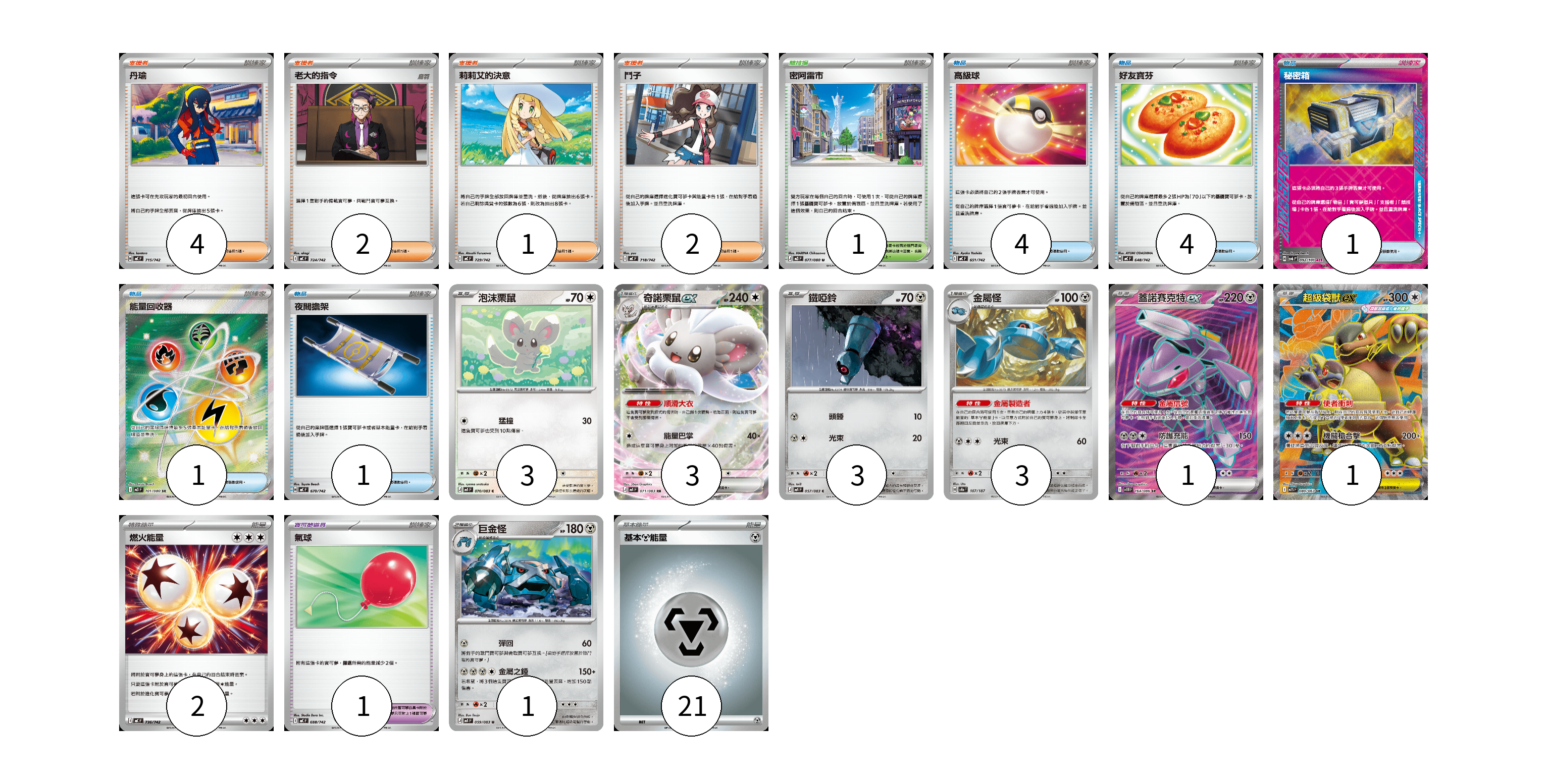 牌組構築方案 以此牌組為基礎新構築牌組 顯示卡面 顯示列表 寶可夢卡(15) 3 3 3 3 1 1 1 寶可夢道具(1) 1 物品卡(11) 4 4 1 1 1 支援者卡(9) 4 2 1 2 競技場卡(1) 1 能量卡(23) 2 21 寶可夢卡(15) 卡牌名稱 張數 卡牌名稱 張數 泡沫栗鼠 M4 070/083 03 奇諾栗鼠ex M4 071/083 03 鐵啞鈴 M4 057/083 03 金屬怪 SV8a 107/187 03 蓋諾賽克特ex SV11B 164/086 01 超級袋獸ex M1S 080/063 01 巨金怪 M4 059/083 01 寶可夢道具(1) 卡牌名稱 張數 卡牌名稱 張數 氣球 MC 688/742 01 物品卡(11) 卡牌名稱 張數 卡牌名稱 張數 高級球 MC 651/742 04 好友寶芬 MC 648/742 04 秘密箱 SV6 092/101 01 能量回收器 M3 101/080 01 夜間擔架 MC 670/742 01 支援者卡(9) 卡牌名稱 張數 卡牌名稱 張數 丹瑜 MC 715/742 04 老大的指令 MC 724/742 02 莉莉艾的決意 MC 729/742 01 鬥子 MC 718/742 02 競技場卡(1) 卡牌名稱 張數 卡牌名稱 張數 密阿雷市 M3 077/080 01 能量卡(23) 卡牌名稱 張數 卡牌名稱 張數 燃火能量 MC 736/742 02 基本【鋼】能量 MC MET 21 以此牌組為基礎新構築牌組 牌組編碼 oQAewf-xlwriq-XgFESs copy 列印牌組單 牌組編碼已複製 分享至SNS