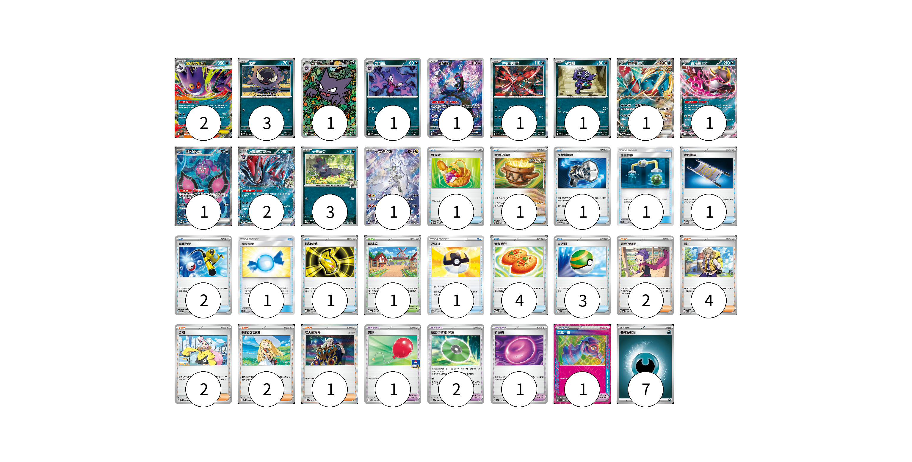 牌組構築方案 以此牌組為基礎新構築牌組 顯示卡面 顯示列表 寶可夢卡(19) 2 3 1 1 1 1 1 1 1 1 2 3 1 寶可夢道具(5) 1 2 1 1 物品卡(17) 1 1 1 1 1 2 1 1 1 4 3 支援者卡(11) 2 4 2 2 1 競技場卡(1) 1 能量卡(7) 7 寶可夢卡(19) 卡牌名稱 張數 卡牌名稱 張數 超級耿鬼ex MBG 003/022 02 鬼斯 MBG 001/022 03 鬼斯通 MBG 023/022 01 鬼斯通 SV3a 034/062 01 願增猿 SV6 107/101 01 伊裴爾塔爾 M1L 040/063 01 勾魂眼 MBG 006/022 01 轟鳴月ex SV-P 167/SV-P 01 吉雉雞ex SV6a 038/064 01 桃歹郎ex SV6a 082/064 01 N的索羅亞克ex SV9 061/100 02 N的索羅亞 SV9 060/100 03 N的萊希拉姆 SV9 109/100 01 寶可夢道具(5) 卡牌名稱 張數 卡牌名稱 張數 氣球 M-P 047/M-P 01 招式學習器 演進 SV8a 160/187 02 鎖鏈糬 SV6a 057/064 01 英雄斗篷 SV5M 064/071 01 物品卡(17) 卡牌名稱 張數 卡牌名稱 張數 野餐籃 SV1V 071/078 01 大地之容器 SVK 012/042 01 反擊捕捉器 SVTS 009/022 01 能量轉移 AS6D 142/168 01 夜間擔架 SV8a 151/187 01 厲害釣竿 SVTS 010/022 02 神奇糖果 AC1b 138/158 01 超級信號 M1S 058/063 01 高級球 S12a 138/172 01 好友寶芬 MBD 013/022 04 巢穴球 SVAW 014/023 03 支援者卡(11) 卡牌名稱 張數 卡牌名稱 張數 阿杏的秘招 SV8a 166/187 02 派帕 SVK 035/042 04 奇樹 SVHM 018/022 02 莉莉艾的決意 MBD 021/022 02 老大的指令 SV4a 181/190 01 競技場卡(1) 卡牌名稱 張數 卡牌名稱 張數 深缽鎮 SV4a 185/190 01 能量卡(7) 卡牌名稱 張數 卡牌名稱 張數 基本【惡】能量 M-P DAR 07 以此牌組為基礎新構築牌組 牌組編碼 oRFWDd-tIBRUI-CCStee copy 列印牌組單 牌組編碼已複製 分享至SNS