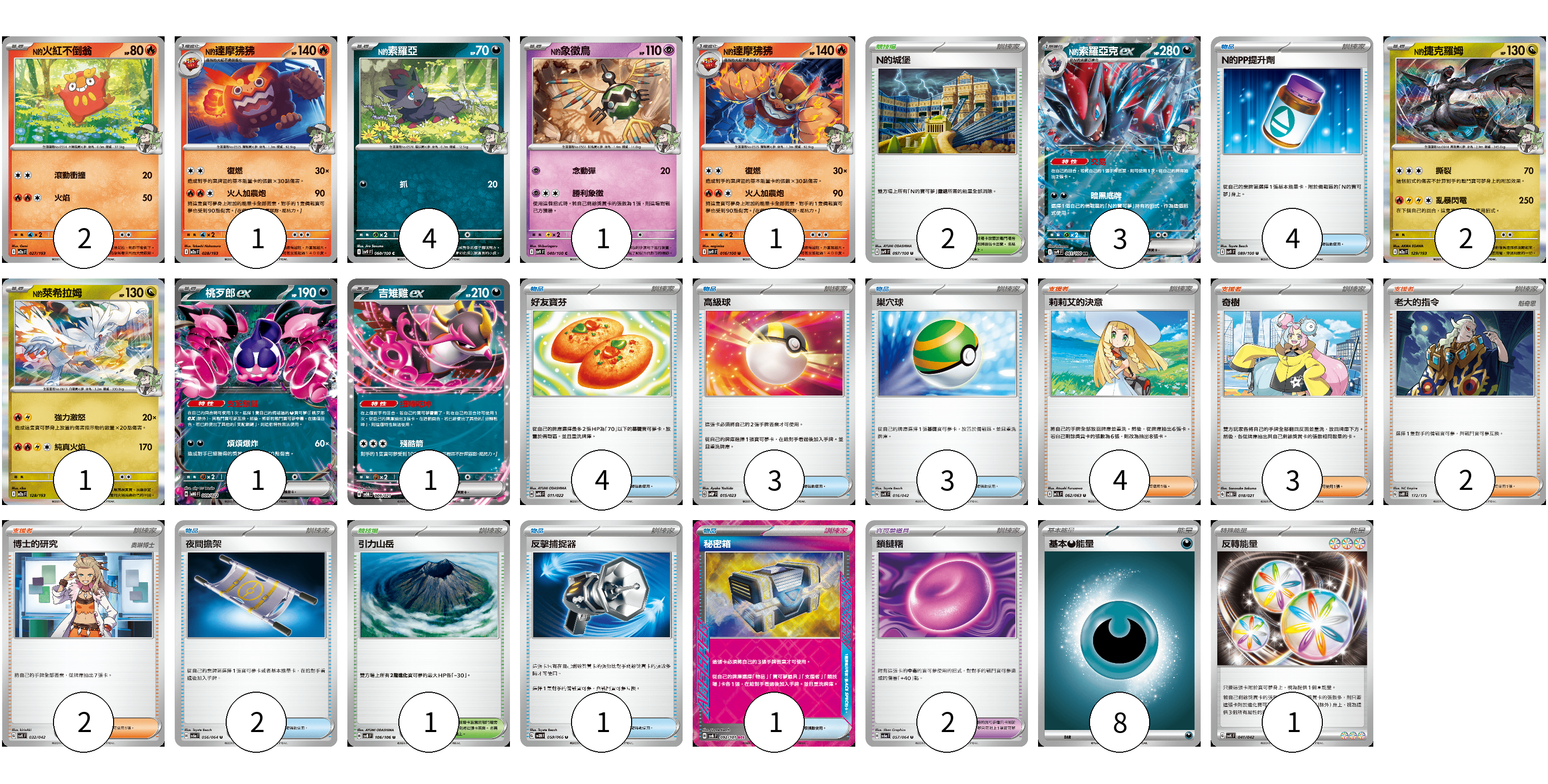 牌組構築方案 以此牌組為基礎新構築牌組 顯示卡面 顯示列表 寶可夢卡(17) 2 1 4 1 1 3 2 1 1 1 寶可夢道具(2) 2 物品卡(18) 4 4 3 3 2 1 1 支援者卡(11) 4 3 2 2 競技場卡(3) 2 1 能量卡(9) 8 1 寶可夢卡(17) 卡牌名稱 張數 卡牌名稱 張數 N的火紅不倒翁 M2a 027/193 02 N的達摩狒狒 M2a 028/193 01 N的索羅亞 SV9 060/100 04 N的象徵鳥 SV9 040/100 01 N的達摩狒狒 SV9 016/100 01 N的索羅亞克ex SV9 061/100 03 N的捷克羅姆 M2a 129/193 02 N的萊希拉姆 M2a 128/193 01 桃歹郎ex MBG 009/022 01 吉雉雞ex SVOM 009/021 01 寶可夢道具(2) 卡牌名稱 張數 卡牌名稱 張數 鎖鏈糬 SV6a 057/064 02 物品卡(18) 卡牌名稱 張數 卡牌名稱 張數 N的PP提升劑 SV9 089/100 04 好友寶芬 MBG 011/022 04 高級球 SVQP 015/023 03 巢穴球 SVK 016/042 03 夜間擔架 SV6a 056/064 02 反擊捕捉器 SV4M 059/066 01 秘密箱 SV6 092/101 01 支援者卡(11) 卡牌名稱 張數 卡牌名稱 張數 莉莉艾的決意 M1L 062/063 04 奇樹 SVOM 018/021 03 老大的指令 SVM 172/175 02 博士的研究 SVK 032/042 02 競技場卡(3) 卡牌名稱 張數 卡牌名稱 張數 N的城堡 SV9 097/100 02 引力山岳 SV8 106/106 01 能量卡(9) 卡牌名稱 張數 卡牌名稱 張數 基本【惡】能量 M-P DAR 08 反轉能量 SVK 041/042 01 以此牌組為基礎新構築牌組 牌組編碼 oTHgVT-lsrohI-ynQrME copy 列印牌組單 牌組編碼已複製 分享至SNS