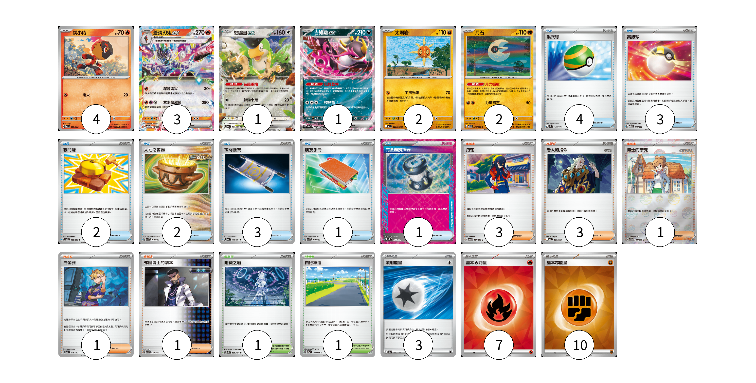 牌組構築方案 以此牌組為基礎新構築牌組 顯示卡面 顯示列表 寶可夢卡(13) 4 3 1 1 2 2 物品卡(16) 4 3 2 2 3 1 1 支援者卡(9) 3 3 1 1 1 競技場卡(2) 1 1 能量卡(20) 3 7 10 寶可夢卡(13) 卡牌名稱 張數 卡牌名稱 張數 炭小侍 SVPS 005/008 04 蒼炎刃鬼ex SVPS 006/008 03 怒鸚哥ex SV4a 154/190 01 吉雉雞ex SV8a 104/187 01 太陽岩 M1L 027/063 02 月石 M1L 026/063 02 物品卡(16) 卡牌名稱 張數 卡牌名稱 張數 巢穴球 SVM 133/175 04 高級球 MBD 014/022 03 戰鬥鑼 M1L 059/063 02 大地之容器 SVK 012/042 02 夜間擔架 SV6a 056/064 03 朋友手冊 SVK 014/042 01 完全體攪拌器 SVK 017/042 01 支援者卡(9) 卡牌名稱 張數 卡牌名稱 張數 丹瑜 SV6 097/101 03 老大的指令 MBD 020/022 03 博士的研究 SV11B 084/086 01 白蕾雅 SV8a 176/187 01 弗圖博士的劇本 SVK 034/042 01 競技場卡(2) 卡牌名稱 張數 卡牌名稱 張數 阻礙之塔 SV6 100/101 01 自行車道 SV2a 165/165 01 能量卡(20) 卡牌名稱 張數 卡牌名稱 張數 噴射能量 SV8a 185/187 03 基本【火】能量 SVQL FIR 07 基本【鬥】能量 SVM FIG 10 以此牌組為基礎新構築牌組 牌組編碼 oTtXVV-iUMTaV-Wknzym copy 列印牌組單 牌組編碼已複製 分享至SNS