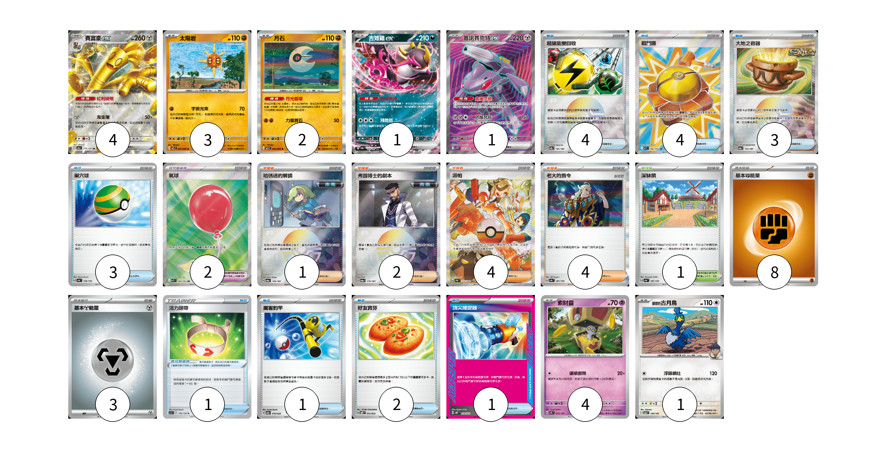 牌組構築方案 以此牌組為基礎新構築牌組 顯示卡面 顯示列表 寶可夢卡(16) 4 3 2 1 1 4 1 寶可夢道具(3) 2 1 物品卡(18) 4 4 3 3 1 2 1 支援者卡(11) 1 2 4 4 競技場卡(1) 1 能量卡(11) 8 3 寶可夢卡(16) 卡牌名稱 張數 卡牌名稱 張數 賽富豪ex SV8a 117/187 04 太陽岩 M1L 027/063 03 月石 M1L 026/063 02 吉雉雞ex SV8a 104/187 01 蓋諾賽克特ex SV11B 164/086 01 索財靈 SV8a 073/187 04 赫普的古月鳥 M2a 143/193 01 寶可夢道具(3) 卡牌名稱 張數 卡牌名稱 張數 氣球 M1L 084/063 02 活力頭帶 SC1a 143/154 01 物品卡(18) 卡牌名稱 張數 卡牌名稱 張數 超級能量回收 SV8a 141/187 04 戰鬥鑼 M1L 082/063 04 大地之容器 SV8a 143/187 03 巢穴球 SV4a 159/190 03 厲害釣竿 SVOD 010/020 01 好友寶芬 MBD 013/022 02 頂尖捕捉器 MBG 014/022 01 支援者卡(11) 卡牌名稱 張數 卡牌名稱 張數 暗碼迷的解讀 SV8a 165/187 01 弗圖博士的劇本 SV8a 175/187 02 派帕 SV4a 353/190 04 老大的指令 SV4a 181/190 04 競技場卡(1) 卡牌名稱 張數 卡牌名稱 張數 深缽鎮 SV4a 185/190 01 能量卡(11) 卡牌名稱 張數 卡牌名稱 張數 基本【鬥】能量 SVAM FIG 08 基本【鋼】能量 M-P MET 03 以此牌組為基礎新構築牌組 牌組編碼 oWkKTE-dBuqJq-HzjNgS copy 列印牌組單 牌組編碼已複製 分享至SNS