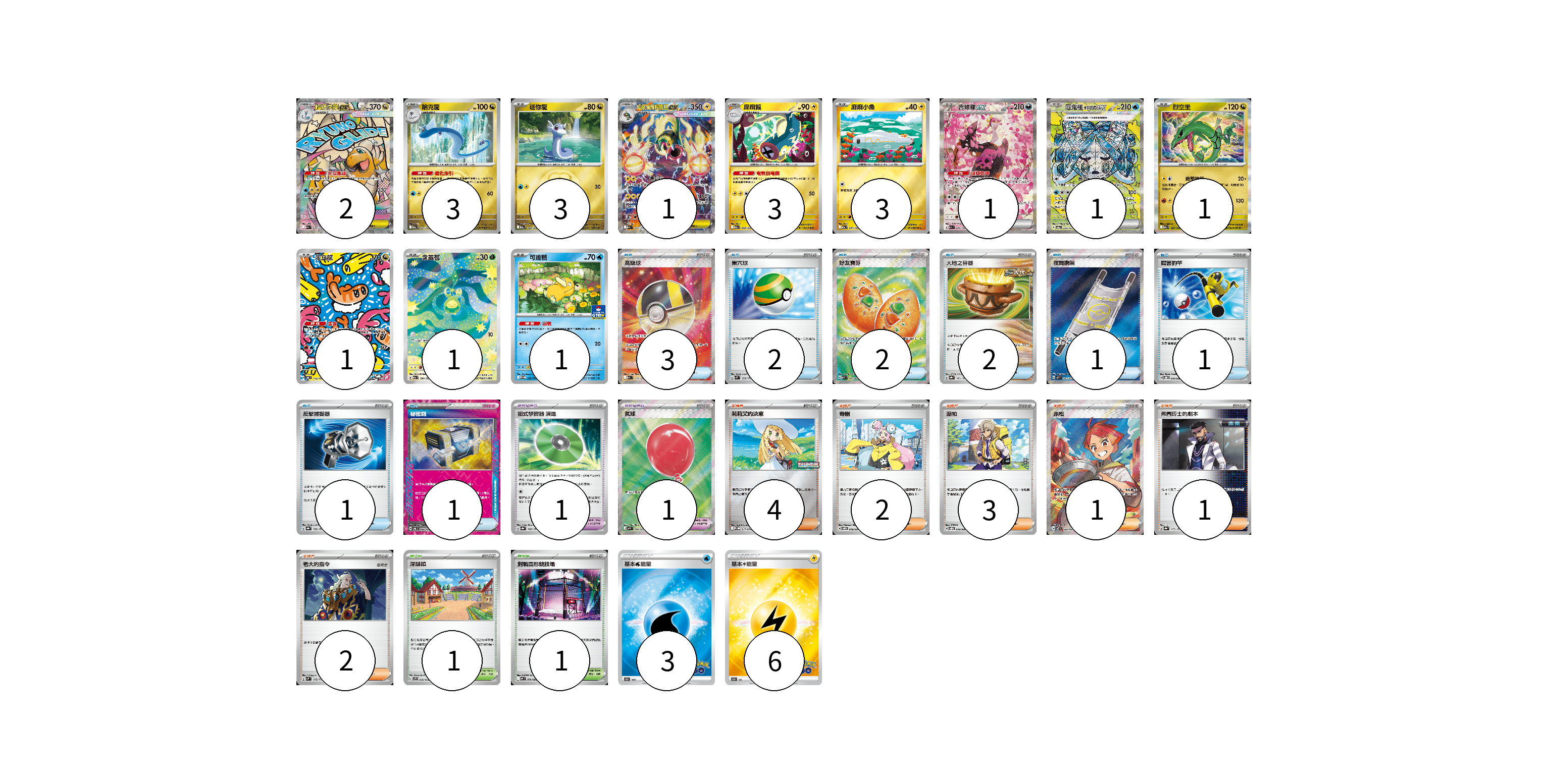 牌組構築方案 以此牌組為基礎新構築牌組 顯示卡面 顯示列表 寶可夢卡(21) 2 3 3 1 3 3 1 1 1 1 1 1 寶可夢道具(2) 1 1 物品卡(13) 3 2 2 2 1 1 1 1 支援者卡(13) 4 2 3 1 1 2 競技場卡(2) 1 1 能量卡(9) 3 6 寶可夢卡(21) 卡牌名稱 張數 卡牌名稱 張數 超級快龍ex M2a 232/193 02 哈克龍 M2a 125/193 03 迷你龍 M2a 124/193 03 超級麻麻鰻魚王ex M2a 235/193 01 麻麻鰻 M2a 048/193 03 麻麻小魚 M2a 047/193 03 吉雉雞ex M2a 244/193 01 厄鬼椪 水井面具ex SV8a 208/187 01 烈空坐 M2a 127/193 01 米立龍 SV6 112/101 01 含羞苞 M2a 196/193 01 可達鴨 SV-P 220/SV-P 01 寶可夢道具(2) 卡牌名稱 張數 卡牌名稱 張數 招式學習器 演進 SV8a 160/187 01 氣球 M1L 084/063 01 物品卡(13) 卡牌名稱 張數 卡牌名稱 張數 高級球 M2a 216/193 03 巢穴球 SVM 133/175 02 好友寶芬 M1S 081/063 02 大地之容器 SV8a 143/187 02 夜間擔架 M1L 083/063 01 厲害釣竿 SVOD 010/020 01 反擊捕捉器 SV8a 139/187 01 秘密箱 SV6 092/101 01 支援者卡(13) 卡牌名稱 張數 卡牌名稱 張數 莉莉艾的決意 M-P 011/M-P 04 奇樹 SVOM 018/021 02 派帕 SVOD 018/020 03 赤松 SV7 123/102 01 弗圖博士的劇本 SV8a 175/187 01 老大的指令 SVM 172/175 02 競技場卡(2) 卡牌名稱 張數 卡牌名稱 張數 深缽鎮 SVF 036/038 01 對戰圓形競技場 M2 079/080 01 能量卡(9) 卡牌名稱 張數 卡牌名稱 張數 基本水能量 S10b WAT 03 基本雷能量 S10b LIG 06 以此牌組為基礎新構築牌組 牌組編碼 oWyhLk-WHRBvM-APKWFb copy 列印牌組單 牌組編碼已複製 分享至SNS