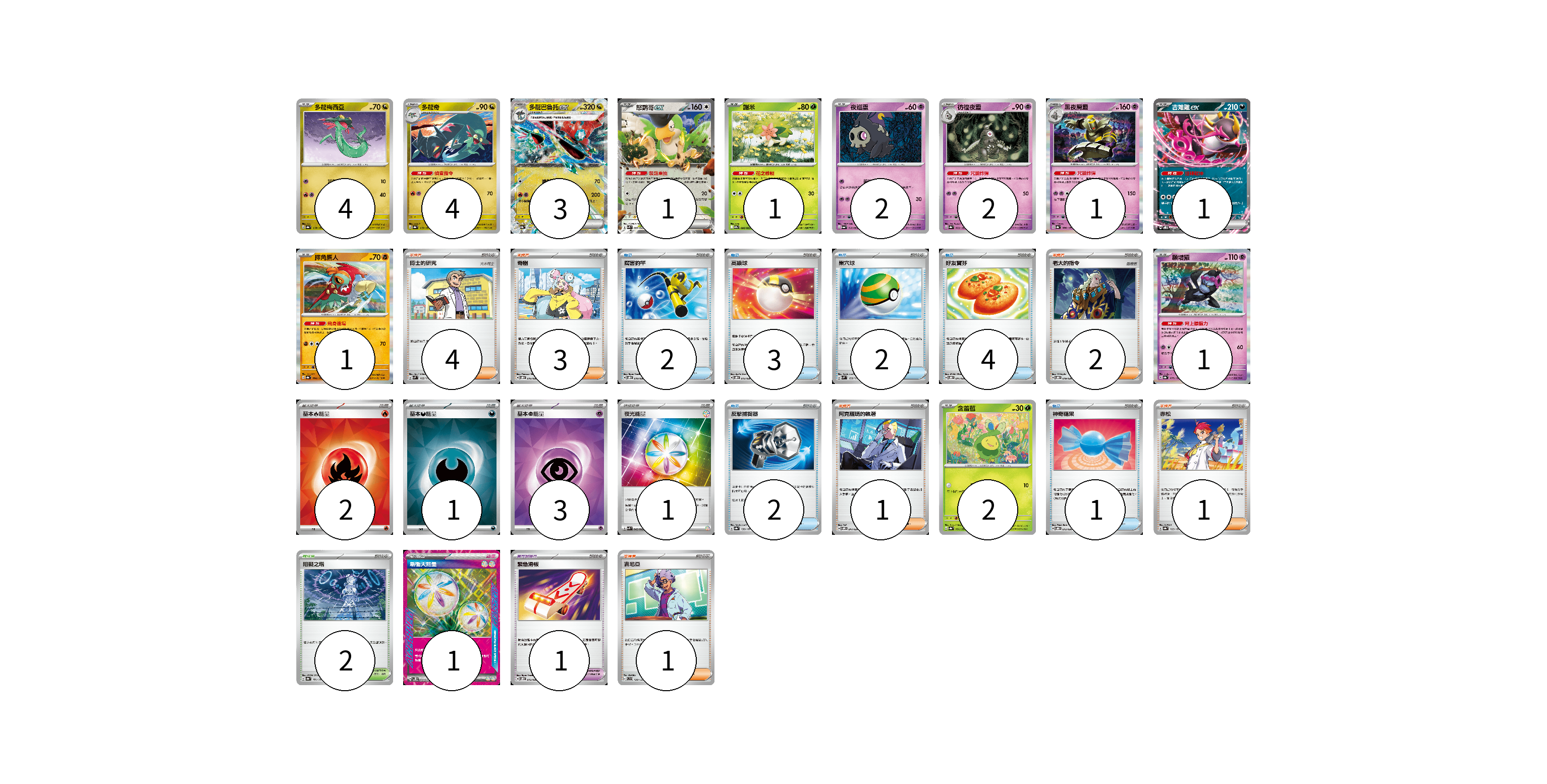 牌組構築方案 以此牌組為基礎新構築牌組 顯示卡面 顯示列表 寶可夢卡(23) 4 4 3 1 1 2 2 1 1 1 1 2 寶可夢道具(1) 1 物品卡(14) 2 3 2 4 2 1 支援者卡(12) 4 3 2 1 1 1 競技場卡(2) 2 能量卡(8) 2 1 3 1 1 寶可夢卡(23) 卡牌名稱 張數 卡牌名稱 張數 多龍梅西亞 SV8a 118/187 04 多龍奇 SV8a 119/187 04 多龍巴魯托ex SV8a 120/187 03 怒鸚哥ex SVK 006/042 01 謝米 SV9a 006/063 01 夜巡靈 SV6a 018/064 02 彷徨夜靈 SV8a 065/187 02 黑夜魔靈 SV8a 066/187 01 吉雉雞ex SVOD 004/020 01 摔角鷹人 SV8a 084/187 01 願增猿 SV8a 075/187 01 含羞苞 SV8a 001/187 02 寶可夢道具(1) 卡牌名稱 張數 卡牌名稱 張數 緊急滑板 SVOD 015/020 01 物品卡(14) 卡牌名稱 張數 卡牌名稱 張數 厲害釣竿 SVOD 010/020 02 高級球 SVOD 012/020 03 巢穴球 SVM 133/175 02 好友寶芬 SVOD 011/020 04 反擊捕捉器 SV8a 139/187 02 神奇糖果 SVOD 013/020 01 支援者卡(12) 卡牌名稱 張數 卡牌名稱 張數 博士的研究 SVM 162/175 04 奇樹 SVOD 016/020 03 老大的指令 SVOD 019/020 02 阿克羅瑪的執著 SVOM 017/021 01 赤松 SV8a 163/187 01 吉尼亞 SVD 129/139 01 競技場卡(2) 卡牌名稱 張數 卡牌名稱 張數 阻礙之塔 SV8a 181/187 02 能量卡(8) 卡牌名稱 張數 卡牌名稱 張數 基本【火】能量 SVK FIR 02 基本【惡】能量 SVOM DAR 01 基本【超】能量 SVOD PSY 03 夜光能量 SVK 042/042 01 新衝天能量 SV5K 071/071 01 以此牌組為基礎新構築牌組 牌組編碼 ocKEeX-WatrrQ-HpqIyF copy 列印牌組單 牌組編碼已複製 分享至SNS