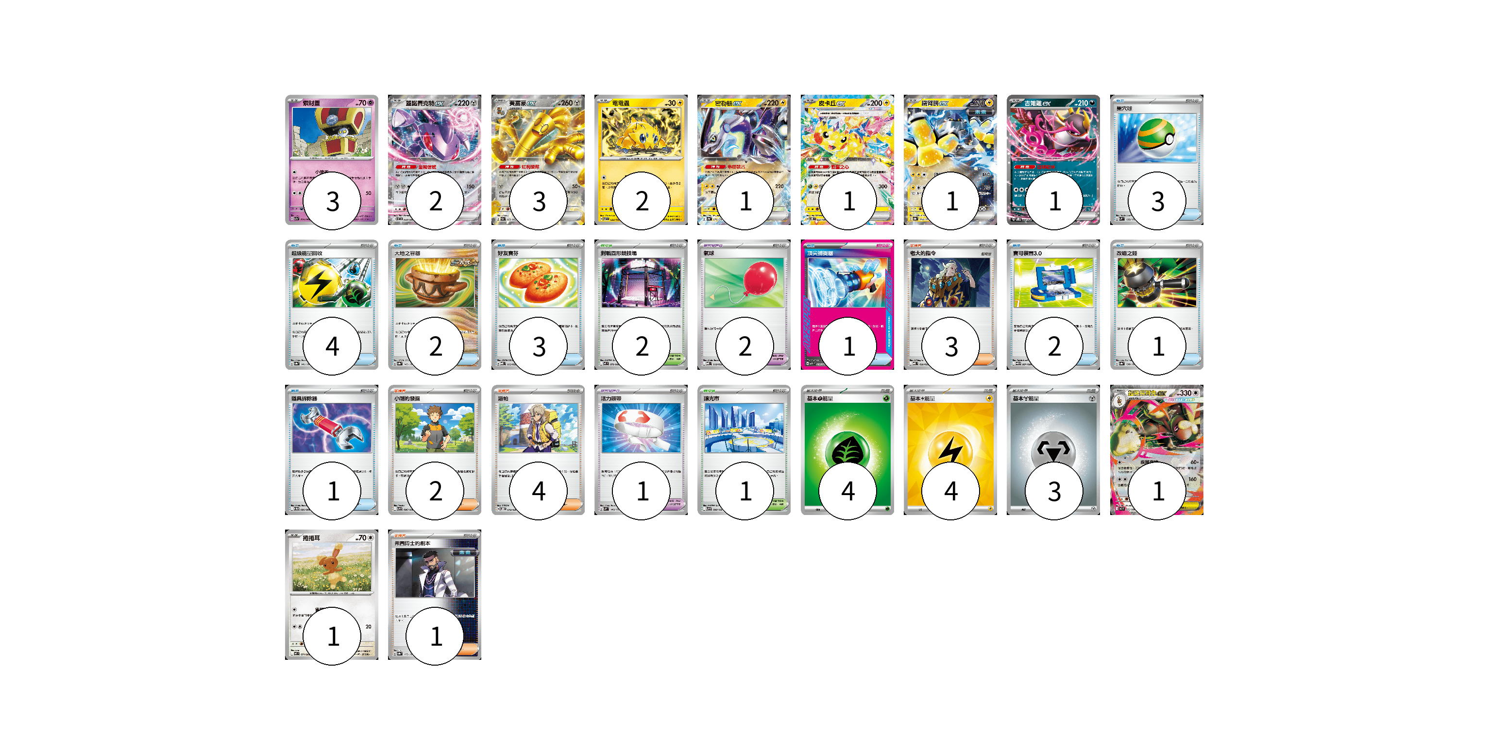 牌組構築方案 以此牌組為基礎新構築牌組 顯示卡面 顯示列表 寶可夢卡(16) 3 2 3 2 1 1 1 1 1 1 寶可夢道具(3) 2 1 物品卡(17) 3 4 2 3 1 2 1 1 支援者卡(10) 3 2 4 1 競技場卡(3) 2 1 能量卡(11) 4 4 3 寶可夢卡(16) 卡牌名稱 張數 卡牌名稱 張數 索財靈 SV7a 024/064 03 蓋諾賽克特ex SV11B 069/086 02 賽富豪ex SV3a 050/062 03 電電蟲 SV7 032/102 02 密勒頓ex SV4a 071/190 01 皮卡丘ex SV8 033/106 01 鐵臂膀ex SV8a 054/187 01 吉雉雞ex SVOD 004/020 01 超級長耳兔ex M2 072/080 01 捲捲耳 M2 071/080 01 寶可夢道具(3) 卡牌名稱 張數 卡牌名稱 張數 氣球 MBD 018/022 02 活力頭帶 SVM 140/175 01 物品卡(17) 卡牌名稱 張數 卡牌名稱 張數 巢穴球 SVM 133/175 03 超級能量回收 SV8a 141/187 04 大地之容器 SV8a 143/187 02 好友寶芬 MBD 013/022 03 頂尖捕捉器 MBG 014/022 01 寶可裝置3.0 SV11B 081/086 02 改造之錘 SV8a 138/187 01 道具拆除器 SV11W 080/086 01 支援者卡(10) 卡牌名稱 張數 卡牌名稱 張數 老大的指令 MBD 020/022 03 小剛的發掘 SV9 096/100 02 派帕 SVOD 018/020 04 弗圖博士的劇本 SV8a 175/187 01 競技場卡(3) 卡牌名稱 張數 卡牌名稱 張數 對戰圓形競技場 M2 079/080 02 釀光市 SV9 098/100 01 能量卡(11) 卡牌名稱 張數 卡牌名稱 張數 基本【草】能量 M-P GRA 04 基本【雷】能量 SVQP LIG 04 基本【鋼】能量 M-P MET 03 以此牌組為基礎新構築牌組 牌組編碼 odHDIQ-GdswWl-QkscBv copy 列印牌組單 牌組編碼已複製 分享至SNS