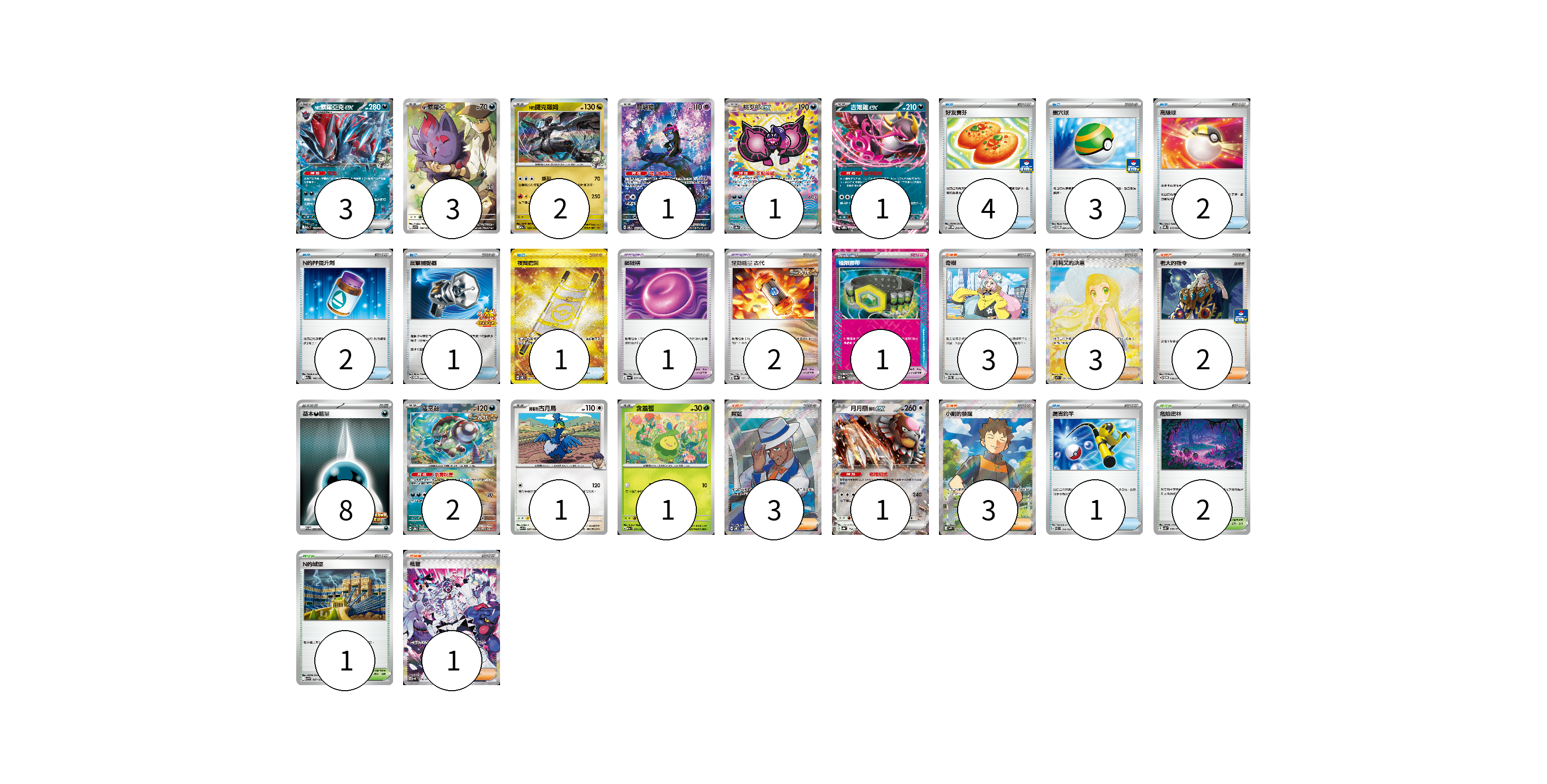 牌組構築方案 以此牌組為基礎新構築牌組 顯示卡面 顯示列表 寶可夢卡(17) 3 3 2 1 1 1 2 1 1 1 1 寶可夢道具(4) 1 2 1 物品卡(13) 4 3 2 2 1 1 支援者卡(15) 3 3 2 3 3 1 競技場卡(3) 2 1 能量卡(8) 8 寶可夢卡(17) 卡牌名稱 張數 卡牌名稱 張數 N的索羅亞克ex M2a 112/193 03 N的索羅亞 SV9 108/100 03 N的捷克羅姆 M2a 129/193 02 願增猿 SV6 107/101 01 桃歹郎ex SV8a 219/187 01 吉雉雞ex SVOD 004/020 01 猛惡菇 SV8a 099/187 02 赫普的古月鳥 SV9 087/100 01 含羞苞 M2a 011/193 01 月月熊 赫月ex SV8a 134/187 01 厲害釣竿 SVEL 010/020 01 寶可夢道具(4) 卡牌名稱 張數 卡牌名稱 張數 鎖鏈糬 SV6a 057/064 01 驅勁能量 古代 SV8a 157/187 02 極限腰帶 SV8a 159/187 01 物品卡(13) 卡牌名稱 張數 卡牌名稱 張數 好友寶芬 SV-P 212/SV-P 04 巢穴球 SV-P 091/SV-P 03 高級球 SVQL 015/022 02 N的PP提升劑 M2a 146/193 02 反擊捕捉器 SV-P 083/SV-P 01 夜間擔架 SV8 137/106 01 支援者卡(15) 卡牌名稱 張數 卡牌名稱 張數 奇樹 SVEM 017/020 03 莉莉艾的決意 M1L 091/063 03 老大的指令 SV-P 178/SV-P 02 席藍 SV8 127/106 03 小剛的發掘 SV9 123/100 03 枇琶 SV5K 096/071 01 競技場卡(3) 卡牌名稱 張數 卡牌名稱 張數 危險密林 SV5K 070/071 02 N的城堡 SV9 097/100 01 能量卡(8) 卡牌名稱 張數 卡牌名稱 張數 基本【惡】能量 SV-P 263/SV-P 08 以此牌組為基礎新構築牌組 牌組編碼 odoGdw-eTVEUc-LeQcSD copy 列印牌組單 牌組編碼已複製 分享至SNS