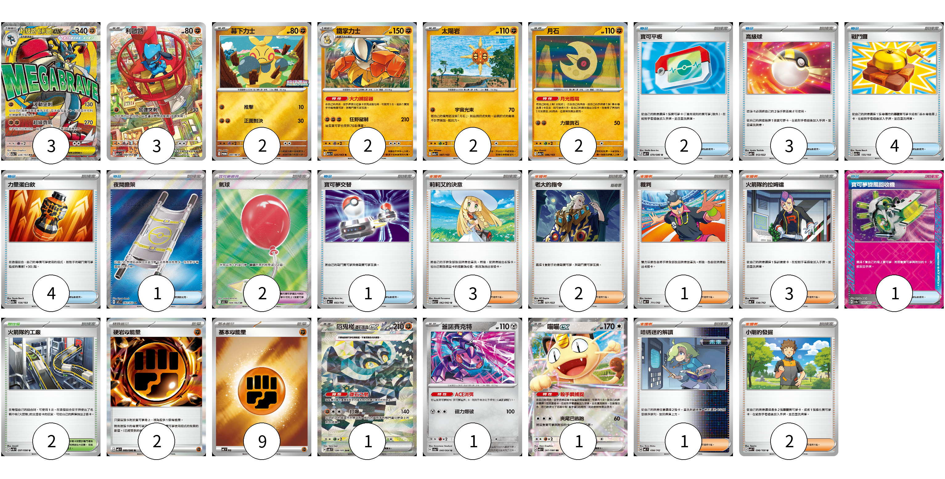 牌組構築方案 以此牌組為基礎新構築牌組 顯示卡面 顯示列表 寶可夢卡(17) 3 3 2 2 2 2 1 1 1 寶可夢道具(2) 2 物品卡(16) 2 3 4 4 1 1 1 支援者卡(12) 3 2 1 3 1 2 競技場卡(2) 2 能量卡(11) 2 9 寶可夢卡(17) 卡牌名稱 張數 卡牌名稱 張數 超級路卡利歐ex M2a 228/193 03 利歐路 M1L 068/063 03 幕下力士 M-P 007/M-P 02 鐵掌力士 M1L 025/063 02 太陽岩 M2a 087/193 02 月石 M2a 086/193 02 厄鬼椪 礎石面具ex SV6 128/101 01 蓋諾賽克特 SV6a 040/064 01 喵喵ex M3 061/080 01 寶可夢道具(2) 卡牌名稱 張數 卡牌名稱 張數 氣球 M1L 084/063 02 物品卡(16) 卡牌名稱 張數 卡牌名稱 張數 寶可平板 M3 070/080 02 高級球 MBG 012/022 03 戰鬥鑼 M2a 155/193 04 力量蛋白飲 M2a 154/193 04 夜間擔架 M1L 083/063 01 寶可夢交替 MC 663/742 01 寶可夢旋風回收機 SV8a 149/187 01 支援者卡(12) 卡牌名稱 張數 卡牌名稱 張數 莉莉艾的決意 M1L 062/063 03 老大的指令 MBG 021/022 02 裁判 MC 711/742 01 火箭隊的拉姆達 MC 734/742 03 暗碼迷的解讀 MC 698/742 01 小剛的發掘 SV9 096/100 02 競技場卡(2) 卡牌名稱 張數 卡牌名稱 張數 火箭隊的工廠 SV10 097/098 02 能量卡(11) 卡牌名稱 張數 卡牌名稱 張數 硬岩【鬥】能量 M3 080/080 02 基本【鬥】能量 MC FIG 09 以此牌組為基礎新構築牌組 牌組編碼 odwdEu-xTmLqB-HuHmst copy 列印牌組單 牌組編碼已複製 分享至SNS