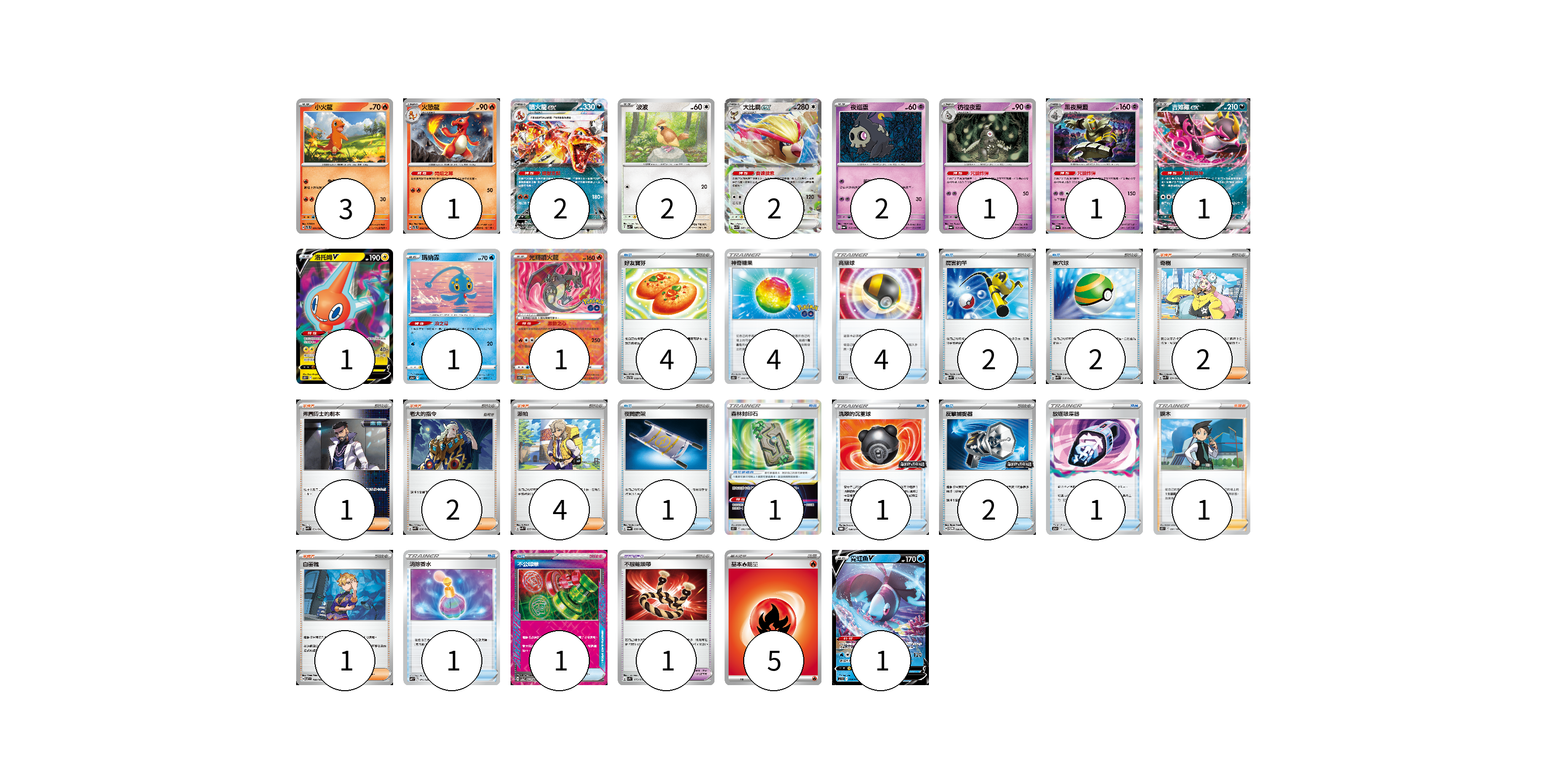 牌組構築方案 以此牌組為基礎新構築牌組 顯示卡面 顯示列表 寶可夢卡(19) 3 1 2 2 2 2 1 1 1 1 1 1 1 寶可夢道具(2) 1 1 物品卡(23) 4 4 4 2 2 1 1 2 1 1 1 支援者卡(11) 2 1 2 4 1 1 能量卡(5) 5 寶可夢卡(19) 卡牌名稱 張數 卡牌名稱 張數 小火龍 SVTL 001/021 03 火恐龍 SVTL 002/021 01 噴火龍ex SV3 066/108 02 波波 SV3 087/108 02 大比鳥ex SV3 089/108 02 夜巡靈 SV6a 018/064 02 彷徨夜靈 SV6a 019/064 01 黑夜魔靈 SV6a 020/064 01 吉雉雞ex SV6a 038/064 01 洛托姆V S11 037/100 01 瑪納霏 S12a 029/172 01 光輝噴火龍 S10b 011/071 01 霓虹魚V SVHK 004/022 01 寶可夢道具(2) 卡牌名稱 張數 卡牌名稱 張數 森林封印石 S12 092/098 01 不服輸頭帶 SV1S 073/078 01 物品卡(23) 卡牌名稱 張數 卡牌名稱 張數 好友寶芬 SVTH 009/018 04 神奇糖果 S10b 066/071 04 高級球 SK 015/030 04 厲害釣竿 SVK 011/042 02 巢穴球 SVK 016/042 02 夜間擔架 SV6a 056/064 01 洗翠的沉重球 SV-P 138/SV-P 01 反擊捕捉器 SV-P 136/SV-P 02 放逐吸塵器 S12a 144/172 01 消除香水 SVF 011/038 01 不公印章 SV5a 053/066 01 支援者卡(11) 卡牌名稱 張數 卡牌名稱 張數 奇樹 SVK 031/042 02 弗圖博士的劇本 SVK 034/042 01 老大的指令 SVK 036/042 02 派帕 SVK 035/042 04 捩木 S11 097/100 01 白蕾雅 SV7 100/102 01 能量卡(5) 卡牌名稱 張數 卡牌名稱 張數 基本火能量 sv-p FIR 05 以此牌組為基礎新構築牌組 牌組編碼 ofgkaD-kQavTl-pEZwHu copy 列印牌組單 牌組編碼已複製 分享至SNS