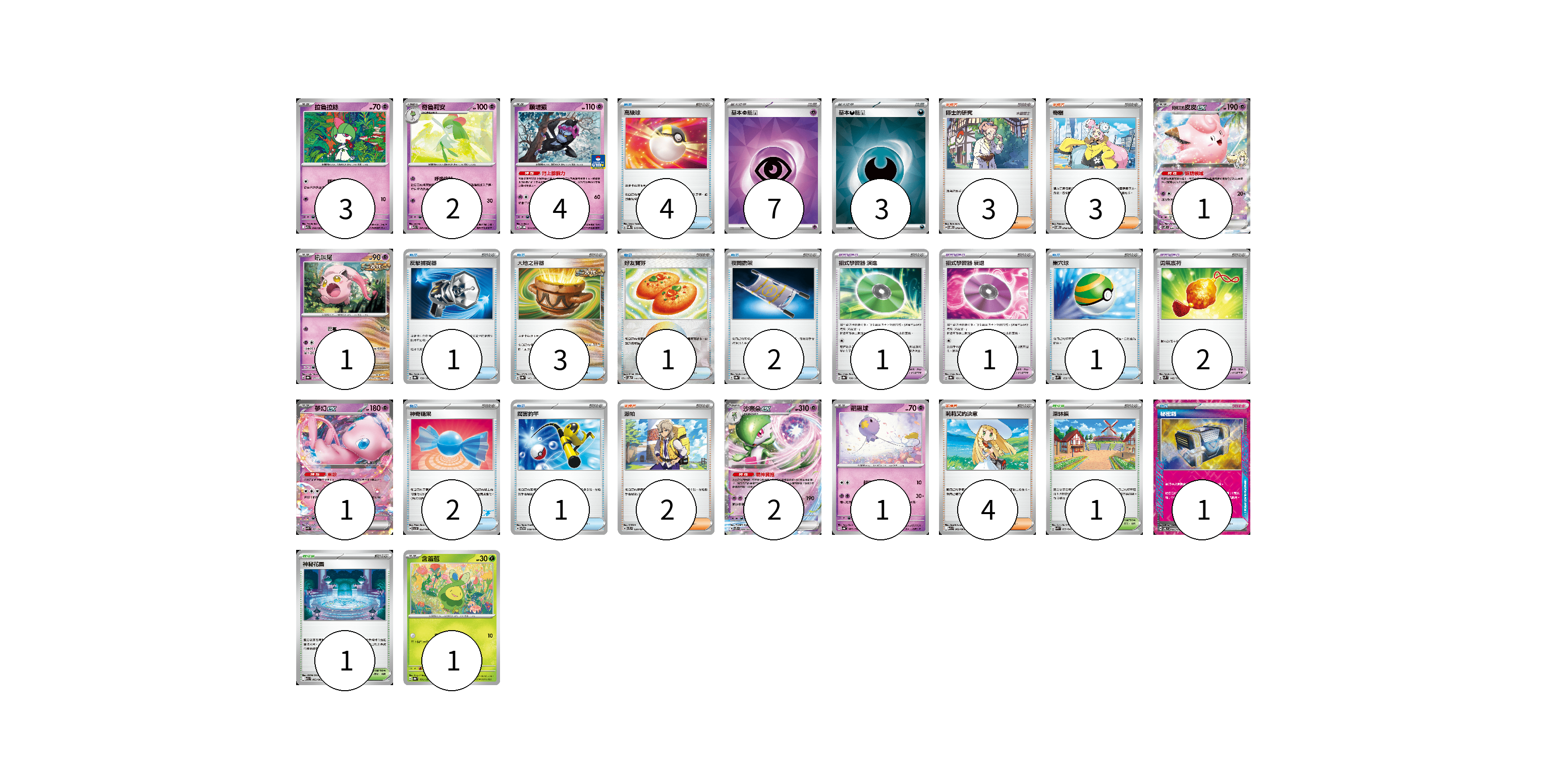 牌組構築方案 以此牌組為基礎新構築牌組 顯示卡面 顯示列表 寶可夢卡(16) 3 2 4 1 1 1 2 1 1 寶可夢道具(4) 1 1 2 物品卡(16) 4 1 3 1 2 1 2 1 1 支援者卡(12) 3 3 2 4 競技場卡(2) 1 1 能量卡(10) 7 3 寶可夢卡(16) 卡牌名稱 張數 卡牌名稱 張數 拉魯拉絲 M1S 040/063 03 奇魯莉安 M1S 041/063 02 願增猿 M-P 014/M-P 04 莉莉艾的皮皮ex SV9 033/100 01 吼叫尾 SV8a 071/187 01 夢幻ex SVK 001/042 01 沙奈朵ex SVTS 004/022 02 飄飄球 SV4a 083/190 01 含羞苞 SV8a 001/187 01 寶可夢道具(4) 卡牌名稱 張數 卡牌名稱 張數 招式學習器 演進 SV8a 160/187 01 招式學習器 衰退 SV8a 161/187 01 勇氣護符 SVM 142/175 02 物品卡(16) 卡牌名稱 張數 卡牌名稱 張數 高級球 SVQL 015/022 04 反擊捕捉器 SV8a 139/187 01 大地之容器 SV8a 143/187 03 好友寶芬 SV8a 147/187 01 夜間擔架 SV8a 151/187 02 巢穴球 SVM 133/175 01 神奇糖果 SVI 053/066 02 厲害釣竿 SVTG 009/019 01 秘密箱 SV6 092/101 01 支援者卡(12) 卡牌名稱 張數 卡牌名稱 張數 博士的研究 SVOM 019/021 03 奇樹 SVOM 018/021 03 派帕 SVTL 020/021 02 莉莉艾的決意 M1L 062/063 04 競技場卡(2) 卡牌名稱 張數 卡牌名稱 張數 深缽鎮 SVK 039/042 01 神秘花園 M1S 063/063 01 能量卡(10) 卡牌名稱 張數 卡牌名稱 張數 基本【超】能量 SVOD PSY 07 基本【惡】能量 SVOM DAR 03 以此牌組為基礎新構築牌組 牌組編碼 ofmPdl-UtLabw-QiRkfW copy 列印牌組單 牌組編碼已複製 分享至SNS