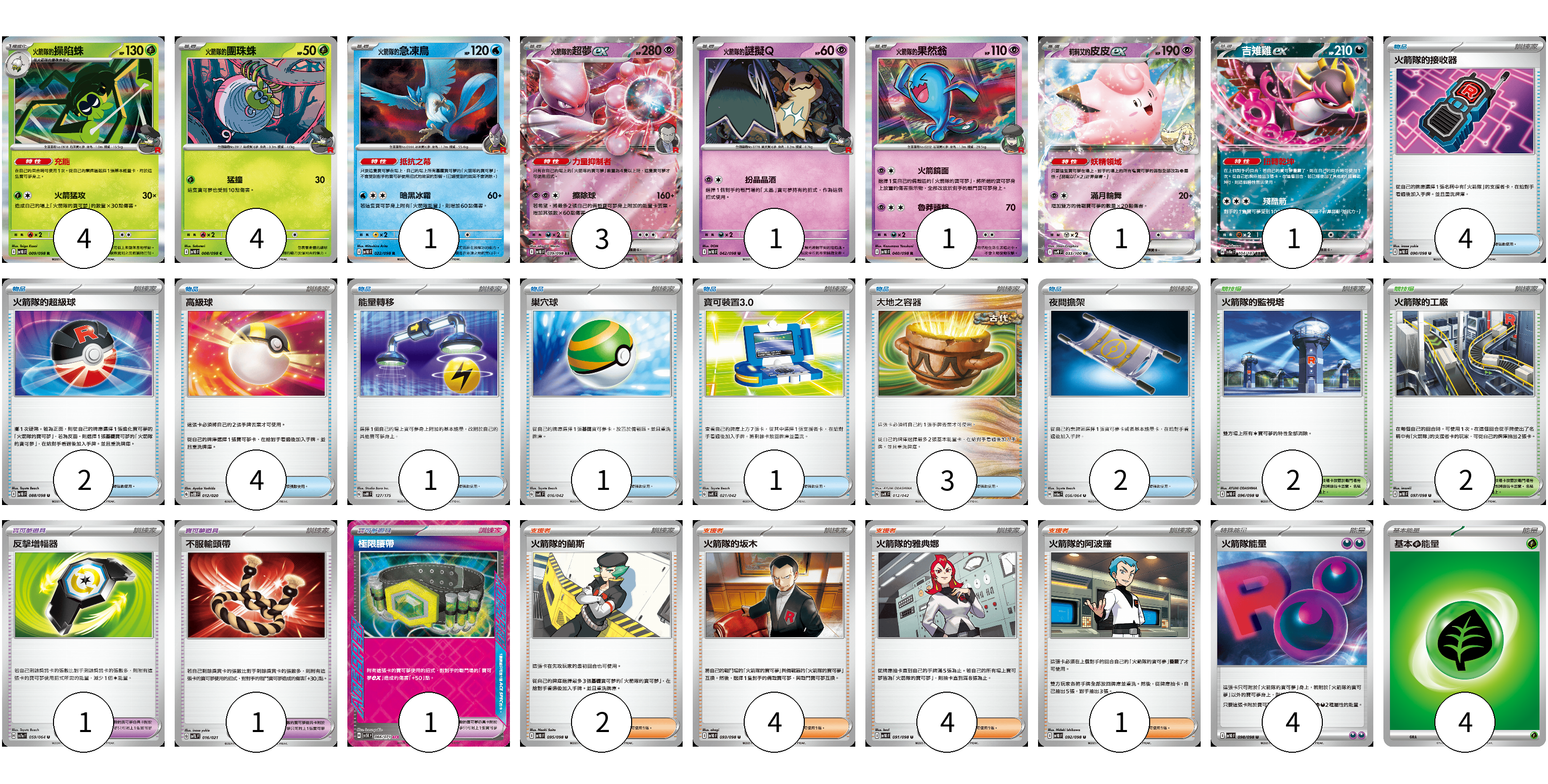 牌組構築方案 以此牌組為基礎新構築牌組 顯示卡面 顯示列表 寶可夢卡(16) 4 4 1 3 1 1 1 1 寶可夢道具(3) 1 1 1 物品卡(18) 4 2 4 1 1 1 3 2 支援者卡(11) 2 4 4 1 競技場卡(4) 2 2 能量卡(8) 4 4 寶可夢卡(16) 卡牌名稱 張數 卡牌名稱 張數 <火箭隊的>操陷蛛 SV10 009/098 04 <火箭隊的>團珠蛛 SV10 008/098 04 <火箭隊的>急凍鳥 SV10 022/098 01 <火箭隊的>超夢ex SV10 039/098 03 <火箭隊的>謎擬Q SV10 042/098 01 <火箭隊的>果然翁 SV10 040/098 01 莉莉艾的皮皮ex SV9 033/100 01 吉雉雞ex SV8a 104/187 01 寶可夢道具(3) 卡牌名稱 張數 卡牌名稱 張數 反擊增幅器 SV7a 059/064 01 不服輸頭帶 SVTL 016/021 01 極限腰帶 SV5K 066/071 01 物品卡(18) 卡牌名稱 張數 卡牌名稱 張數 火箭隊的接收器 SV10 090/098 04 火箭隊的超級球 SV10 088/098 02 高級球 SVOD 012/020 04 能量轉移 SVM 127/175 01 巢穴球 SVK 016/042 01 寶可裝置3.0 SVK 021/042 01 大地之容器 SVK 012/042 03 夜間擔架 SV6a 056/064 02 支援者卡(11) 卡牌名稱 張數 卡牌名稱 張數 火箭隊的蘭斯 SV10 095/098 02 火箭隊的坂木 SV10 093/098 04 火箭隊的雅典娜 SV10 091/098 04 火箭隊的阿波羅 SV10 092/098 01 競技場卡(4) 卡牌名稱 張數 卡牌名稱 張數 火箭隊的監視塔 SV10 096/098 02 火箭隊的工廠 SV10 097/098 02 能量卡(8) 卡牌名稱 張數 卡牌名稱 張數 火箭隊能量 SV10 098/098 04 基本【草】能量 SVTM GRA 04 以此牌組為基礎新構築牌組 牌組編碼 ogRyEy-wcvkZa-ylMJPe copy 列印牌組單 牌組編碼已複製 分享至SNS
