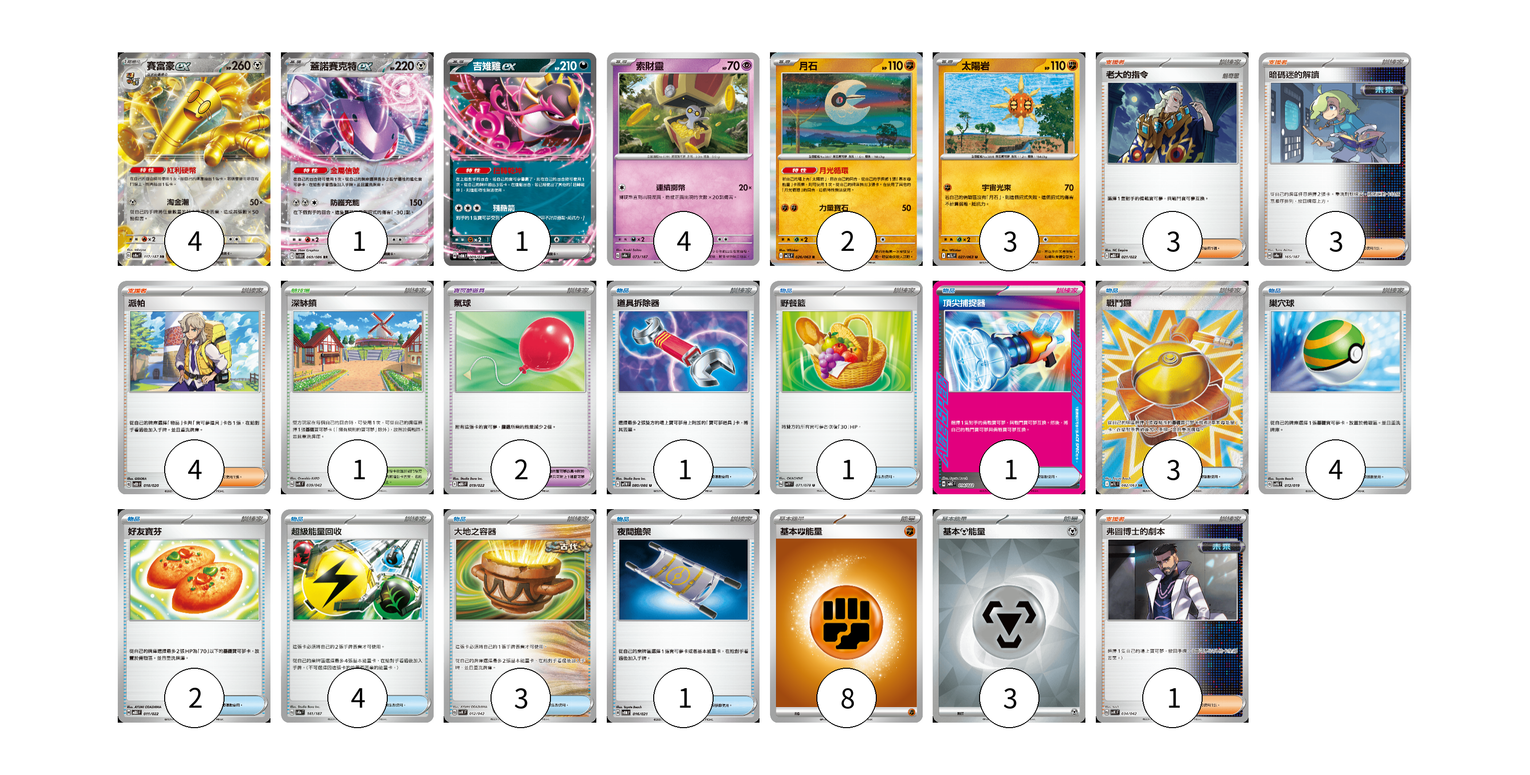 牌組構築方案 以此牌組為基礎新構築牌組 顯示卡面 顯示列表 寶可夢卡(15) 4 1 1 4 2 3 寶可夢道具(2) 2 物品卡(20) 1 1 1 3 4 2 4 3 1 支援者卡(11) 3 3 4 1 競技場卡(1) 1 能量卡(11) 8 3 寶可夢卡(15) 卡牌名稱 張數 卡牌名稱 張數 賽富豪ex SV8a 117/187 04 蓋諾賽克特ex SV11B 069/086 01 吉雉雞ex SVOM 009/021 01 索財靈 SV8a 073/187 04 月石 M1L 026/063 02 太陽岩 M1L 027/063 03 寶可夢道具(2) 卡牌名稱 張數 卡牌名稱 張數 氣球 MBG 019/022 02 物品卡(20) 卡牌名稱 張數 卡牌名稱 張數 道具拆除器 SV11W 080/086 01 野餐籃 SV1V 071/078 01 頂尖捕捉器 MBG 014/022 01 戰鬥鑼 M1L 082/063 03 巢穴球 SVTG 012/019 04 好友寶芬 MBG 011/022 02 超級能量回收 SV8a 141/187 04 大地之容器 SVK 012/042 03 夜間擔架 SVOM 016/021 01 支援者卡(11) 卡牌名稱 張數 卡牌名稱 張數 老大的指令 MBG 021/022 03 暗碼迷的解讀 SV8a 165/187 03 派帕 SVOD 018/020 04 弗圖博士的劇本 SVK 034/042 01 競技場卡(1) 卡牌名稱 張數 卡牌名稱 張數 深缽鎮 SVK 039/042 01 能量卡(11) 卡牌名稱 張數 卡牌名稱 張數 基本【鬥】能量 M-P FIG 08 基本【鋼】能量 SVOD MET 03 以此牌組為基礎新構築牌組 牌組編碼 oiRtnK-ihotWb-FcZWpe copy 列印牌組單 牌組編碼已複製 分享至SNS
