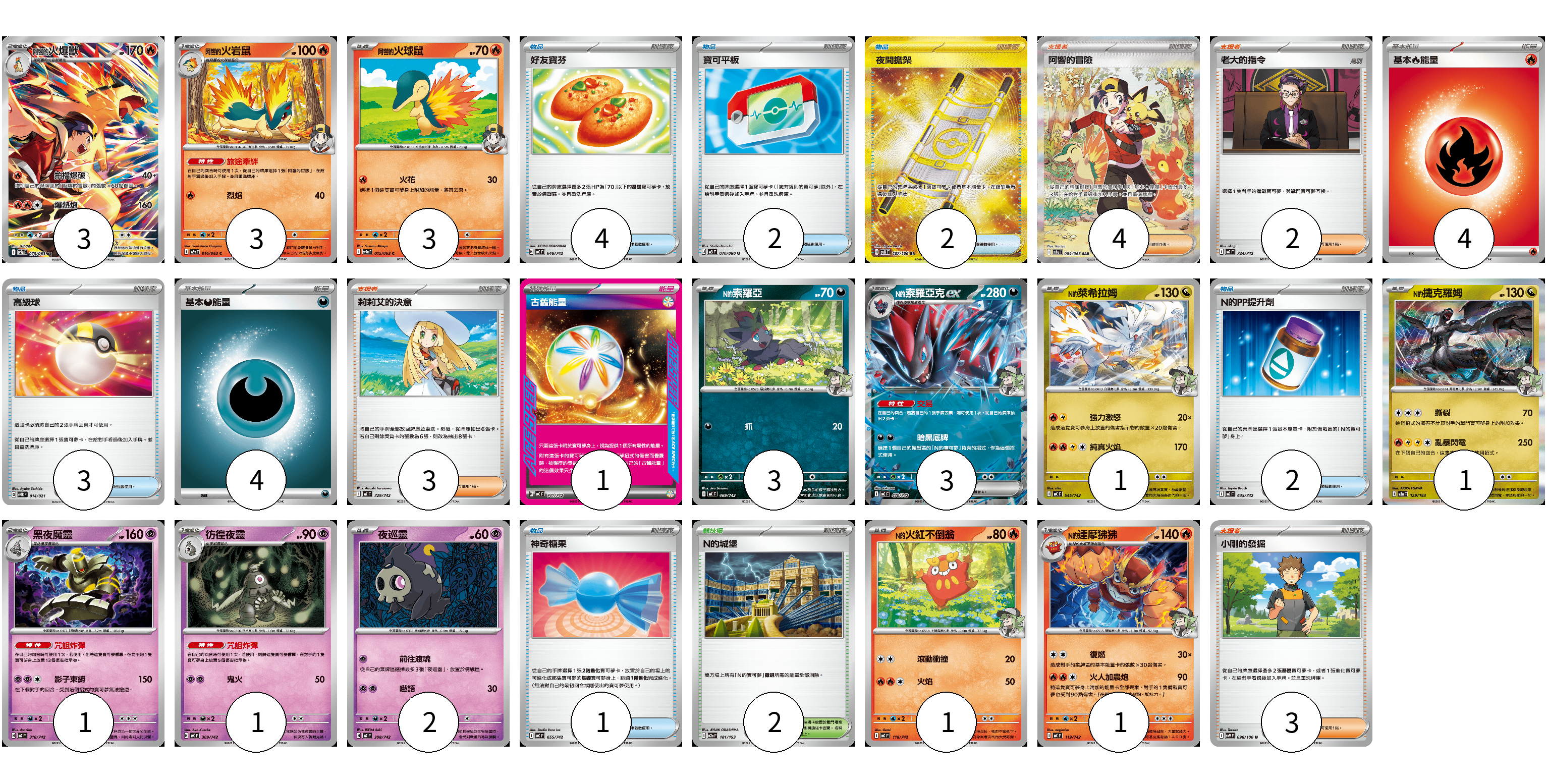 牌組構築方案 以此牌組為基礎新構築牌組 顯示卡面 顯示列表 寶可夢卡(23) 3 3 3 3 3 1 1 1 1 2 1 1 物品卡(14) 4 2 2 3 2 1 支援者卡(12) 4 2 3 3 競技場卡(2) 2 能量卡(9) 4 4 1 寶可夢卡(23) 卡牌名稱 張數 卡牌名稱 張數 <阿響的>火爆獸 SV9a 070/063 03 <阿響的>火岩鼠 SV9a 016/063 03 <阿響的>火球鼠 SV9a 015/063 03 <N的>索羅亞 MC 469/742 03 <N的>索羅亞克ex MC 470/742 03 <N的>萊希拉姆 MC 545/742 01 N的捷克羅姆 M2a 129/193 01 黑夜魔靈 MC 310/742 01 彷徨夜靈 MC 309/742 01 夜巡靈 MC 308/742 02 N的火紅不倒翁 MC 118/742 01 N的達摩狒狒 MC 119/742 01 物品卡(14) 卡牌名稱 張數 卡牌名稱 張數 好友寶芬 MC 648/742 04 寶可平板 M3 070/080 02 夜間擔架 SV8 137/106 02 高級球 SVTR 014/021 03 N的PP提升劑 MC 635/742 02 神奇糖果 MC 655/742 01 支援者卡(12) 卡牌名稱 張數 卡牌名稱 張數 阿響的冒險 SV9a 089/063 04 老大的指令 MC 724/742 02 莉莉艾的決意 MC 729/742 03 小剛的發掘 SV9 096/100 03 競技場卡(2) 卡牌名稱 張數 卡牌名稱 張數 N的城堡 M2a 181/193 02 能量卡(9) 卡牌名稱 張數 卡牌名稱 張數 基本【火】能量 MC FIR 04 基本【惡】能量 MC DAR 04 古舊能量 MC 741/742 01 以此牌組為基礎新構築牌組 牌組編碼 okzXOP-XeJKOv-kuVovd copy 列印牌組單 牌組編碼已複製 分享至SNS