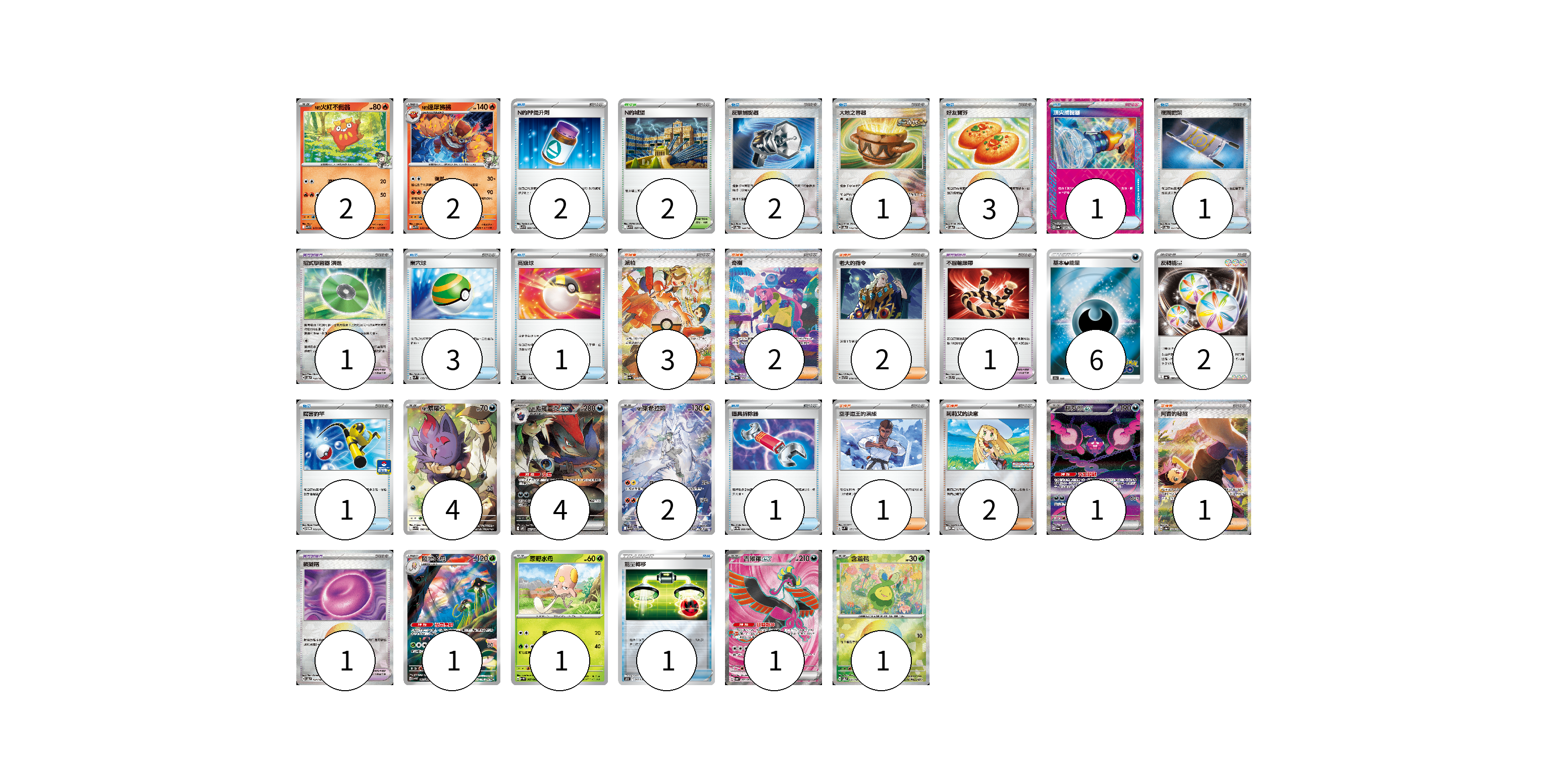 牌組構築方案 以此牌組為基礎新構築牌組 顯示卡面 顯示列表 寶可夢卡(19) 2 2 4 4 2 1 1 1 1 1 寶可夢道具(3) 1 1 1 物品卡(17) 2 2 1 3 1 1 3 1 1 1 1 支援者卡(11) 3 2 2 1 2 1 競技場卡(2) 2 能量卡(8) 6 2 寶可夢卡(19) 卡牌名稱 張數 卡牌名稱 張數 N的火紅不倒翁 SV9 015/100 02 N的達摩狒狒 SV9 016/100 02 N的索羅亞 SV9 108/100 04 N的索羅亞克ex SV9 127/100 04 N的萊希拉姆 SV9 109/100 02 桃歹郎ex SV6a 090/064 01 陸地水母 SV4M 068/066 01 原野水母 SV4M 007/066 01 吉雉雞ex SV6a 081/064 01 含羞苞 SV8a 001/187 01 寶可夢道具(3) 卡牌名稱 張數 卡牌名稱 張數 招式學習器 演進 SV8a 160/187 01 不服輸頭帶 SVTL 016/021 01 鎖鏈糬 SV8a 154/187 01 物品卡(17) 卡牌名稱 張數 卡牌名稱 張數 N的PP提升劑 SV9 089/100 02 反擊捕捉器 SV8a 139/187 02 大地之容器 SV8a 143/187 01 好友寶芬 SV8a 147/187 03 頂尖捕捉器 SV8a 148/187 01 夜間擔架 SV8a 151/187 01 巢穴球 SVM 133/175 03 高級球 SVM 134/175 01 厲害釣竿 SV-P 112/SV-P 01 道具拆除器 SV11W 080/086 01 能量轉移 SO 017/030 01 支援者卡(11) 卡牌名稱 張數 卡牌名稱 張數 派帕 SV4a 353/190 03 奇樹 SV4a 350/190 02 老大的指令 SVTR 019/021 02 空手道王的演練 SVM 151/175 01 莉莉艾的決意 M-P 011/M-P 02 阿杏的秘招 SV8a 228/187 01 競技場卡(2) 卡牌名稱 張數 卡牌名稱 張數 N的城堡 SV9 097/100 02 能量卡(8) 卡牌名稱 張數 卡牌名稱 張數 基本惡能量 S10b DAR 06 反轉能量 SV4a 189/190 02 以此牌組為基礎新構築牌組 牌組編碼 olScBj-cUYdfg-rhPDCP copy 列印牌組單 牌組編碼已複製 分享至SNS