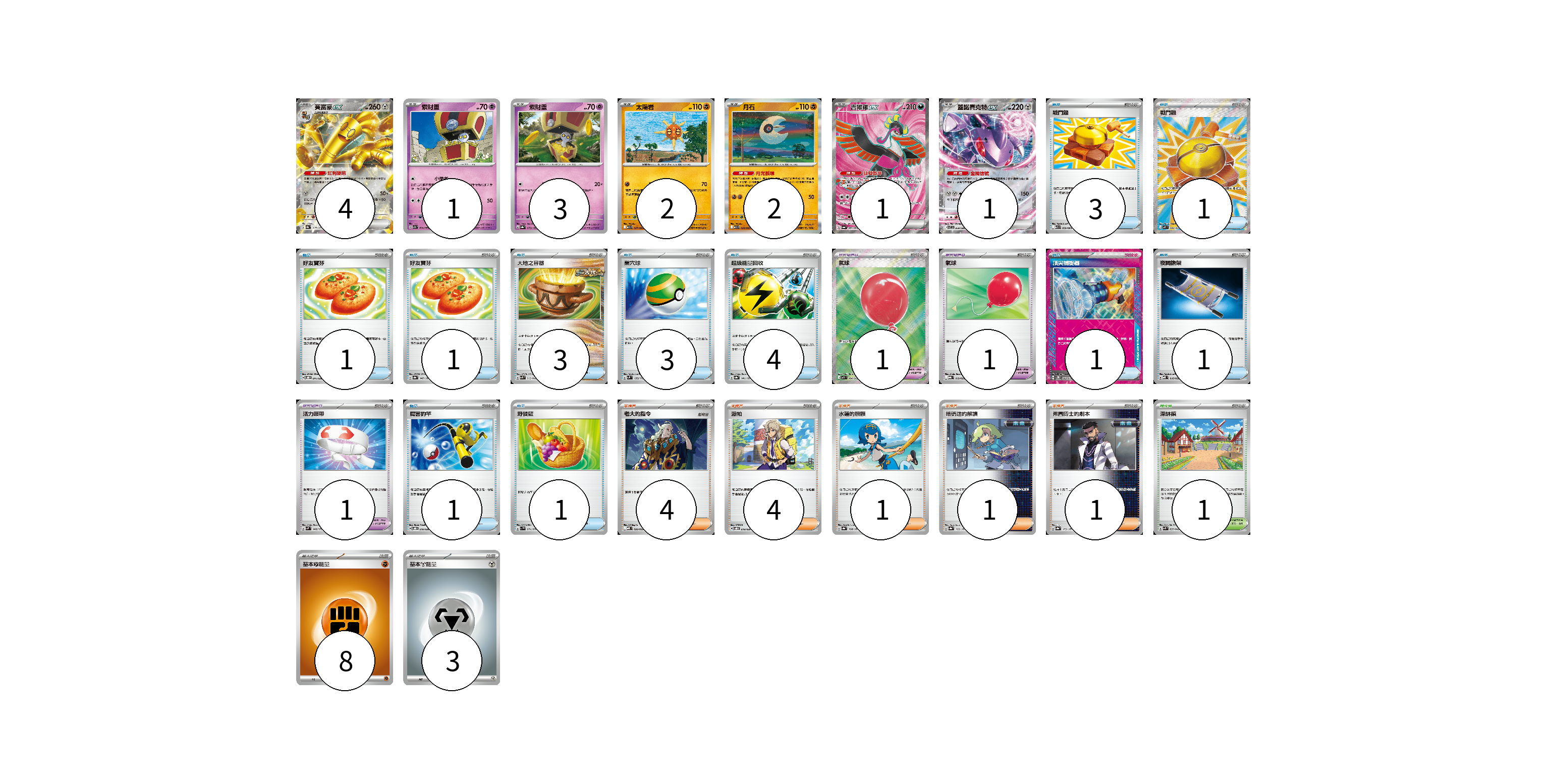 牌組構築方案 以此牌組為基礎新構築牌組 顯示卡面 顯示列表 寶可夢卡(14) 4 1 3 2 2 1 1 寶可夢道具(3) 1 1 1 物品卡(20) 3 1 1 1 3 3 4 1 1 1 1 支援者卡(11) 4 4 1 1 1 競技場卡(1) 1 能量卡(11) 8 3 寶可夢卡(14) 卡牌名稱 張數 卡牌名稱 張數 賽富豪ex SV8a 117/187 04 索財靈 SV7a 024/064 01 索財靈 SV8a 073/187 03 太陽岩 M1L 027/063 02 月石 M1L 026/063 02 吉雉雞ex SV6a 081/064 01 蓋諾賽克特ex SV11B 069/086 01 寶可夢道具(3) 卡牌名稱 張數 卡牌名稱 張數 氣球 M1L 084/063 01 氣球 MBG 019/022 01 活力頭帶 SVM 140/175 01 物品卡(20) 卡牌名稱 張數 卡牌名稱 張數 戰鬥鑼 M1L 059/063 03 戰鬥鑼 M1L 082/063 01 好友寶芬 SVOD 011/020 01 好友寶芬 SV8a 147/187 01 大地之容器 SVK 012/042 03 巢穴球 SVM 133/175 03 超級能量回收 SV8a 141/187 04 頂尖捕捉器 SV5M 062/071 01 夜間擔架 MBD 016/022 01 厲害釣竿 SVOD 010/020 01 野餐籃 SV1V 071/078 01 支援者卡(11) 卡牌名稱 張數 卡牌名稱 張數 老大的指令 MBD 020/022 04 派帕 SVOD 018/020 04 水蓮的照顧 SV8a 168/187 01 暗碼迷的解讀 SV8a 165/187 01 弗圖博士的劇本 SV8a 175/187 01 競技場卡(1) 卡牌名稱 張數 卡牌名稱 張數 深缽鎮 SVK 039/042 01 能量卡(11) 卡牌名稱 張數 卡牌名稱 張數 基本鬥能量 sv-p FIG 08 基本鋼能量 sv-p MET 03 以此牌組為基礎新構築牌組 牌組編碼 omMIvT-MMgbcx-oxmqvj copy 列印牌組單 牌組編碼已複製 分享至SNS