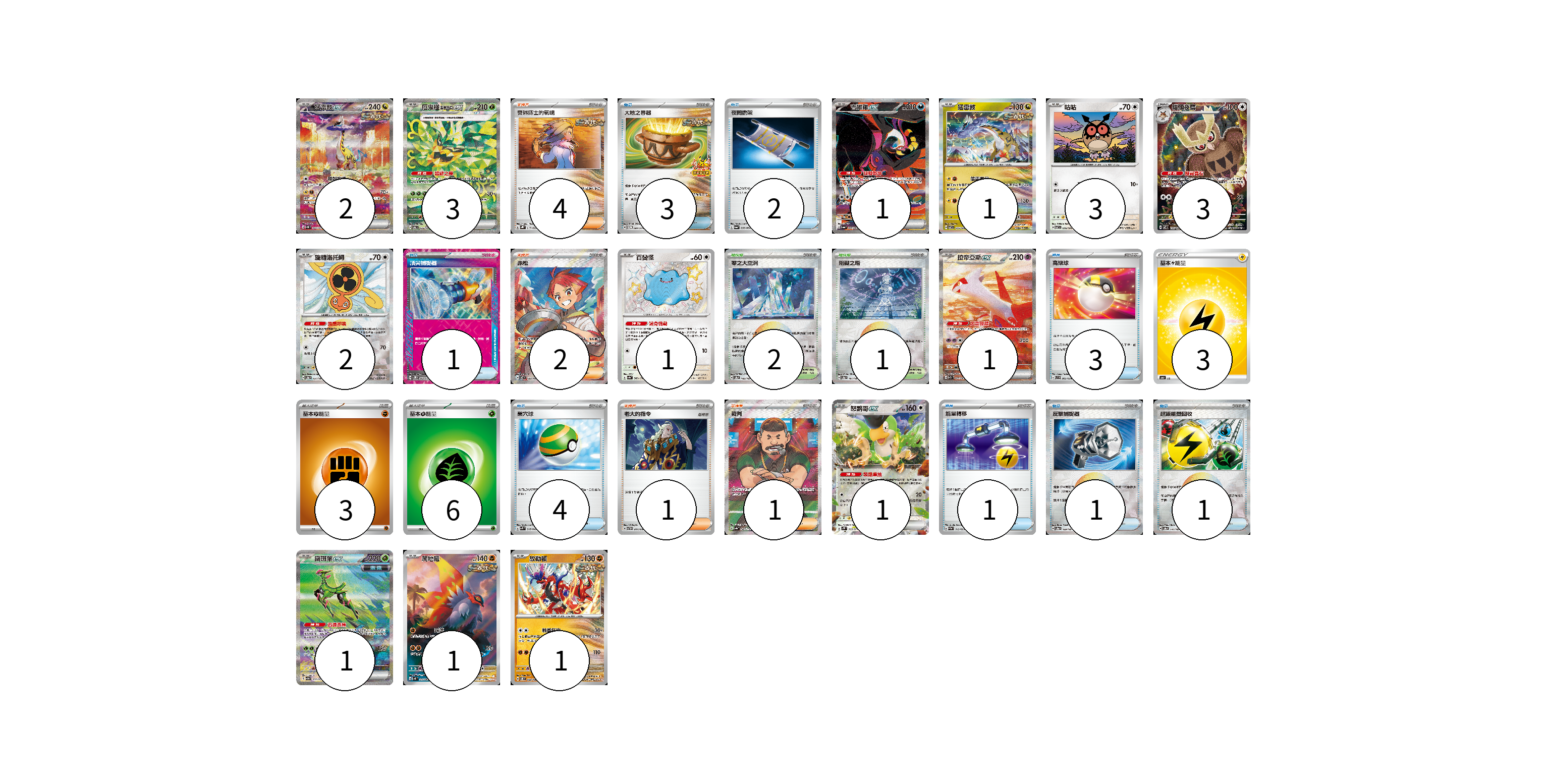 牌組構築方案 以此牌組為基礎新構築牌組 顯示卡面 顯示列表 寶可夢卡(21) 2 3 1 1 3 3 2 1 1 1 1 1 1 物品卡(16) 3 2 1 3 4 1 1 1 支援者卡(8) 4 2 1 1 競技場卡(3) 2 1 能量卡(12) 3 3 6 寶可夢卡(21) 卡牌名稱 張數 卡牌名稱 張數 猛雷鼓ex SV5K 095/071 02 厄鬼椪 碧草面具ex SV6 125/101 03 吉雉雞ex SV6a 089/064 01 猛雷鼓 SV7 075/102 01 咕咕 SV7 076/102 03 貓頭夜鷹 SV7 114/102 03 旋轉洛托姆 SV8a 131/187 02 百變怪 SV4a 309/190 01 拉帝亞斯ex SV7a 087/064 01 怒鸚哥ex SV2P 065/071 01 鐵斑葉ex SV5M 093/071 01 爬地翅 SV4K 074/066 01 故勒頓 SV8 069/106 01 物品卡(16) 卡牌名稱 張數 卡牌名稱 張數 大地之容器 SV-P 084/SV-P 03 夜間擔架 SV6a 056/064 02 頂尖捕捉器 SV5M 062/071 01 高級球 SVB 002/028 03 巢穴球 SVK 016/042 04 能量轉移 SVAM 012/023 01 反擊捕捉器 SV8a 139/187 01 超級能量回收 SV8a 141/187 01 支援者卡(8) 卡牌名稱 張數 卡牌名稱 張數 奧琳博士的氣魄 SVHK 017/022 04 赤松 SV7 123/102 02 老大的指令 SVTH 017/018 01 裁判 SV4a 342/190 01 競技場卡(3) 卡牌名稱 張數 卡牌名稱 張數 零之大空洞 SV8a 182/187 02 阻礙之塔 SV8a 181/187 01 能量卡(12) 卡牌名稱 張數 卡牌名稱 張數 基本雷能量 SN LIG 03 基本鬥能量 sv-p FIG 03 基本草能量 sv-p GRA 06 以此牌組為基礎新構築牌組 牌組編碼 ooOxdK-bPWxlg-XLGzFE copy 列印牌組單 牌組編碼已複製 分享至SNS