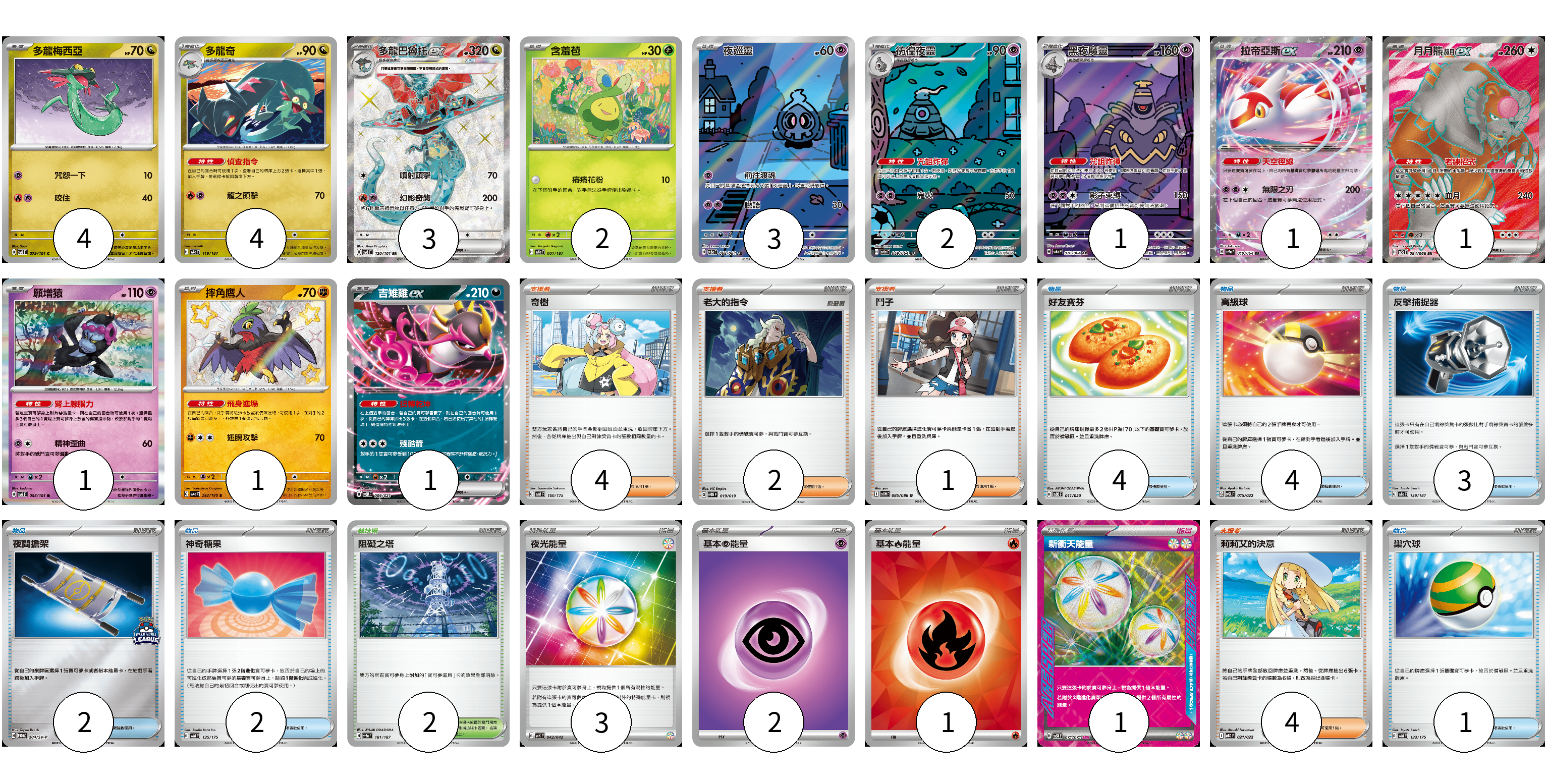 牌組構築方案 以此牌組為基礎新構築牌組 顯示卡面 顯示列表 寶可夢卡(24) 4 4 3 2 3 2 1 1 1 1 1 1 物品卡(16) 4 4 3 2 2 1 支援者卡(11) 4 2 1 4 競技場卡(2) 2 能量卡(7) 3 2 1 1 寶可夢卡(24) 卡牌名稱 張數 卡牌名稱 張數 多龍梅西亞 SV6 079/101 04 多龍奇 SV8a 119/187 04 多龍巴魯托ex SV6 120/101 03 含羞苞 SV8a 001/187 02 夜巡靈 SV6a 068/064 03 彷徨夜靈 SV6a 069/064 02 黑夜魔靈 SV6a 070/064 01 拉帝亞斯ex SV7a 019/064 01 月月熊 赫月 ex SV5a 084/066 01 願增猿 SV6 055/101 01 摔角鷹人 SV4a 282/190 01 吉雉雞ex SVOM 009/021 01 物品卡(16) 卡牌名稱 張數 卡牌名稱 張數 好友寶芬 SVOD 011/020 04 高級球 SVQL 015/022 04 反擊捕捉器 SV8a 139/187 03 夜間擔架 SV-P 204/SV-P 02 神奇糖果 SVM 135/175 02 巢穴球 SVM 133/175 01 支援者卡(11) 卡牌名稱 張數 卡牌名稱 張數 奇樹 SVM 160/175 04 老大的指令 SVTG 019/019 02 鬥子 SV11W 085/086 01 莉莉艾的決意 MBD 021/022 04 競技場卡(2) 卡牌名稱 張數 卡牌名稱 張數 阻礙之塔 SV8a 181/187 02 能量卡(7) 卡牌名稱 張數 卡牌名稱 張數 夜光能量 SVK 042/042 03 基本【超】能量 SVTS PSY 02 基本【火】能量 SVQL FIR 01 新衝天能量 SV5K 071/071 01 以此牌組為基礎新構築牌組 牌組編碼 oqPOVa-MfFdVf-iEzvDa copy 列印牌組單 牌組編碼已複製 分享至SNS