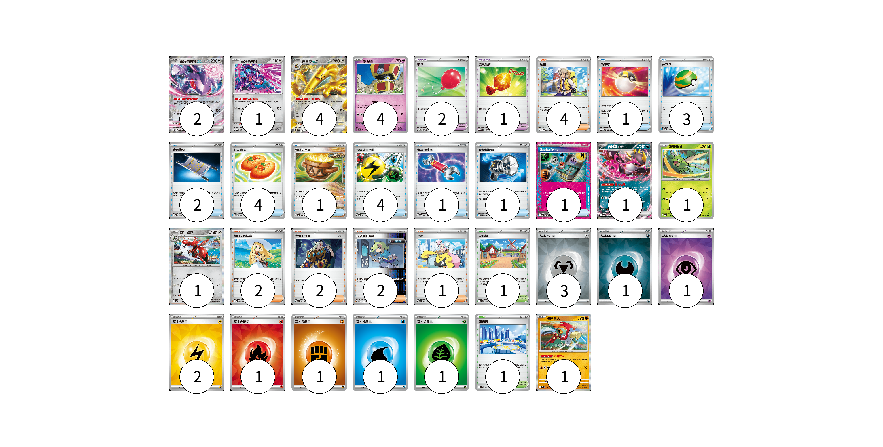 牌組構築方案 以此牌組為基礎新構築牌組 顯示卡面 顯示列表 寶可夢卡(15) 2 1 4 4 1 1 1 1 寶可夢道具(3) 2 1 物品卡(18) 1 3 2 4 1 4 1 1 1 支援者卡(11) 4 2 2 2 1 競技場卡(2) 1 1 能量卡(11) 3 1 1 2 1 1 1 1 寶可夢卡(15) 卡牌名稱 張數 卡牌名稱 張數 蓋諾賽克特ex SV11B 069/086 02 蓋諾賽克特 SV6a 040/064 01 賽富豪ex SV3a 050/062 04 索財靈 SV7a 024/064 04 吉雉雞ex SV8a 104/187 01 飛天螳螂 SV2a 123/165 01 巨鉗螳螂 SV4a 129/190 01 摔角鷹人 SV8a 084/187 01 寶可夢道具(3) 卡牌名稱 張數 卡牌名稱 張數 氣球 MBD 018/022 02 勇氣護符 SVM 142/175 01 物品卡(18) 卡牌名稱 張數 卡牌名稱 張數 高級球 MBD 014/022 01 巢穴球 SVHK 012/022 03 夜間擔架 MBD 016/022 02 好友寶芬 SVTG 011/019 04 大地之容器 SV4K 060/066 01 超級能量回收 SV8a 141/187 04 道具拆除器 SV11W 080/086 01 反擊捕捉器 SVTS 009/022 01 能量輸送PRO SV7a 052/064 01 支援者卡(11) 卡牌名稱 張數 卡牌名稱 張數 派帕 SVOD 018/020 04 莉莉艾的決意 M1L 062/063 02 老大的指令 SVM 172/175 02 暗碼迷的解讀 SV5M 067/071 02 奇樹 SVM 160/175 01 競技場卡(2) 卡牌名稱 張數 卡牌名稱 張數 深缽鎮 SVK 039/042 01 釀光市 SV9 098/100 01 能量卡(11) 卡牌名稱 張數 卡牌名稱 張數 基本【鋼】能量 SVOD MET 03 基本【惡】能量 SVOM DAR 01 基本【超】能量 SVOD PSY 01 基本【雷】能量 SVQP LIG 02 基本【火】能量 SVQL FIR 01 基本【鬥】能量 M-P FIG 01 基本【水】能量 SVF WAT 01 基本【草】能量 SVF GRA 01 以此牌組為基礎新構築牌組 牌組編碼 orKHSW-qtgrPn-URmjSa copy 列印牌組單 牌組編碼已複製 分享至SNS