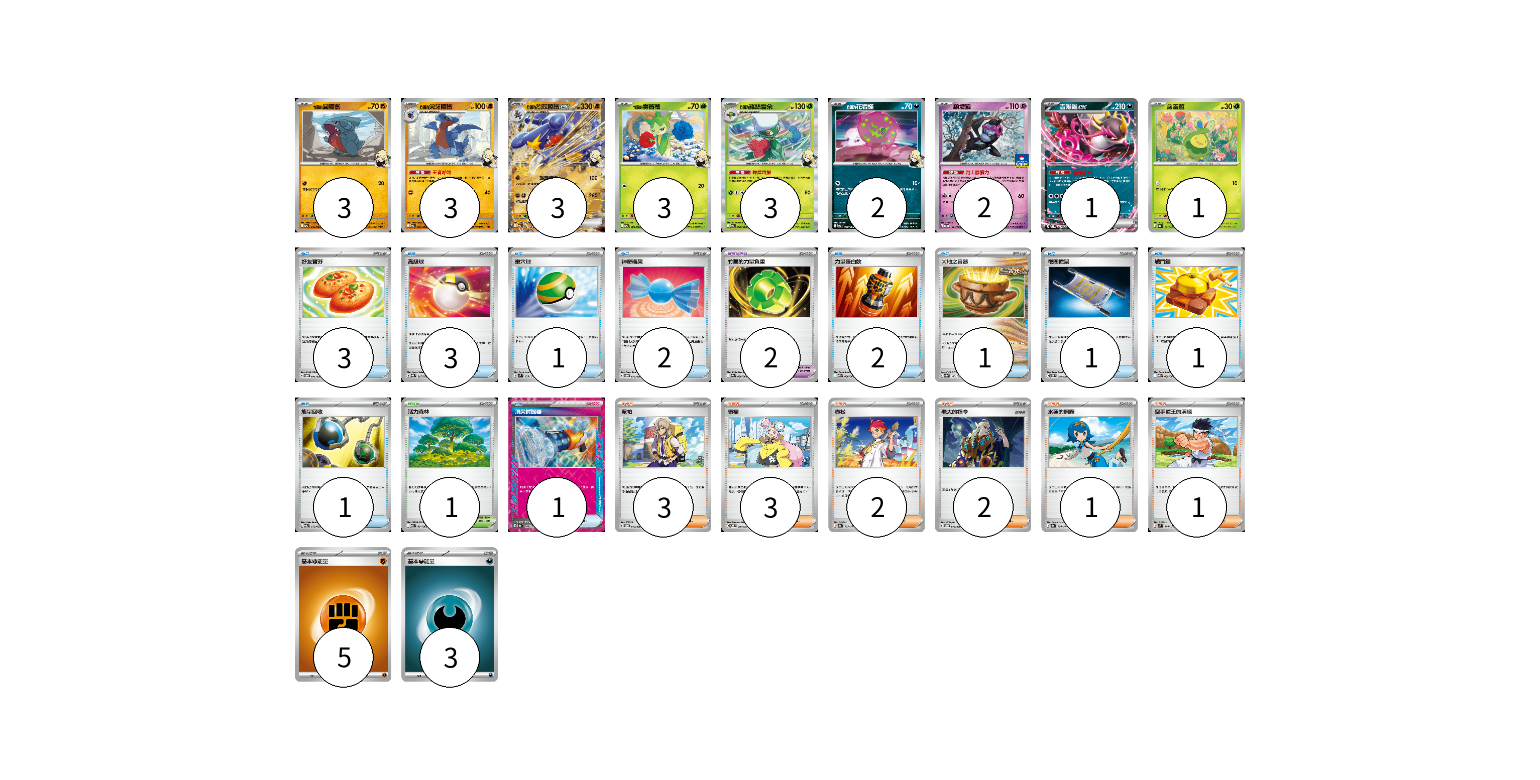 牌組構築方案 以此牌組為基礎新構築牌組 顯示卡面 顯示列表 寶可夢卡(21) 3 3 3 3 3 2 2 1 1 寶可夢道具(2) 2 物品卡(16) 3 3 1 2 2 1 1 1 1 1 支援者卡(12) 3 3 2 2 1 1 競技場卡(1) 1 能量卡(8) 5 3 寶可夢卡(21) 卡牌名稱 張數 卡牌名稱 張數 <竹蘭的>圓陸鯊 SV9a 042/063 03 <竹蘭的>尖牙陸鯊 SV9a 043/063 03 <竹蘭的>烈咬陸鯊ex SV9a 044/063 03 <竹蘭的>毒薔薇 SV9a 004/063 03 <竹蘭的>羅絲雷朵 SV9a 005/063 03 <竹蘭的>花岩怪 SV9a 050/063 02 願增猿 M-P 014/M-P 02 吉雉雞ex SVOD 004/020 01 含羞苞 SV8a 001/187 01 寶可夢道具(2) 卡牌名稱 張數 卡牌名稱 張數 竹蘭的力量負重 SV9a 060/063 02 物品卡(16) 卡牌名稱 張數 卡牌名稱 張數 好友寶芬 SVOD 011/020 03 高級球 SVQL 015/022 03 巢穴球 SVM 133/175 01 神奇糖果 SVOD 013/020 02 力量蛋白飲 M1L 058/063 02 大地之容器 SV8a 143/187 01 夜間擔架 SVOM 016/021 01 戰鬥鑼 M1L 059/063 01 能量回收 SVQL 012/022 01 頂尖捕捉器 SV8a 148/187 01 支援者卡(12) 卡牌名稱 張數 卡牌名稱 張數 派帕 SVOD 018/020 03 奇樹 SVOD 016/020 03 赤松 SV8a 163/187 02 老大的指令 SVOD 019/020 02 水蓮的照顧 SV8a 168/187 01 空手道王的演練 SVM 144/175 01 競技場卡(1) 卡牌名稱 張數 卡牌名稱 張數 活力森林 M1S 061/063 01 能量卡(8) 卡牌名稱 張數 卡牌名稱 張數 基本鬥能量 sv-p FIG 05 基本惡能量 sv-p DAR 03 以此牌組為基礎新構築牌組 牌組編碼 orOuxH-cyCWhA-yokgBX copy 列印牌組單 牌組編碼已複製 分享至SNS