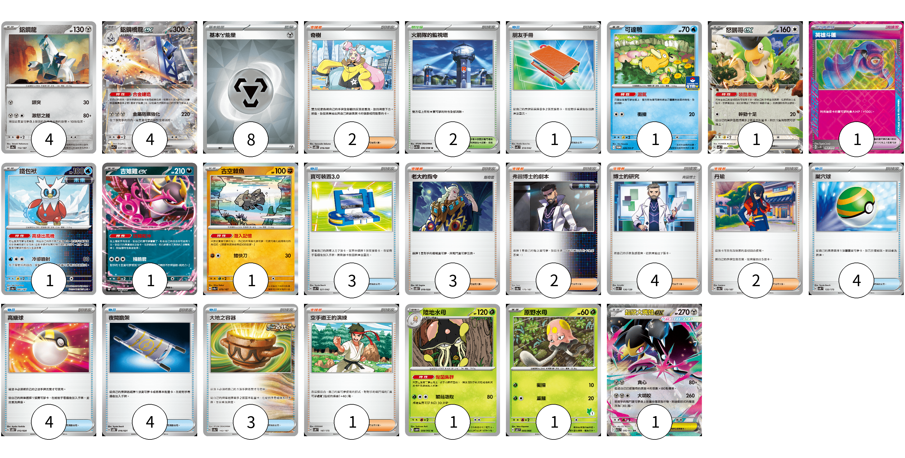 牌組構築方案 以此牌組為基礎新構築牌組 顯示卡面 顯示列表 寶可夢卡(16) 4 4 1 1 1 1 1 1 1 1 寶可夢道具(1) 1 物品卡(19) 1 3 4 4 4 3 支援者卡(14) 2 3 2 4 2 1 競技場卡(2) 2 能量卡(8) 8 寶可夢卡(16) 卡牌名稱 張數 卡牌名稱 張數 鋁鋼龍 SV8a 112/187 04 鋁鋼橋龍ex SV7a 037/064 04 可達鴨 SV-P 220/SV-P 01 怒鸚哥ex SVK 006/042 01 鐵包袱 SV8a 047/187 01 吉雉雞ex SVOD 004/020 01 古空棘魚 SV8a 079/187 01 陸地水母 SV4M 008/066 01 原野水母 SVI 005/066 01 超級大嘴娃ex M1L 046/063 01 寶可夢道具(1) 卡牌名稱 張數 卡牌名稱 張數 英雄斗篷 SV5M 064/071 01 物品卡(19) 卡牌名稱 張數 卡牌名稱 張數 朋友手冊 SVK 014/042 01 寶可裝置3.0 SVK 021/042 03 巢穴球 SVM 133/175 04 高級球 SVOD 012/020 04 夜間擔架 SVOM 016/021 04 大地之容器 SV8a 143/187 03 支援者卡(14) 卡牌名稱 張數 卡牌名稱 張數 奇樹 SVOD 016/020 02 老大的指令 SVOD 019/020 03 弗圖博士的劇本 SV8a 175/187 02 博士的研究(弗圖博士) SVD 136/139 04 丹瑜 SV8a 170/187 02 空手道王的演練 SVM 147/175 01 競技場卡(2) 卡牌名稱 張數 卡牌名稱 張數 火箭隊的監視塔 SV10 096/098 02 能量卡(8) 卡牌名稱 張數 卡牌名稱 張數 基本【鋼】能量 SVOD MET 08 以此牌組為基礎新構築牌組 牌組編碼 orkUGM-KBnsiG-EibVsh copy 列印牌組單 牌組編碼已複製 分享至SNS