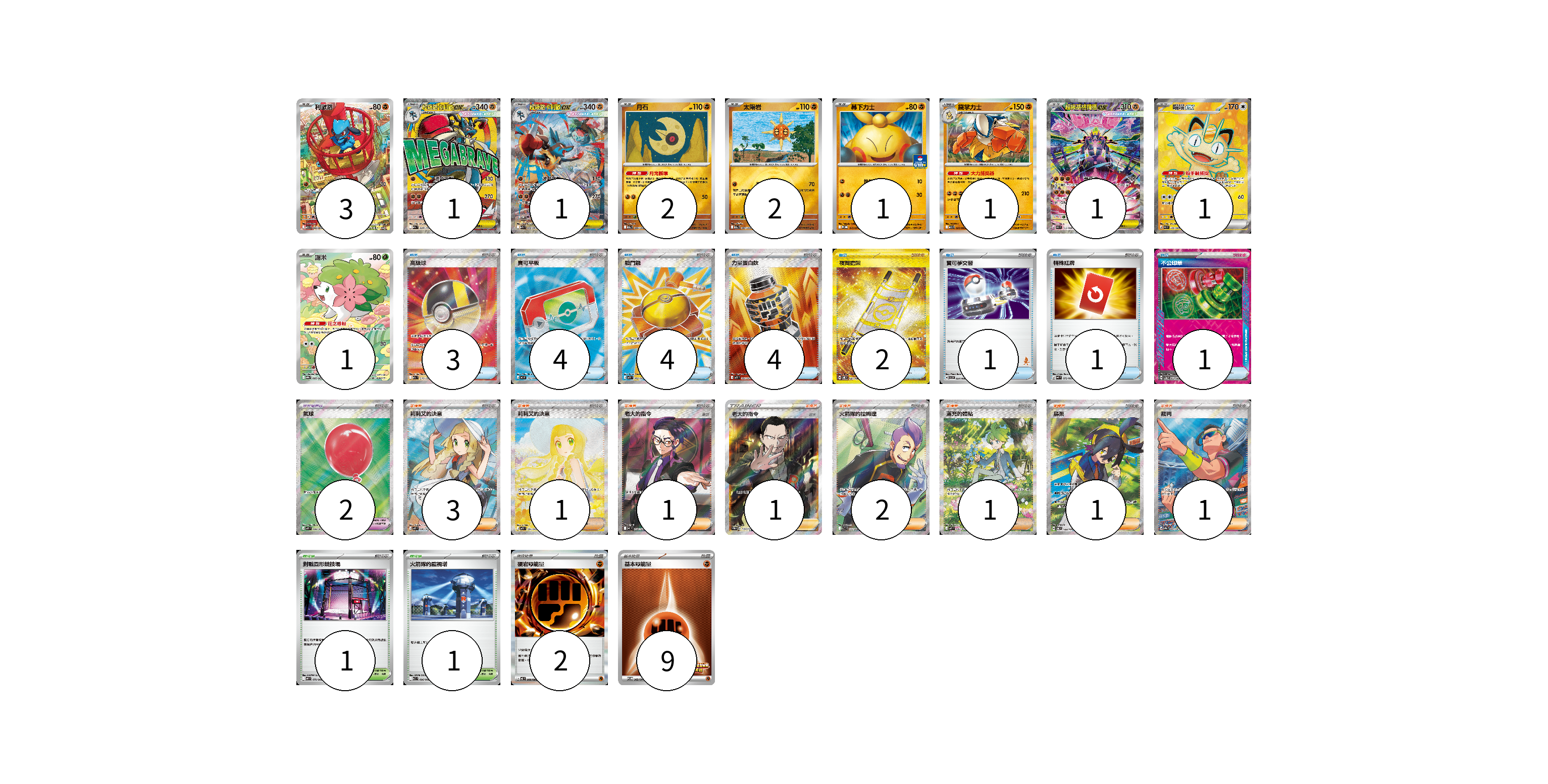牌組構築方案 以此牌組為基礎新構築牌組 顯示卡面 顯示列表 寶可夢卡(14) 3 1 1 2 2 1 1 1 1 1 寶可夢道具(2) 2 物品卡(20) 3 4 4 4 2 1 1 1 支援者卡(11) 3 1 1 1 2 1 1 1 競技場卡(2) 1 1 能量卡(11) 2 9 寶可夢卡(14) 卡牌名稱 張數 卡牌名稱 張數 利歐路 M1L 068/063 03 超級路卡利歐ex M2a 228/193 01 超級路卡利歐ex M1L 088/063 01 月石 M2a 086/193 02 太陽岩 M2a 087/193 02 幕下力士 M-P 015/M-P 01 鐵掌力士 M1L 025/063 01 超級基格爾德ex M3 113/080 01 喵喵ex M3 100/080 01 謝米 SV9a 066/063 01 寶可夢道具(2) 卡牌名稱 張數 卡牌名稱 張數 氣球 M1L 084/063 02 物品卡(20) 卡牌名稱 張數 卡牌名稱 張數 高級球 M2a 216/193 03 寶可平板 M3 103/080 04 戰鬥鑼 M1L 082/063 04 力量蛋白飲 M1L 081/063 04 夜間擔架 SV8 137/106 02 寶可夢交替 SVI 054/066 01 特殊紅牌 M4 072/083 01 不公印章 SV5a 053/066 01 支援者卡(11) 卡牌名稱 張數 卡牌名稱 張數 莉莉艾的決意 M1L 086/063 03 莉莉艾的決意 M1L 091/063 01 老大的指令(烏羽) MC 760/742 01 老大的指令(坂木) SC1b 170/153 01 火箭隊的拉姆達 SV10 122/098 02 滿充的體貼 M1S 091/063 01 烏栗 SV6 122/101 01 裁判 SV9a 083/063 01 競技場卡(2) 卡牌名稱 張數 卡牌名稱 張數 對戰圓形競技場 M2 079/080 01 火箭隊的監視塔 SV10 096/098 01 能量卡(11) 卡牌名稱 張數 卡牌名稱 張數 硬岩【鬥】能量 M3 080/080 02 基本【鬥】能量 SV-P 262/SV-P 09 以此牌組為基礎新構築牌組 牌組編碼 otOrEs-mpqBII-HlRpmb copy 列印牌組單 牌組編碼已複製 分享至SNS