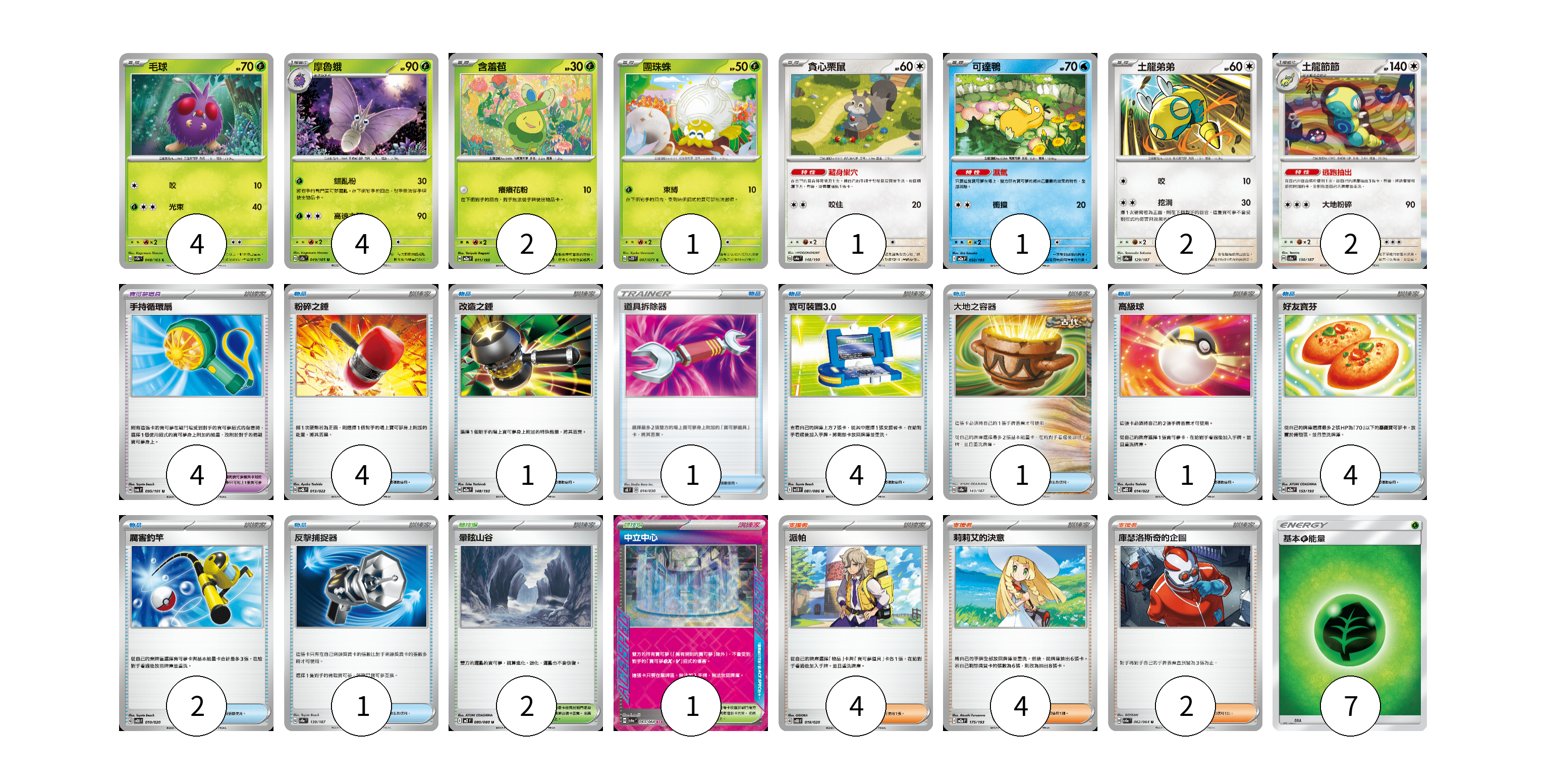 牌組構築方案 以此牌組為基礎新構築牌組 顯示卡面 顯示列表 寶可夢卡(17) 4 4 2 1 1 1 2 2 寶可夢道具(4) 4 物品卡(19) 4 1 1 4 1 1 4 2 1 支援者卡(10) 4 4 2 競技場卡(3) 2 1 能量卡(7) 7 寶可夢卡(17) 卡牌名稱 張數 卡牌名稱 張數 毛球 SV2a 048/165 04 摩魯蛾 SV2a 049/165 04 含羞苞 M2a 011/193 02 團珠蛛 SV2D 007/071 01 貪心栗鼠 SV4a 148/190 01 可達鴨 M2a 032/193 01 土龍弟弟 SV8a 129/187 02 土龍節節 SV8a 130/187 02 寶可夢道具(4) 卡牌名稱 張數 卡牌名稱 張數 手持循環扇 SV6 095/101 04 物品卡(19) 卡牌名稱 張數 卡牌名稱 張數 粉碎之錘 SVQL 013/022 04 改造之錘 M2a 148/193 01 道具拆除器 SK 014/030 01 寶可裝置3.0 SV11B 081/086 04 大地之容器 SV8a 143/187 01 高級球 MBD 014/022 01 好友寶芬 M2a 153/193 04 厲害釣竿 SVOD 010/020 02 反擊捕捉器 SV8a 139/187 01 支援者卡(10) 卡牌名稱 張數 卡牌名稱 張數 派帕 SVOD 018/020 04 莉莉艾的決意 M2a 175/193 04 庫瑟洛斯奇的企圖 SV6a 062/064 02 競技場卡(3) 卡牌名稱 張數 卡牌名稱 張數 暈眩山谷 M2 080/080 02 中立中心 SV6a 063/064 01 能量卡(7) 卡牌名稱 張數 卡牌名稱 張數 基本草能量 AS6D GRA 07 以此牌組為基礎新構築牌組 牌組編碼 oufyxq-vsWCQe-xsGGFv copy 列印牌組單 牌組編碼已複製 分享至SNS