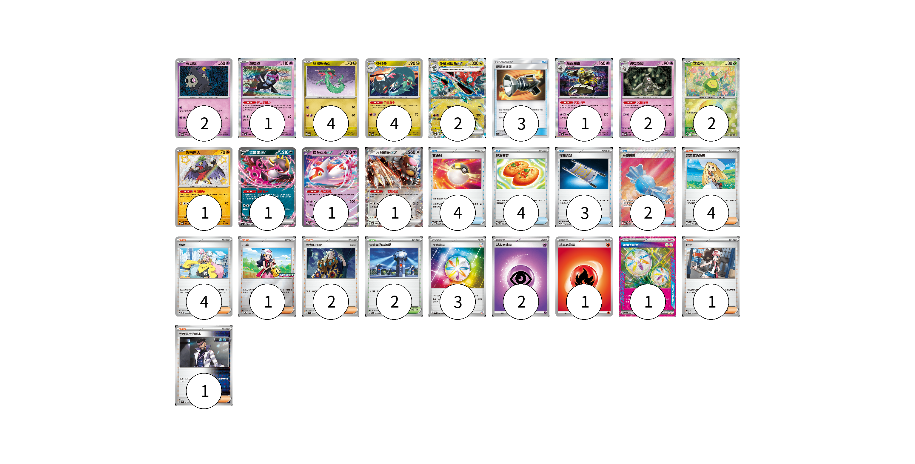 牌組構築方案 以此牌組為基礎新構築牌組 顯示卡面 顯示列表 寶可夢卡(22) 2 1 4 4 2 1 2 2 1 1 1 1 寶可夢道具(4) 4 物品卡(16) 3 4 4 3 2 支援者卡(9) 4 1 2 1 1 競技場卡(2) 2 能量卡(7) 3 2 1 1 寶可夢卡(22) 卡牌名稱 張數 卡牌名稱 張數 夜巡靈 SV8a 064/187 02 願增猿 SV8a 075/187 01 多龍梅西亞 SV8a 118/187 04 多龍奇 SV8a 119/187 04 多龍巴魯托ex SV8a 120/187 02 黑夜魔靈 SV8a 066/187 01 彷徨夜靈 SV8a 065/187 02 含羞苞 SV8a 001/187 02 摔角鷹人 SV4a 282/190 01 吉雉雞ex SVOD 004/020 01 拉帝亞斯ex MBD 003/022 01 月月熊 赫月ex SV8a 134/187 01 寶可夢道具(4) 卡牌名稱 張數 卡牌名稱 張數 奇樹 SVTL 018/021 04 物品卡(16) 卡牌名稱 張數 卡牌名稱 張數 反擊捕捉器 AC1a 130/158 03 高級球 SVQP 015/023 04 好友寶芬 MBD 013/022 04 夜間擔架 SVOM 016/021 03 神奇糖果 M1S 082/063 02 支援者卡(9) 卡牌名稱 張數 卡牌名稱 張數 莉莉艾的決意 MBG 022/022 04 小光 M-P 028/M-P 01 老大的指令 SVM 172/175 02 鬥子 SV11W 085/086 01 弗圖博士的劇本 SV8a 175/187 01 競技場卡(2) 卡牌名稱 張數 卡牌名稱 張數 火箭隊的監視塔 SV10 096/098 02 能量卡(7) 卡牌名稱 張數 卡牌名稱 張數 夜光能量 SVK 042/042 03 基本【超】能量 MBD PSY 02 基本【火】能量 SVD FIR 01 新衝天能量 SV5K 071/071 01 以此牌組為基礎新構築牌組 牌組編碼 oxLRMu-olDzmh-jpLQbe copy 列印牌組單 牌組編碼已複製 分享至SNS