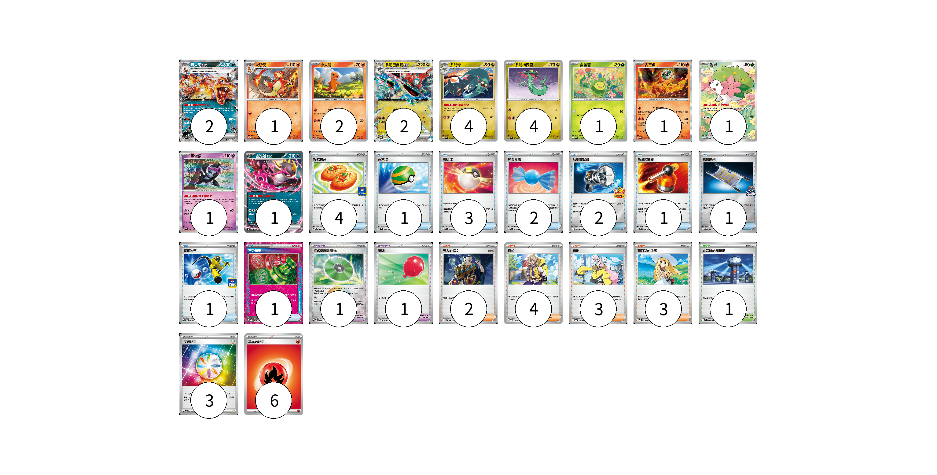 牌組構築方案 以此牌組為基礎新構築牌組 顯示卡面 顯示列表 寶可夢卡(20) 2 1 2 2 4 4 1 1 1 1 1 寶可夢道具(2) 1 1 物品卡(16) 4 1 3 2 2 1 1 1 1 支援者卡(12) 2 4 3 3 競技場卡(1) 1 能量卡(9) 3 6 寶可夢卡(20) 卡牌名稱 張數 卡牌名稱 張數 噴火龍ex SV4a 115/190 02 火恐龍 M2 012/080 01 小火龍 SVTL 001/021 02 多龍巴魯托ex SV8a 120/187 02 多龍奇 SV8a 119/187 04 多龍梅西亞 SV8a 118/187 04 含羞苞 SV8a 001/187 01 古玉魚 SV8a 025/187 01 謝米 SV9a 066/063 01 願增猿 SV8a 075/187 01 吉雉雞ex SVOM 009/021 01 寶可夢道具(2) 卡牌名稱 張數 卡牌名稱 張數 招式學習器 演進 SV8a 160/187 01 氣球 MBD 018/022 01 物品卡(16) 卡牌名稱 張數 卡牌名稱 張數 好友寶芬 SV-P 212/SV-P 04 巢穴球 SVM 133/175 01 高級球 MBD 014/022 03 神奇糖果 MBG 013/022 02 反擊捕捉器 SV-P 083/SV-P 02 高溫燃燒器 M2 074/080 01 夜間擔架 SV-P 204/SV-P 01 厲害釣竿 SV-P 112/SV-P 01 不公印章 SV5a 053/066 01 支援者卡(12) 卡牌名稱 張數 卡牌名稱 張數 老大的指令 MBD 020/022 02 派帕 SVOD 018/020 04 奇樹 SVOD 016/020 03 莉莉艾的決意 MBD 021/022 03 競技場卡(1) 卡牌名稱 張數 卡牌名稱 張數 火箭隊的監視塔 SV10 096/098 01 能量卡(9) 卡牌名稱 張數 卡牌名稱 張數 夜光能量 SVK 042/042 03 基本火能量 sv-p FIR 06 以此牌組為基礎新構築牌組 牌組編碼 oxvJVH-vXAwqM-YBbDxy copy 列印牌組單 牌組編碼已複製 分享至SNS