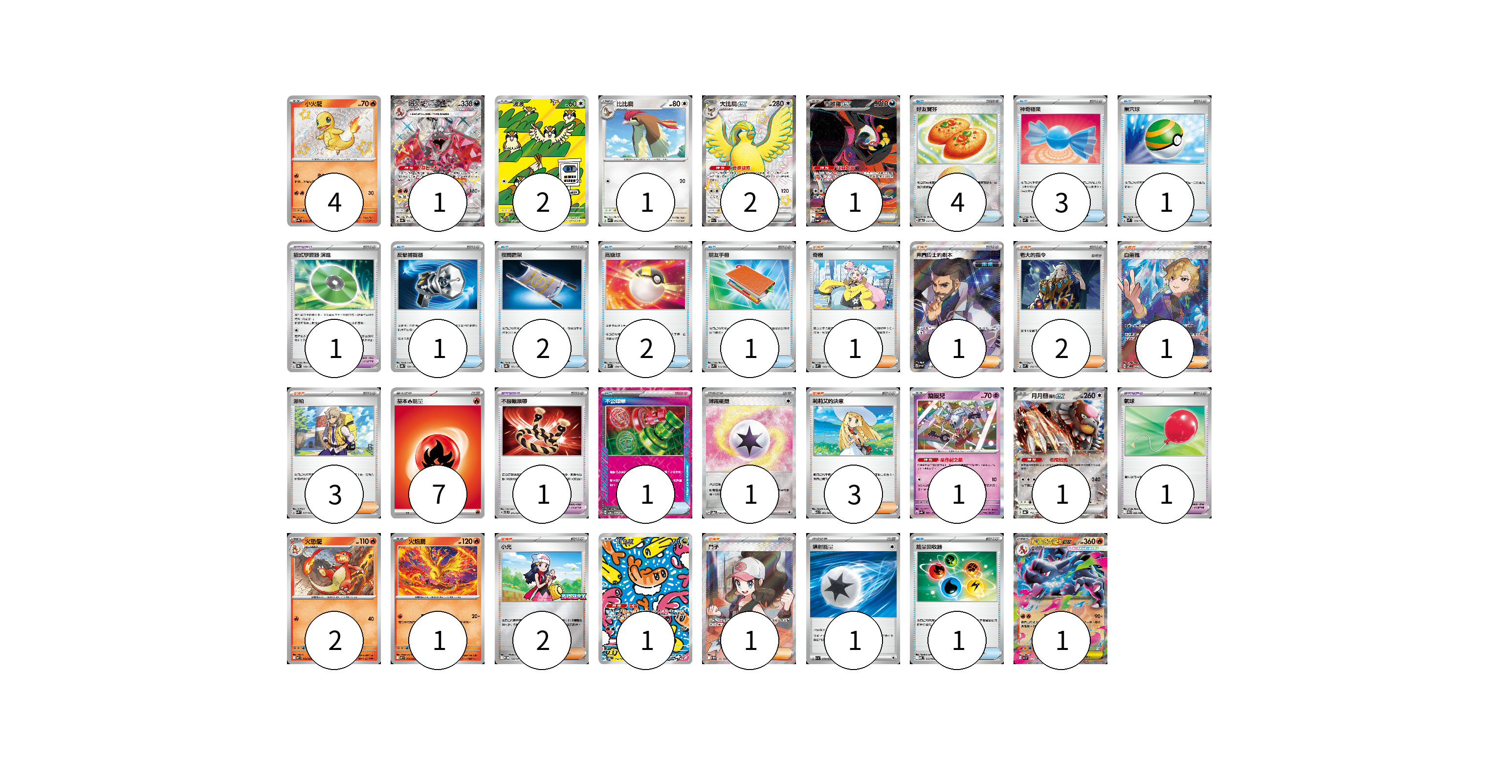 牌組構築方案 以此牌組為基礎新構築牌組 顯示卡面 顯示列表 寶可夢卡(18) 4 1 2 1 2 1 1 1 2 1 1 1 寶可夢道具(3) 1 1 1 物品卡(16) 4 3 1 1 2 2 1 1 1 支援者卡(14) 1 1 2 1 3 3 2 1 能量卡(9) 7 1 1 寶可夢卡(18) 卡牌名稱 張數 卡牌名稱 張數 小火龍 SV4a 210/190 04 噴火龍ex SV4a 331/190 01 波波 SV3 118/108 02 比比鳥 SVK 004/042 01 大比鳥ex SV4a 335/190 02 吉雉雞ex SV6a 089/064 01 鑰圈兒 SV4a 087/190 01 月月熊 赫月ex SV8a 134/187 01 火恐龍 M2 012/080 02 火焰鳥 M2 014/080 01 米立龍 SV6 112/101 01 超級噴火龍Xex M2 013/080 01 寶可夢道具(3) 卡牌名稱 張數 卡牌名稱 張數 招式學習器 演進 SV8a 160/187 01 不服輸頭帶 SVTL 016/021 01 氣球 SV11B 082/086 01 物品卡(16) 卡牌名稱 張數 卡牌名稱 張數 好友寶芬 SV8a 147/187 04 神奇糖果 SVM 135/175 03 巢穴球 SVM 133/175 01 反擊捕捉器 SV8a 139/187 01 夜間擔架 SV8a 151/187 02 高級球 SVM 134/175 02 朋友手冊 SVK 014/042 01 不公印章 SV5a 053/066 01 能量回收器 MBD 012/022 01 支援者卡(14) 卡牌名稱 張數 卡牌名稱 張數 奇樹 SVM 160/175 01 弗圖博士的劇本 SV4M 086/066 01 老大的指令 SVM 172/175 02 白蕾雅 SV7 126/102 01 派帕 SVK 035/042 03 莉莉艾的決意 M1L 062/063 03 小光 M-P 028/M-P 02 鬥子 SV11W 166/086 01 能量卡(9) 卡牌名稱 張數 卡牌名稱 張數 基本火能量 sv-p FIR 07 薄霧能量 SV8a 186/187 01 噴射能量 SV1a 072/073 01 以此牌組為基礎新構築牌組 牌組編碼 oyUzkA-DMwhgI-SZattZ copy 列印牌組單 牌組編碼已複製 分享至SNS