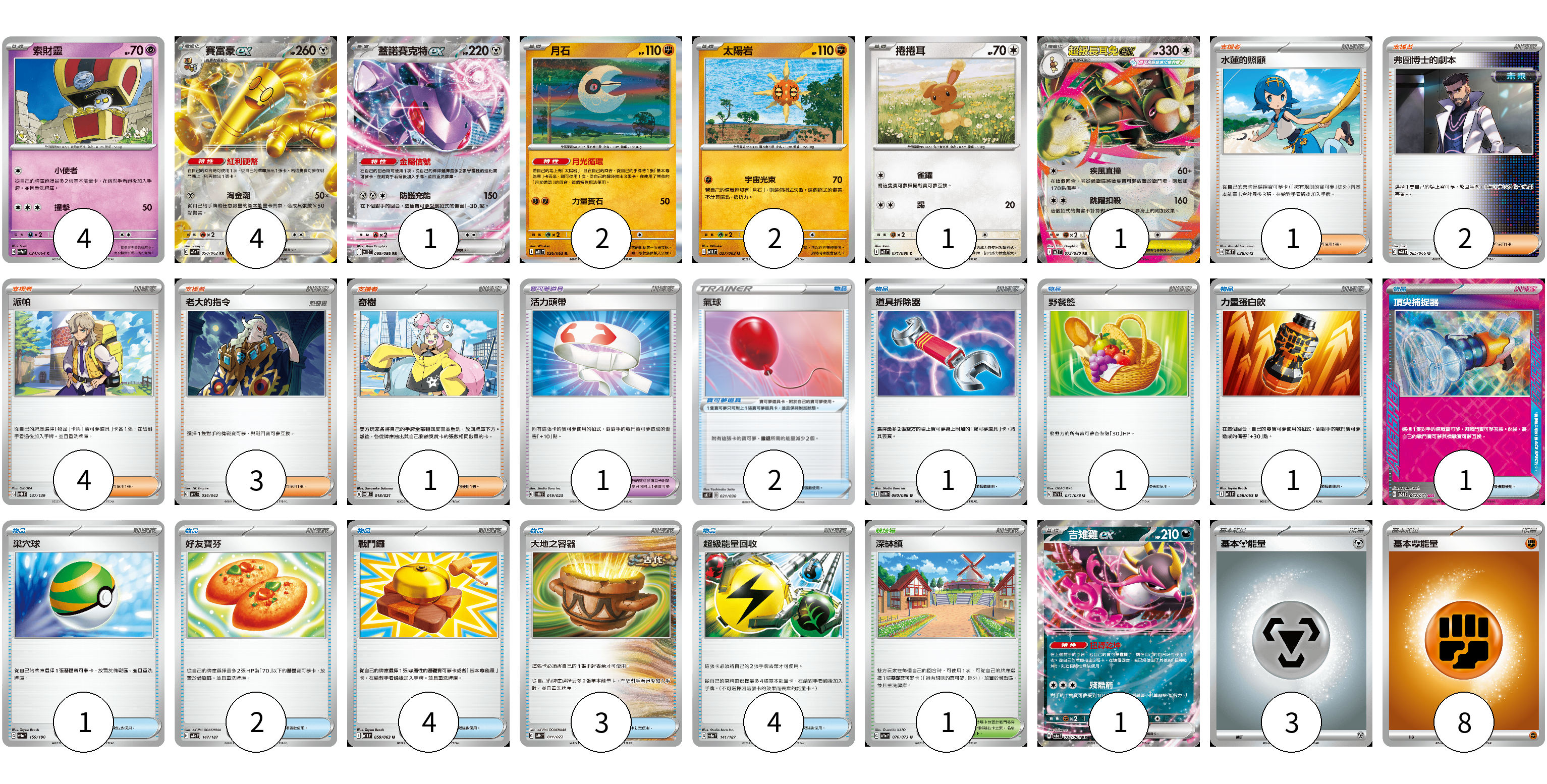 牌組構築方案 以此牌組為基礎新構築牌組 顯示卡面 顯示列表 寶可夢卡(16) 4 4 1 2 2 1 1 1 寶可夢道具(3) 1 2 物品卡(18) 1 1 1 1 1 2 4 3 4 支援者卡(11) 1 2 4 3 1 競技場卡(1) 1 能量卡(11) 3 8 寶可夢卡(16) 卡牌名稱 張數 卡牌名稱 張數 索財靈 SV7a 024/064 04 賽富豪ex SV3a 050/062 04 蓋諾賽克特ex SV11B 069/086 01 月石 M1L 026/063 02 太陽岩 M1L 027/063 02 捲捲耳 M2 071/080 01 超級長耳兔ex M2 072/080 01 吉雉雞ex SV6a 038/064 01 寶可夢道具(3) 卡牌名稱 張數 卡牌名稱 張數 活力頭帶 SVAW 019/023 01 氣球 SK 021/030 02 物品卡(18) 卡牌名稱 張數 卡牌名稱 張數 道具拆除器 SV11W 080/086 01 野餐籃 SV1V 071/078 01 力量蛋白飲 M1L 058/063 01 頂尖捕捉器 SV5M 062/071 01 巢穴球 SV4a 159/190 01 好友寶芬 SV8a 147/187 02 戰鬥鑼 M1L 059/063 04 大地之容器 SVHK 011/022 03 超級能量回收 SV8a 141/187 04 支援者卡(11) 卡牌名稱 張數 卡牌名稱 張數 水蓮的照顧 SVK 028/042 01 弗圖博士的劇本 SV4M 065/066 02 派帕 SVD 137/139 04 老大的指令 SVK 036/042 03 奇樹 SVOM 018/021 01 競技場卡(1) 卡牌名稱 張數 卡牌名稱 張數 深缽鎮 SV1a 070/073 01 能量卡(11) 卡牌名稱 張數 卡牌名稱 張數 基本【鋼】能量 M-P MET 03 基本【鬥】能量 M-P FIG 08 以此牌組為基礎新構築牌組 牌組編碼 oyzecf-jnKDkr-LZIkTp copy 列印牌組單 牌組編碼已複製 分享至SNS