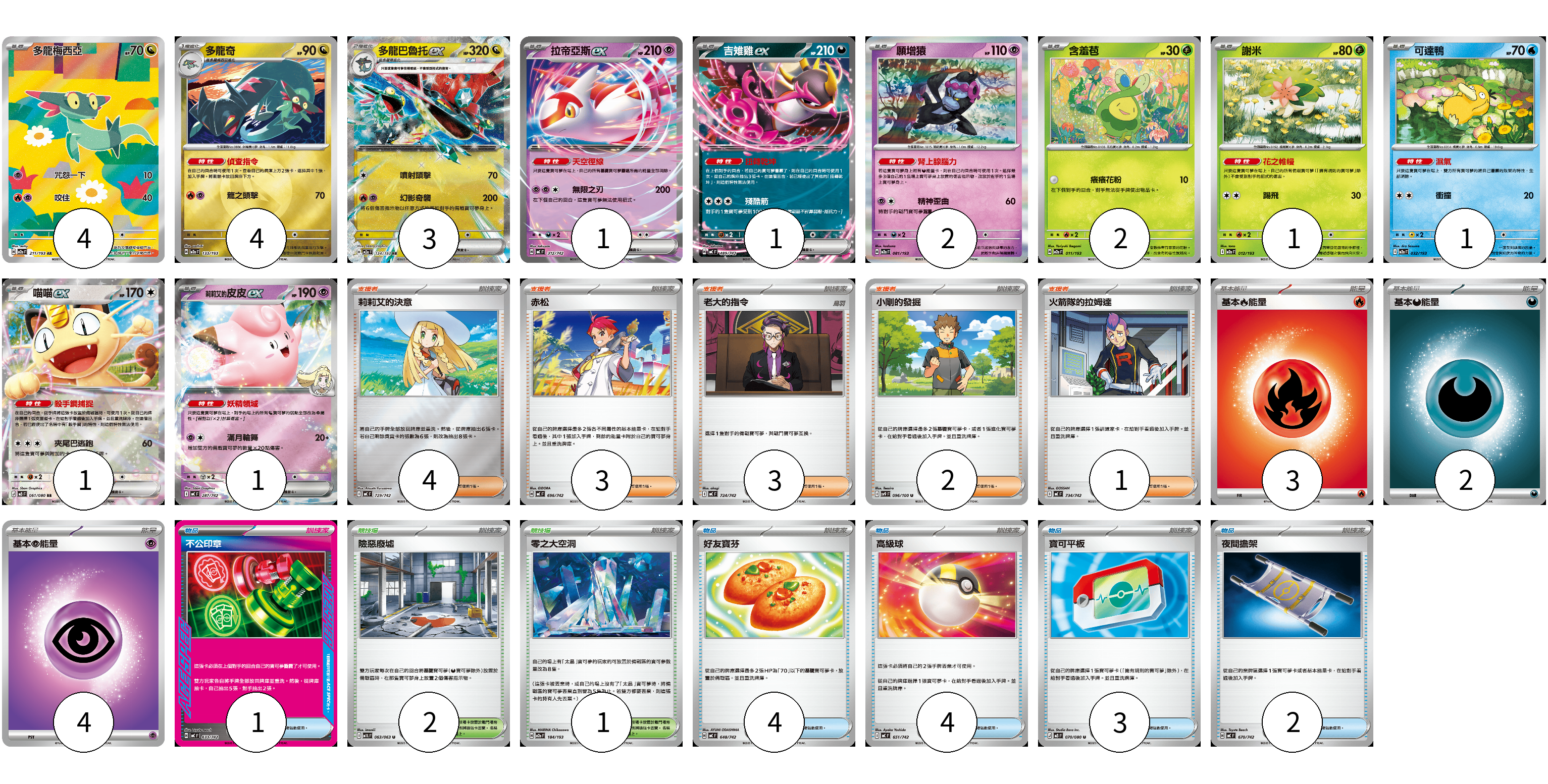 牌組構築方案 以此牌組為基礎新構築牌組 顯示卡面 顯示列表 寶可夢卡(21) 4 4 3 1 1 2 2 1 1 1 1 物品卡(14) 1 4 4 3 2 支援者卡(13) 4 3 3 2 1 競技場卡(3) 2 1 能量卡(9) 3 2 4 寶可夢卡(21) 卡牌名稱 張數 卡牌名稱 張數 多龍梅西亞 M2a 211/193 04 多龍奇 M2a 133/193 04 多龍巴魯托ex M2a 134/193 03 拉帝亞斯ex MC 312/742 01 吉雉雞ex MC 489/742 01 願增猿 M2a 081/193 02 含羞苞 M2a 011/193 02 謝米 M2a 012/193 01 可達鴨 M2a 032/193 01 喵喵ex M3 061/080 01 莉莉艾的皮皮ex MC 287/742 01 物品卡(14) 卡牌名稱 張數 卡牌名稱 張數 不公印章 MC 633/742 01 好友寶芬 MC 648/742 04 高級球 MC 651/742 04 寶可平板 M3 070/080 03 夜間擔架 MC 670/742 02 支援者卡(13) 卡牌名稱 張數 卡牌名稱 張數 莉莉艾的決意 MC 729/742 04 赤松 MC 696/742 03 老大的指令 MC 724/742 03 小剛的發掘 SV9 096/100 02 火箭隊的拉姆達 MC 734/742 01 競技場卡(3) 卡牌名稱 張數 卡牌名稱 張數 險惡廢墟 M1L 063/063 02 零之大空洞 M2a 184/193 01 能量卡(9) 卡牌名稱 張數 卡牌名稱 張數 基本【火】能量 MC FIR 03 基本【惡】能量 MC DAR 02 基本【超】能量 M-P PSY 04 以此牌組為基礎新構築牌組 牌組編碼 pAROno-tVPpcd-sOImWo copy 列印牌組單 牌組編碼已複製 分享至SNS