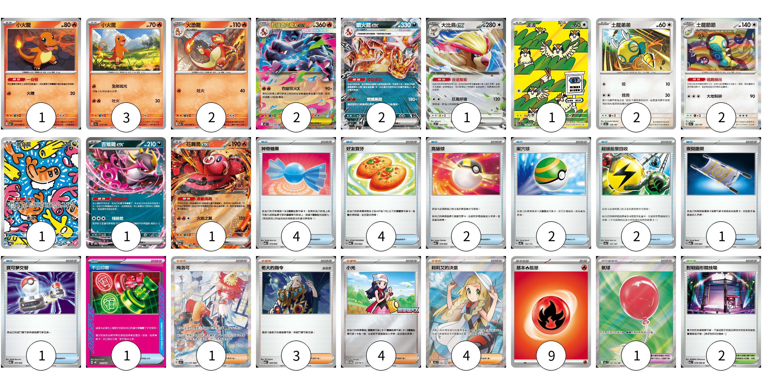 牌組構築方案 以此牌組為基礎新構築牌組 顯示卡面 顯示列表 寶可夢卡(19) 1 3 2 2 2 1 1 2 2 1 1 1 寶可夢道具(1) 1 物品卡(17) 4 4 2 2 2 1 1 1 支援者卡(12) 1 3 4 4 競技場卡(2) 2 能量卡(9) 9 寶可夢卡(19) 卡牌名稱 張數 卡牌名稱 張數 小火龍 M2 011/080 01 小火龍 SV4a 025/190 03 火恐龍 M2 012/080 02 超級噴火龍Xex M2 013/080 02 噴火龍ex SVTL 006/021 02 大比鳥ex SVK 005/042 01 波波 SV3 118/108 01 土龍弟弟 SV8a 129/187 02 土龍節節 SV8a 130/187 02 米立龍 SV6 112/101 01 吉雉雞ex SVOD 004/020 01 花舞鳥ex M2 018/080 01 寶可夢道具(1) 卡牌名稱 張數 卡牌名稱 張數 氣球 M1L 084/063 01 物品卡(17) 卡牌名稱 張數 卡牌名稱 張數 神奇糖果 MBG 013/022 04 好友寶芬 MBD 013/022 04 高級球 MBD 014/022 02 巢穴球 SVM 133/175 02 超級能量回收 SV8a 141/187 02 夜間擔架 MBD 016/022 01 寶可夢交替 MBG 015/022 01 不公印章 MBD 011/022 01 支援者卡(12) 卡牌名稱 張數 卡牌名稱 張數 梅洛可 SV4K 092/066 01 老大的指令 MBD 020/022 03 小光 M-P 028/M-P 04 莉莉艾的決意 M1L 086/063 04 競技場卡(2) 卡牌名稱 張數 卡牌名稱 張數 對戰圓形競技場 M2 079/080 02 能量卡(9) 卡牌名稱 張數 卡牌名稱 張數 基本火能量 sv-p FIR 09 以此牌組為基礎新構築牌組 牌組編碼 pCUPuf-VPoWIl-WqPnIt copy 列印牌組單 牌組編碼已複製 分享至SNS