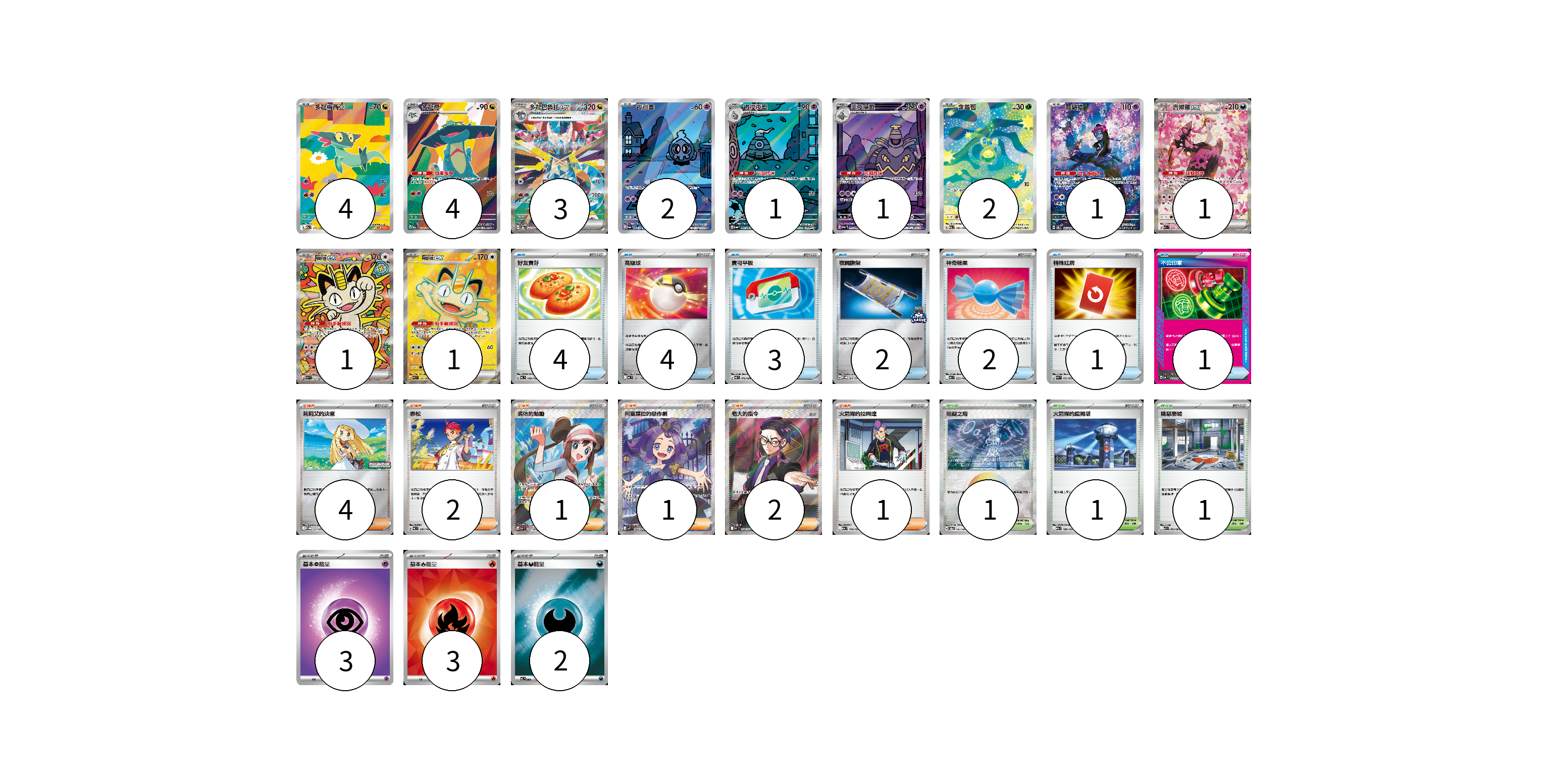 牌組構築方案 以此牌組為基礎新構築牌組 顯示卡面 顯示列表 寶可夢卡(21) 4 4 3 2 1 1 2 1 1 1 1 物品卡(17) 4 4 3 2 2 1 1 支援者卡(11) 4 2 1 1 2 1 競技場卡(3) 1 1 1 能量卡(8) 3 3 2 寶可夢卡(21) 卡牌名稱 張數 卡牌名稱 張數 多龍梅西亞 M2a 211/193 04 多龍奇 M2a 212/193 04 多龍巴魯托ex SV8a 221/187 03 夜巡靈 SV6a 068/064 02 彷徨夜靈 SV6a 069/064 01 黑夜魔靈 SV6a 070/064 01 含羞苞 M2a 196/193 02 願增猿 SV6 107/101 01 吉雉雞ex M2a 244/193 01 喵喵ex M3 114/080 01 喵喵ex M3 100/080 01 物品卡(17) 卡牌名稱 張數 卡牌名稱 張數 好友寶芬 MC 648/742 04 高級球 MC 651/742 04 寶可平板 M3 070/080 03 夜間擔架 SV-P 204/SV-P 02 神奇糖果 MC 655/742 02 特殊紅牌 M4 072/083 01 不公印章 MC 633/742 01 支援者卡(11) 卡牌名稱 張數 卡牌名稱 張數 莉莉艾的決意 M-P 011/M-P 04 赤松 MC 696/742 02 鳴依的勉勵 M3 107/080 01 阿塞蘿拉的惡作劇 M1S 084/063 01 老大的指令(烏羽) MC 760/742 02 火箭隊的拉姆達 M2a 179/193 01 競技場卡(3) 卡牌名稱 張數 卡牌名稱 張數 阻礙之塔 SV8a 181/187 01 火箭隊的監視塔 M2a 189/193 01 險惡廢墟 M1L 063/063 01 能量卡(8) 卡牌名稱 張數 卡牌名稱 張數 基本【超】能量 M-P PSY 03 基本【火】能量 SVQL FIR 03 基本【惡】能量 MC DAR 02 以此牌組為基礎新構築牌組 牌組編碼 pCgeAd-NYCHZr-maUrgu copy 列印牌組單 牌組編碼已複製 分享至SNS