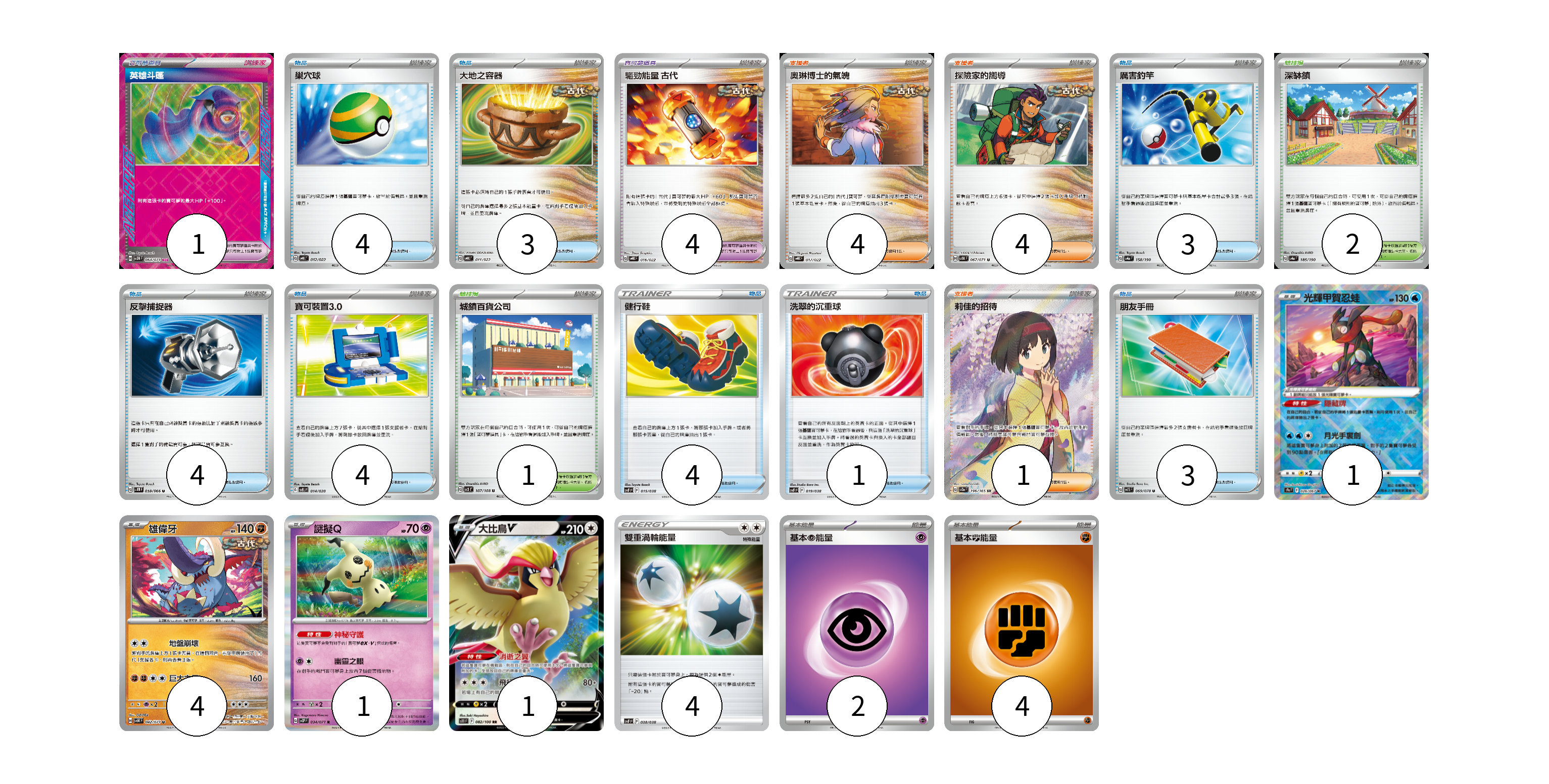 牌組構築方案 以此牌組為基礎新構築牌組 顯示卡面 顯示列表 寶可夢卡(7) 1 4 1 1 寶可夢道具(5) 1 4 物品卡(26) 4 3 3 4 4 4 1 3 支援者卡(9) 4 4 1 競技場卡(3) 2 1 能量卡(10) 4 2 4 寶可夢卡(7) 卡牌名稱 張數 卡牌名稱 張數 光輝甲賀忍蛙 S9a 026/067 01 雄偉牙 SV5K 042/071 04 謎擬Q SV2P 034/071 01 大比鳥V S11 082/100 01 寶可夢道具(5) 卡牌名稱 張數 卡牌名稱 張數 英雄斗篷 SV5M 064/071 01 驅勁能量 古代 SVHK 016/022 04 物品卡(26) 卡牌名稱 張數 卡牌名稱 張數 巢穴球 SVHK 012/022 04 大地之容器 SVHK 011/022 03 厲害釣竿 SV4a 158/190 03 反擊捕捉器 SV4M 059/066 04 寶可裝置3.0 SVEL 014/020 04 健行鞋 SVF 015/038 04 洗翠的沉重球 SVF 019/038 01 朋友手冊 SV1S 069/078 03 支援者卡(9) 卡牌名稱 張數 卡牌名稱 張數 奧琳博士的氣魄 SVHK 017/022 04 探險家的嚮導 SV5K 067/071 04 莉佳的招待[支援者] SV2a 196/165 01 競技場卡(3) 卡牌名稱 張數 卡牌名稱 張數 深缽鎮 SV4a 185/190 02 城鎮百貨公司 SV3 107/108 01 能量卡(10) 卡牌名稱 張數 卡牌名稱 張數 雙重渦輪能量 SVF 038/038 04 基本【超】能量 SVHM PSY 02 基本【鬥】能量 SVHK FIG 04 以此牌組為基礎新構築牌組 牌組編碼 pEVjAw-IYAVHs-ljABhV copy 列印牌組單 牌組編碼已複製 分享至SNS