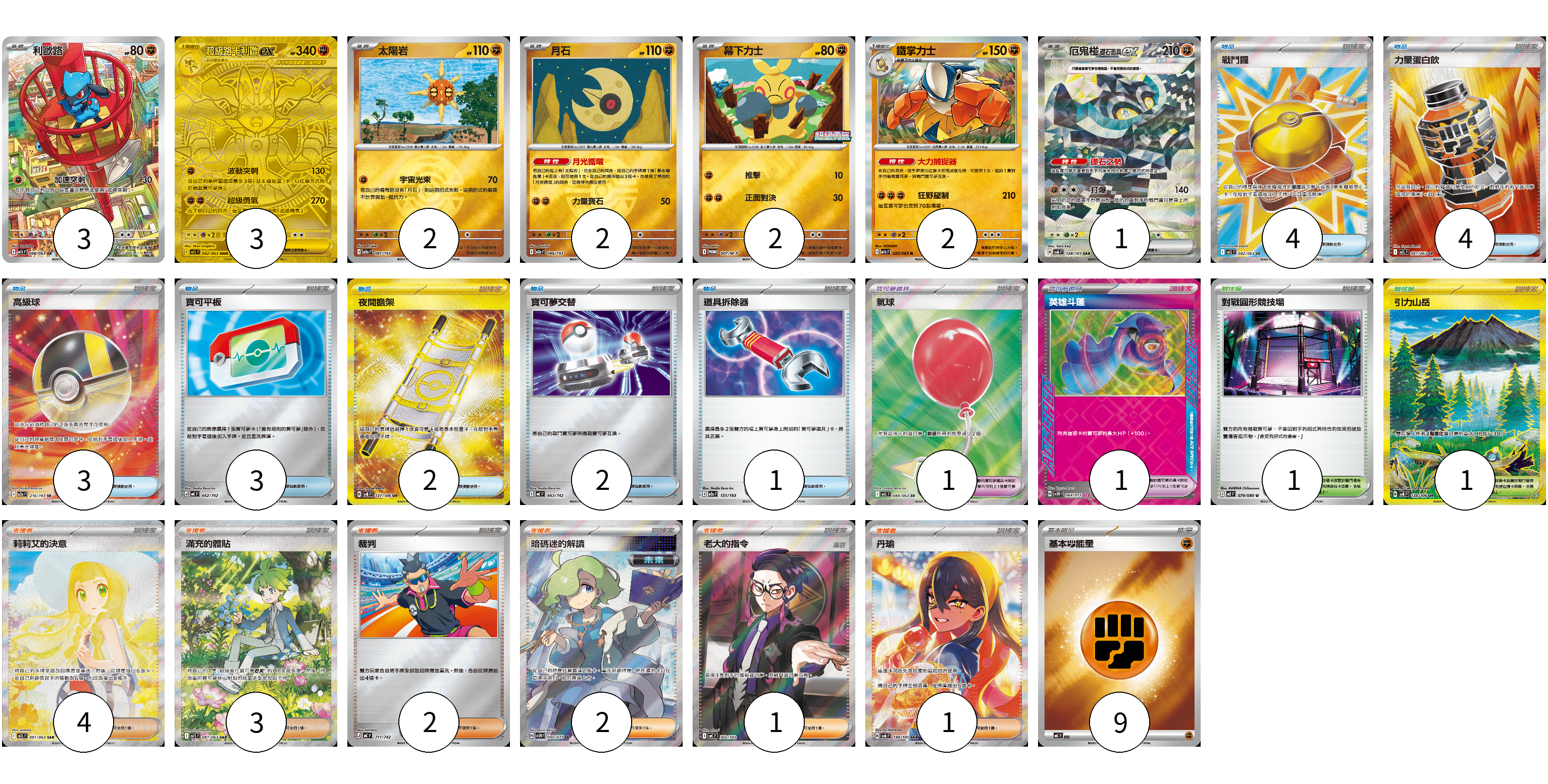 牌組構築方案 以此牌組為基礎新構築牌組 顯示卡面 顯示列表 寶可夢卡(15) 3 3 2 2 2 2 1 寶可夢道具(2) 1 1 物品卡(19) 4 4 3 3 2 2 1 支援者卡(13) 4 3 2 2 1 1 競技場卡(2) 1 1 能量卡(9) 9 寶可夢卡(15) 卡牌名稱 張數 卡牌名稱 張數 利歐路 M1L 068/063 03 超級路卡利歐ex M1L 092/063 03 太陽岩 M2a 087/193 02 月石 M2a 086/193 02 幕下力士 M-P 007/M-P 02 鐵掌力士 M1L 025/063 02 厄鬼椪 礎石面具ex SV6 128/101 01 寶可夢道具(2) 卡牌名稱 張數 卡牌名稱 張數 氣球 M1L 084/063 01 英雄斗篷 SV5M 064/071 01 物品卡(19) 卡牌名稱 張數 卡牌名稱 張數 戰鬥鑼 M1L 082/063 04 力量蛋白飲 M1L 081/063 04 高級球 M2a 216/193 03 寶可平板 MC 662/742 03 夜間擔架 SV8 137/106 02 寶可夢交替 MC 663/742 02 道具拆除器 M2a 151/193 01 支援者卡(13) 卡牌名稱 張數 卡牌名稱 張數 莉莉艾的決意 M1L 091/063 04 滿充的體貼 M1S 091/063 03 裁判 MC 711/742 02 暗碼迷的解讀 SV5M 090/071 02 老大的指令(烏羽) MC 760/742 01 丹瑜 SV6 130/101 01 競技場卡(2) 卡牌名稱 張數 卡牌名稱 張數 對戰圓形競技場 M2 079/080 01 引力山岳 SV8 138/106 01 能量卡(9) 卡牌名稱 張數 卡牌名稱 張數 基本【鬥】能量 MC FIG 09 以此牌組為基礎新構築牌組 牌組編碼 pFxKAJ-VcGawd-uZWFcJ copy 列印牌組單 牌組編碼已複製 分享至SNS