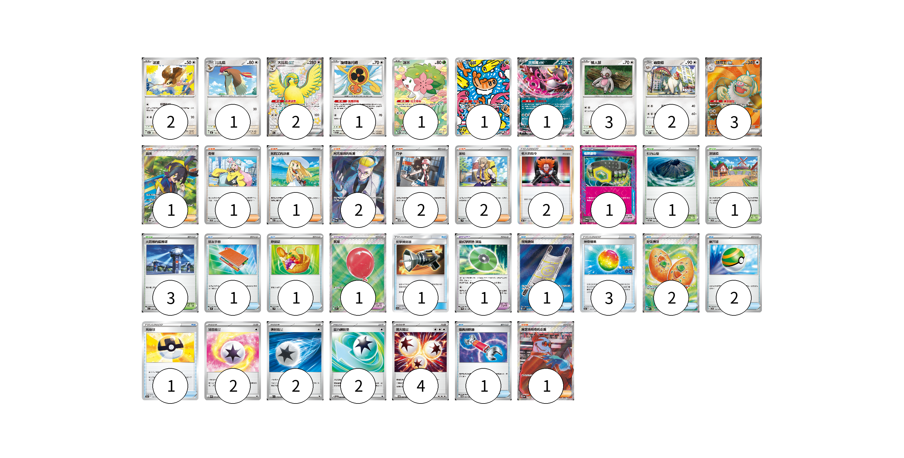 牌組構築方案 以此牌組為基礎新構築牌組 顯示卡面 顯示列表 寶可夢卡(17) 2 1 2 1 1 1 1 3 2 3 寶可夢道具(3) 1 1 1 物品卡(13) 1 1 1 1 3 2 2 1 1 支援者卡(12) 1 1 1 2 2 2 2 1 競技場卡(5) 1 1 3 能量卡(10) 2 2 2 4 寶可夢卡(17) 卡牌名稱 張數 卡牌名稱 張數 波波 SV4a 137/190 02 比比鳥 SV4a 138/190 01 大比鳥ex SV4a 335/190 02 旋轉洛托姆 SV7 080/102 01 謝米 SV9a 066/063 01 米立龍 SV6 112/101 01 吉雉雞ex SV6a 038/064 01 懶人獺 SV2P 060/071 03 過動猿 SV2P 061/071 02 請假王ex SV8 126/106 03 寶可夢道具(3) 卡牌名稱 張數 卡牌名稱 張數 極限腰帶 SV5K 066/071 01 氣球 M1L 084/063 01 招式學習器 演進 SV4M 063/066 01 物品卡(13) 卡牌名稱 張數 卡牌名稱 張數 朋友手冊 SV1S 069/078 01 野餐籃 SV1V 071/078 01 反擊捕捉器 AC1a 130/158 01 夜間擔架 M1L 083/063 01 神奇糖果 S10b 066/071 03 好友寶芬 M1S 081/063 02 巢穴球 SVF 016/038 02 高級球 S12a 138/172 01 道具拆除器 SV11W 080/086 01 支援者卡(12) 卡牌名稱 張數 卡牌名稱 張數 烏栗 SV6 122/101 01 奇樹 SVF 029/038 01 莉莉艾的決意 M1L 062/063 01 阿克羅瑪的執著 SV6a 083/064 02 鬥子 SV11W 085/086 02 派帕 SV1V 076/078 02 老大的指令(弗拉達利) S8b 158/184 02 庫瑟洛斯奇的企圖 SV6a 086/064 01 競技場卡(5) 卡牌名稱 張數 卡牌名稱 張數 引力山岳 SV8 106/106 01 深缽鎮 SVF 036/038 01 火箭隊的監視塔 SV10 096/098 03 能量卡(10) 卡牌名稱 張數 卡牌名稱 張數 薄霧能量 SV5M 071/071 02 噴射能量 SV1a 072/073 02 回力鏢能量 SV5a 066/066 02 燃火能量 SV11W 086/086 04 以此牌組為基礎新構築牌組 牌組編碼 pGnmbT-iNoRTh-KaCOow copy 列印牌組單 牌組編碼已複製 分享至SNS