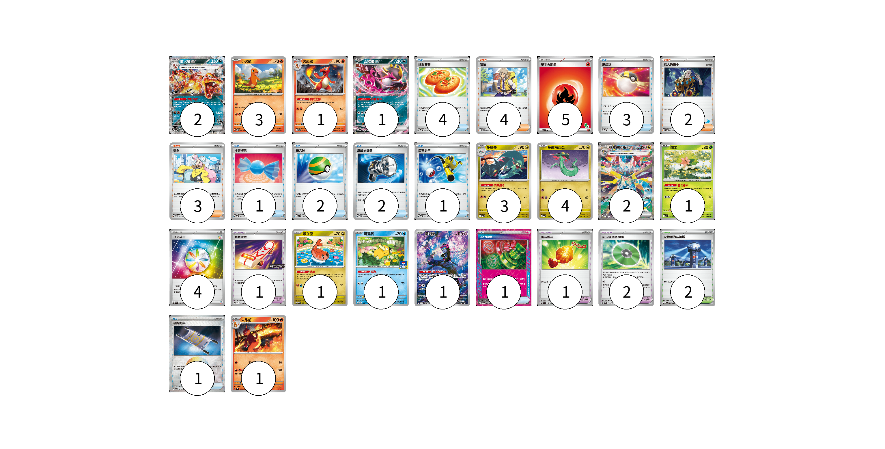 牌組構築方案 以此牌組為基礎新構築牌組 顯示卡面 顯示列表 寶可夢卡(21) 2 3 1 1 3 4 2 1 1 1 1 1 寶可夢道具(4) 1 1 2 物品卡(15) 4 3 1 2 2 1 1 1 支援者卡(9) 4 2 3 競技場卡(2) 2 能量卡(9) 5 4 寶可夢卡(21) 卡牌名稱 張數 卡牌名稱 張數 噴火龍ex SV4a 115/190 02 小火龍 SVTL 001/021 03 火恐龍 SVTL 002/021 01 吉雉雞ex SV6a 038/064 01 多龍奇 SV8a 119/187 03 多龍梅西亞 SV8a 118/187 04 多龍巴魯托ex SV8a 221/187 02 謝米 SV9a 006/063 01 米立龍 SV8a 121/187 01 可達鴨 SV-P 220/SV-P 01 願增猿 SV6 107/101 01 火恐龍 SV2a 005/165 01 寶可夢道具(4) 卡牌名稱 張數 卡牌名稱 張數 緊急滑板 SV-P 140/SV-P 01 勇氣護符 SVM 142/175 01 招式學習器 演進 SV8a 160/187 02 物品卡(15) 卡牌名稱 張數 卡牌名稱 張數 好友寶芬 SVK 015/042 04 高級球 SVHK 013/022 03 神奇糖果 SVK 019/042 01 巢穴球 SVK 016/042 02 反擊捕捉器 SVTS 009/022 02 厲害釣竿 SVK 011/042 01 不公印章 SV5a 053/066 01 夜間擔架 SV8a 151/187 01 支援者卡(9) 卡牌名稱 張數 卡牌名稱 張數 派帕 SVTM 019/022 04 老大的指令 SVI 066/066 02 奇樹 SVTG 017/019 03 競技場卡(2) 卡牌名稱 張數 卡牌名稱 張數 火箭隊的監視塔 SV10 096/098 02 能量卡(9) 卡牌名稱 張數 卡牌名稱 張數 基本【火】能量 SVI FIR 05 夜光能量 SVK 042/042 04 以此牌組為基礎新構築牌組 牌組編碼 pIirBa-ZWAofO-gwPhtw copy 列印牌組單 牌組編碼已複製 分享至SNS