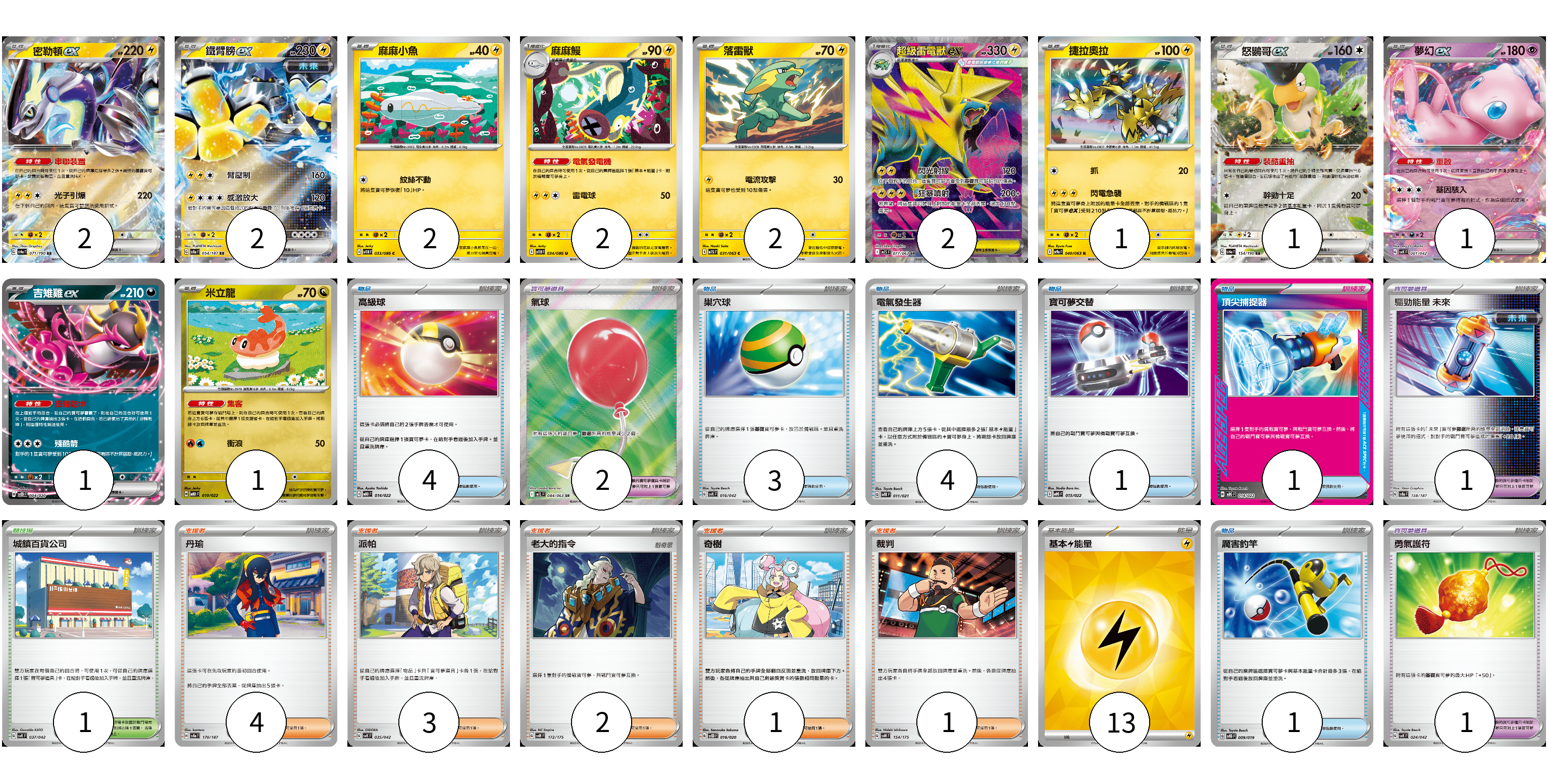 牌組構築方案 以此牌組為基礎新構築牌組 顯示卡面 顯示列表 寶可夢卡(17) 2 2 2 2 2 2 1 1 1 1 1 寶可夢道具(4) 2 1 1 物品卡(14) 4 3 4 1 1 1 支援者卡(11) 4 3 2 1 1 競技場卡(1) 1 能量卡(13) 13 寶可夢卡(17) 卡牌名稱 張數 卡牌名稱 張數 密勒頓ex SV4a 071/190 02 鐵臂膀ex SV8a 054/187 02 麻麻小魚 SV11B 033/086 02 麻麻鰻 SV11B 034/086 02 落雷獸 M1S 031/063 02 超級雷電獸ex M1S 077/063 02 捷拉奧拉 SV9a 040/063 01 怒鸚哥ex SV4a 154/190 01 夢幻ex SVK 001/042 01 吉雉雞ex SVOD 004/020 01 米立龍 MBD 010/022 01 寶可夢道具(4) 卡牌名稱 張數 卡牌名稱 張數 氣球 M1L 084/063 02 驅勁能量 未來 SV8a 158/187 01 勇氣護符 SVK 024/042 01 物品卡(14) 卡牌名稱 張數 卡牌名稱 張數 高級球 MBD 014/022 04 巢穴球 SVK 016/042 03 電氣發生器 SVTR 011/021 04 寶可夢交替 MBG 015/022 01 頂尖捕捉器 MBG 014/022 01 厲害釣竿 SVTG 009/019 01 支援者卡(11) 卡牌名稱 張數 卡牌名稱 張數 丹瑜 SV8a 170/187 04 派帕 SVK 035/042 03 老大的指令 SVM 172/175 02 奇樹 SVOD 016/020 01 裁判 SVM 154/175 01 競技場卡(1) 卡牌名稱 張數 卡牌名稱 張數 城鎮百貨公司 SVK 037/042 01 能量卡(13) 卡牌名稱 張數 卡牌名稱 張數 基本【雷】能量 SVK LIG 13 以此牌組為基礎新構築牌組 牌組編碼 pJNcWB-ublQSu-CTHemA copy 列印牌組單 牌組編碼已複製 分享至SNS